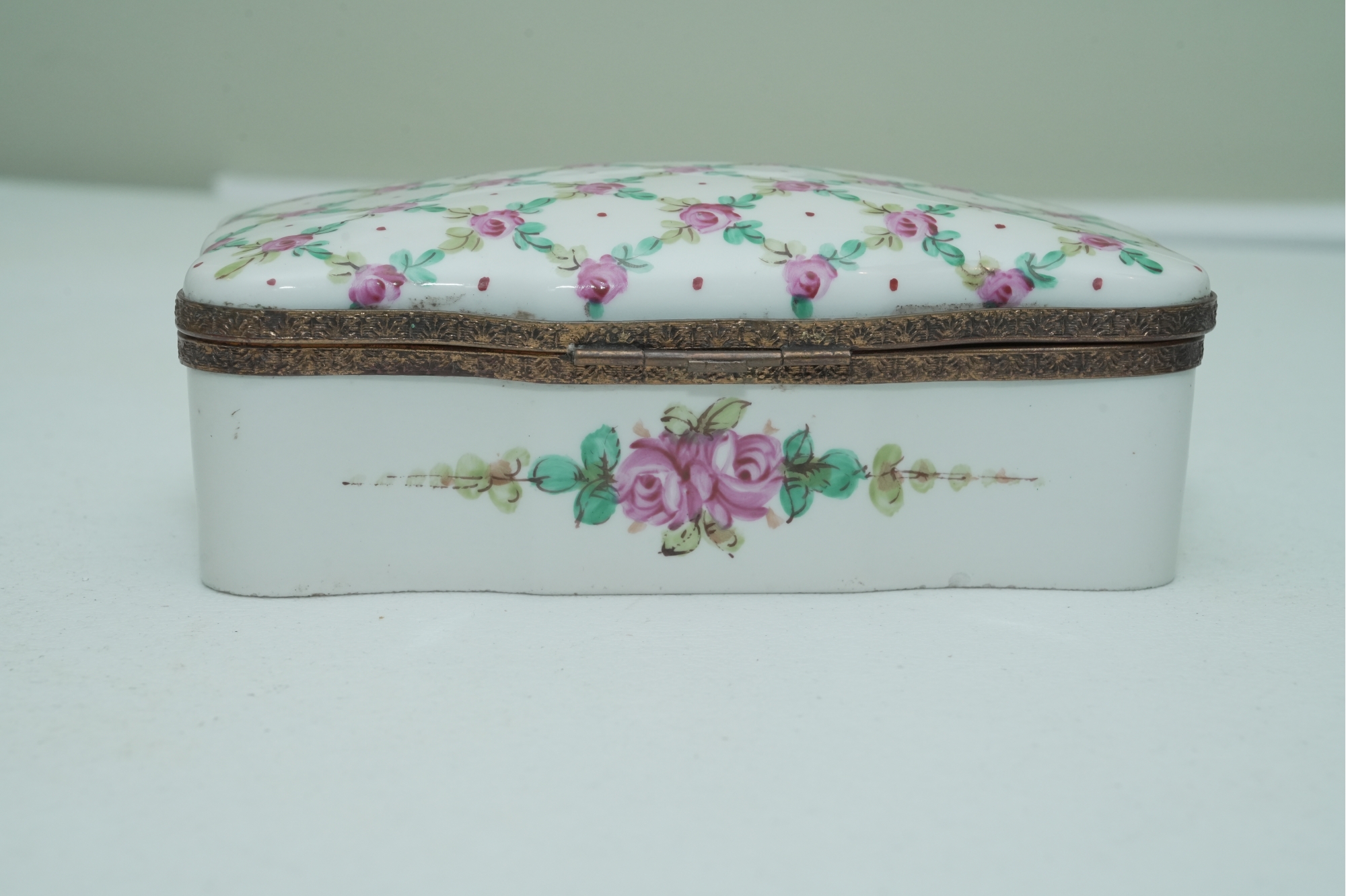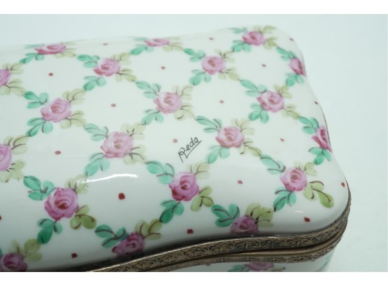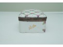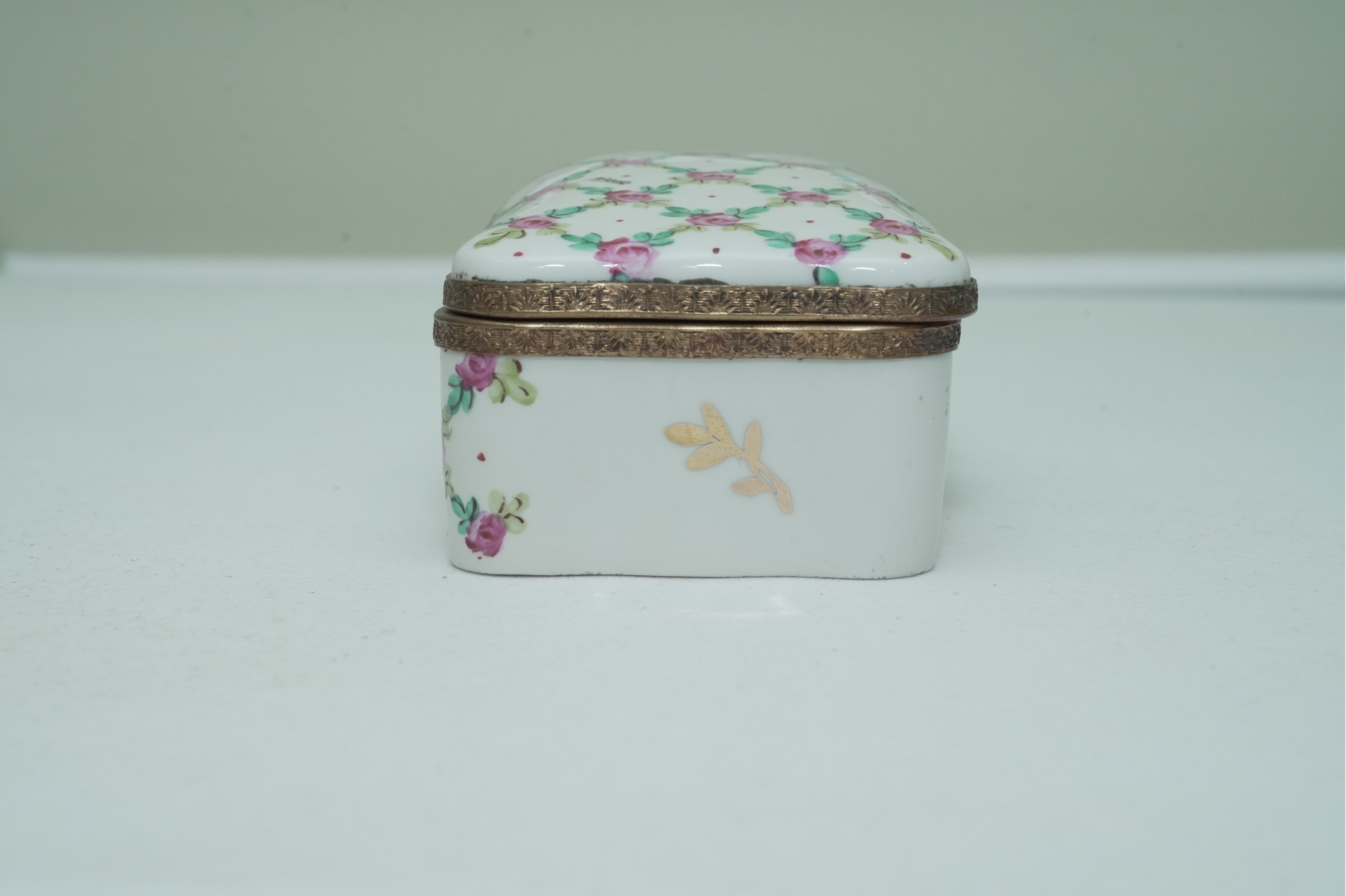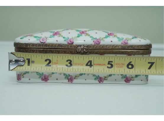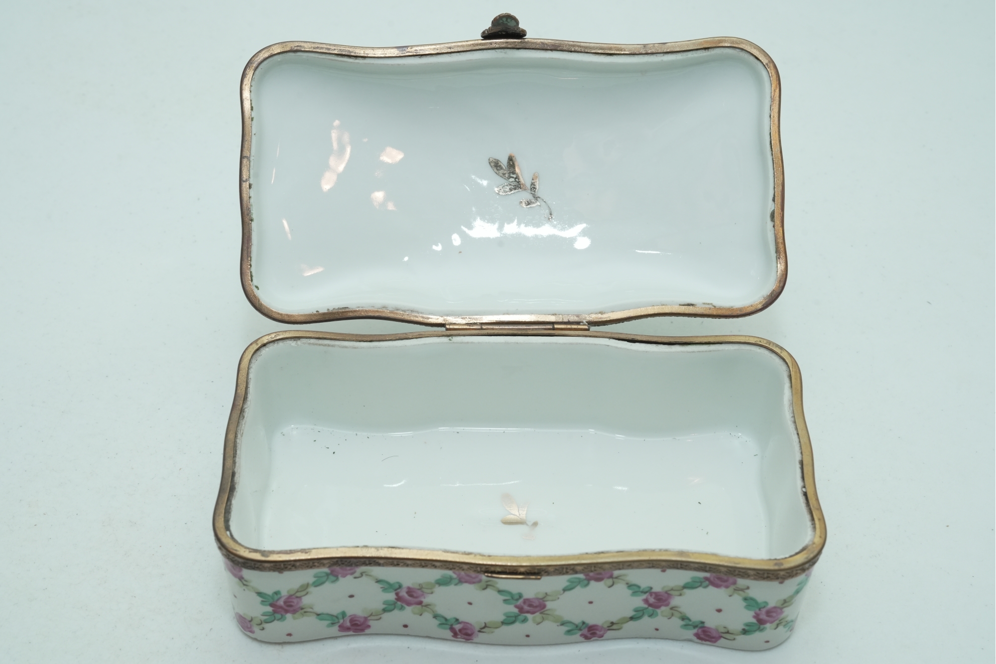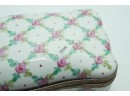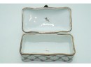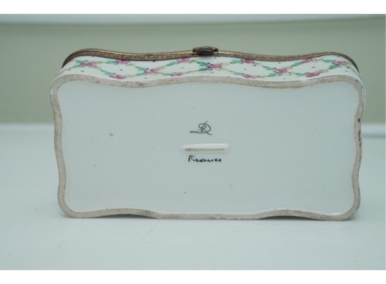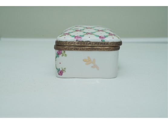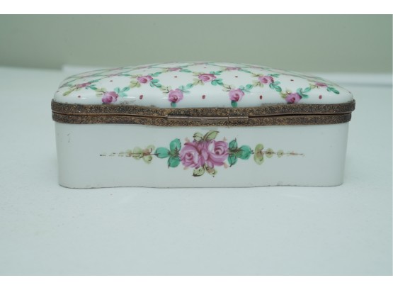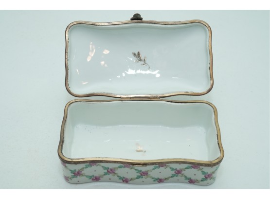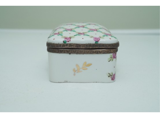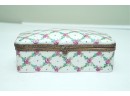 Porcelain Trinket Box With Floral Lattice Pattern And Metal Mounts