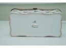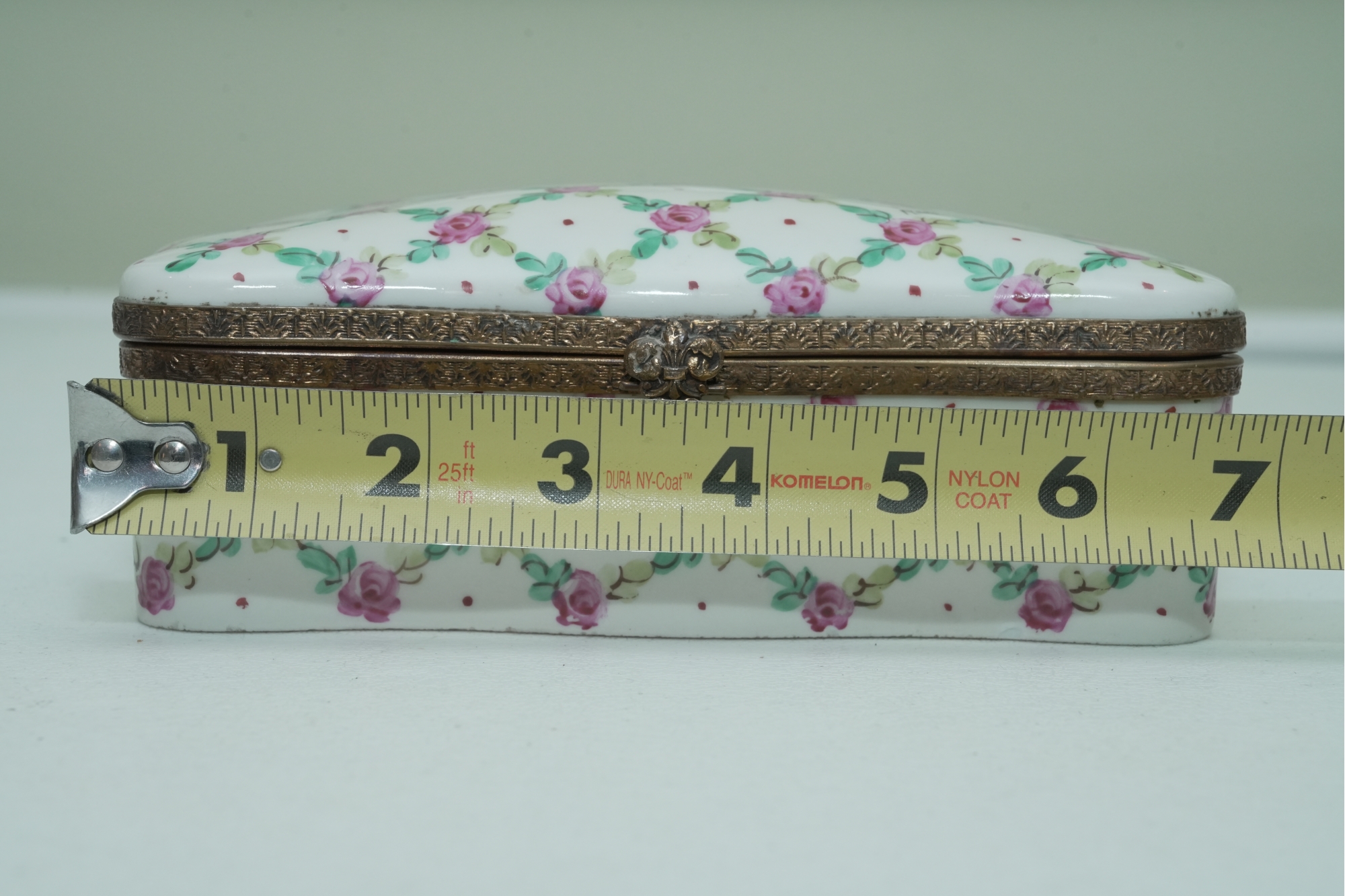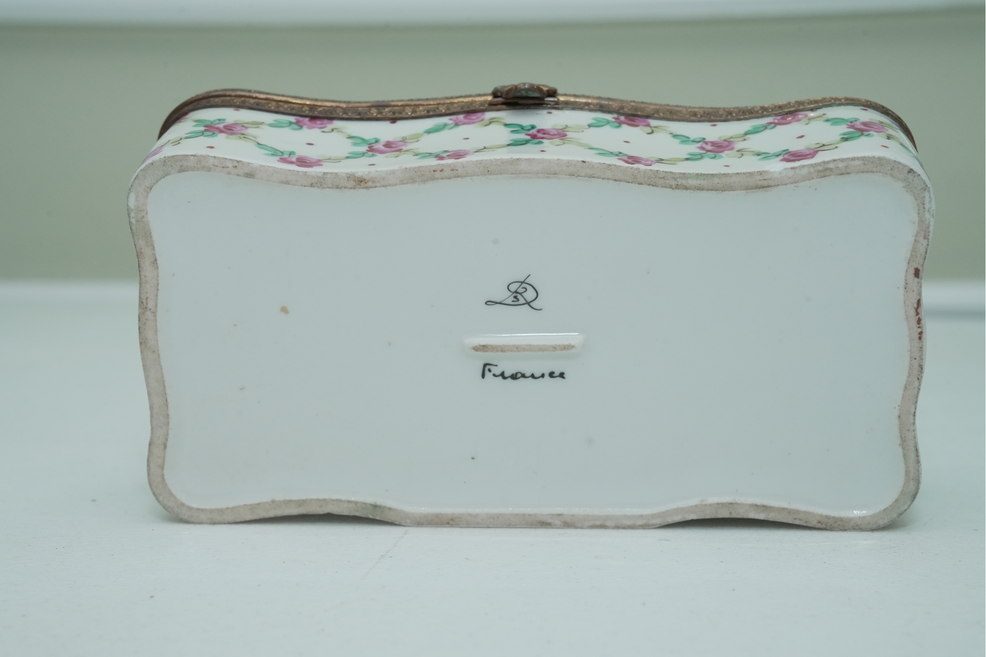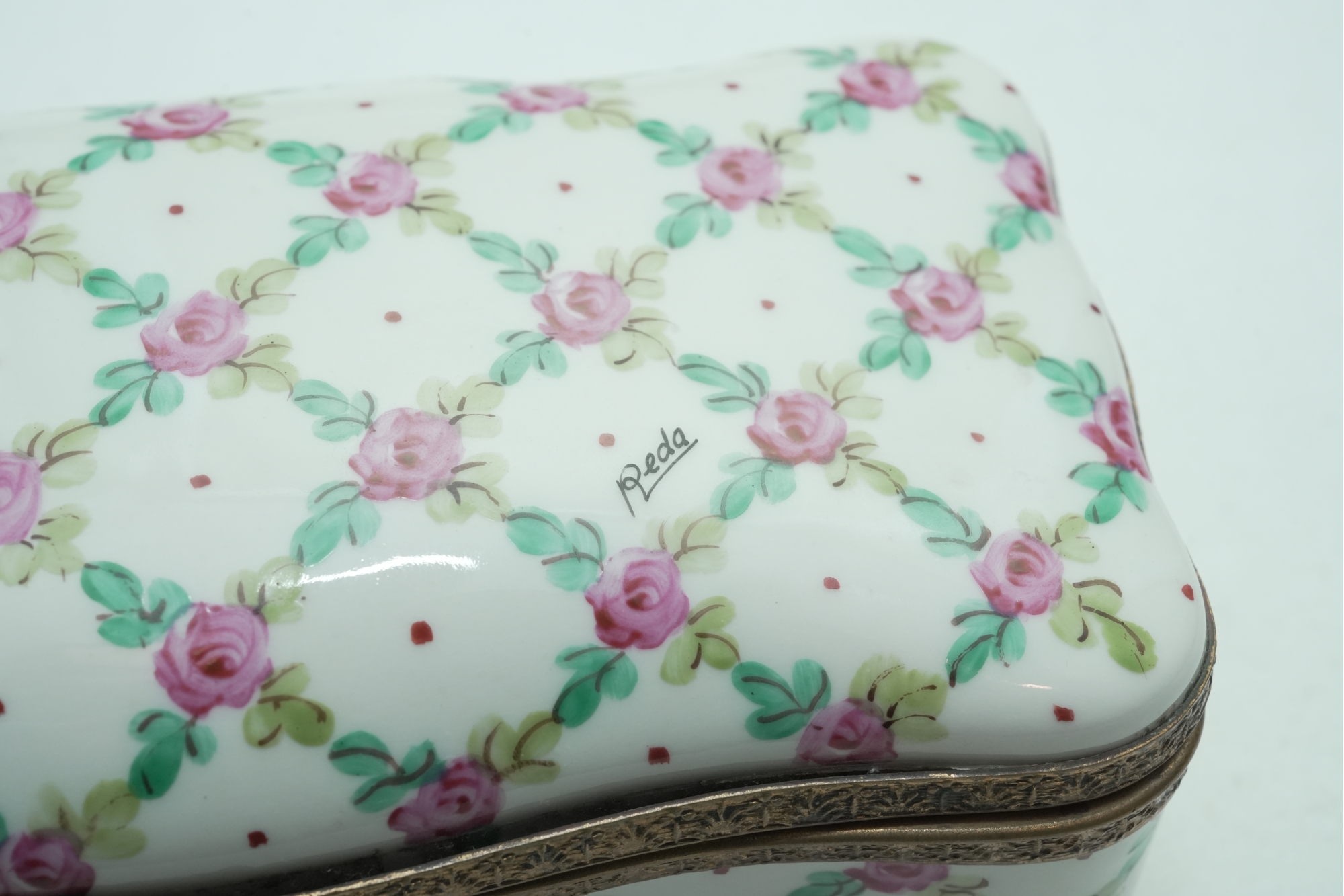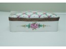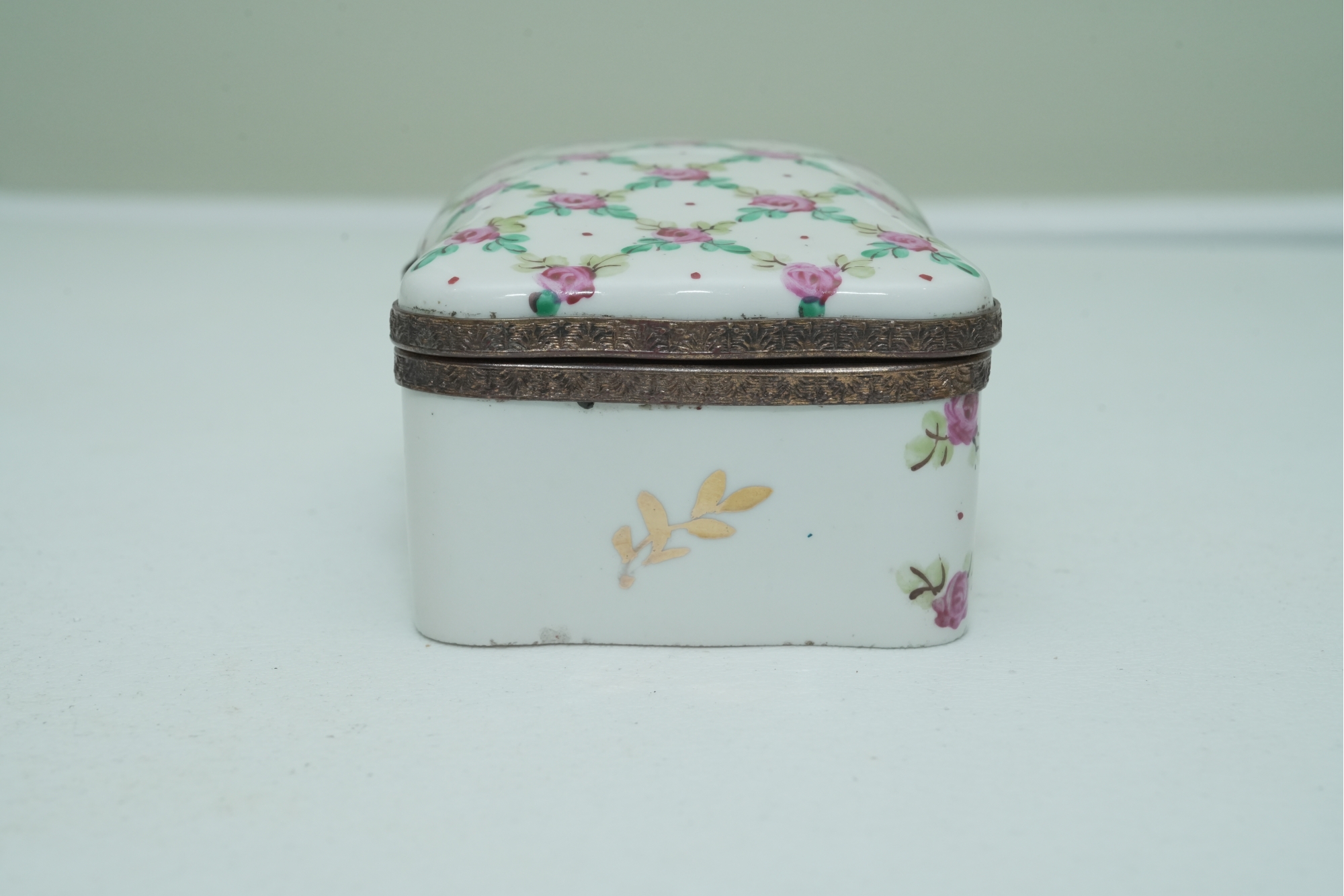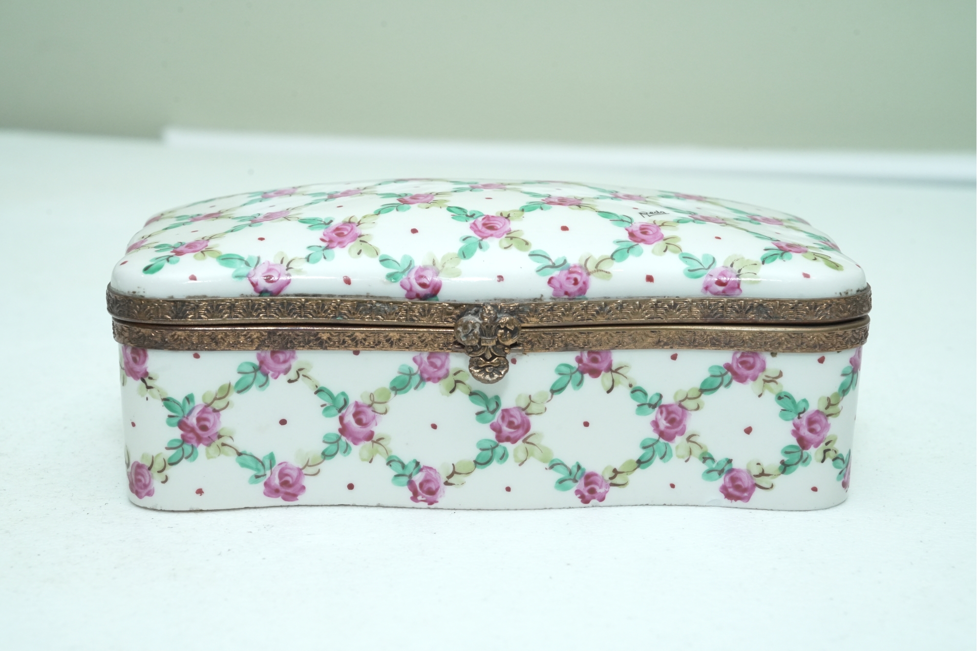 Porcelain Trinket Box With Floral Lattice Pattern And Metal Mounts