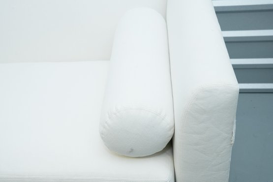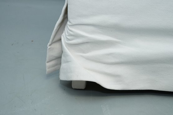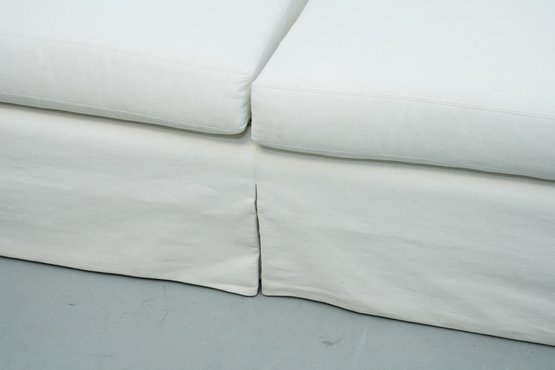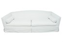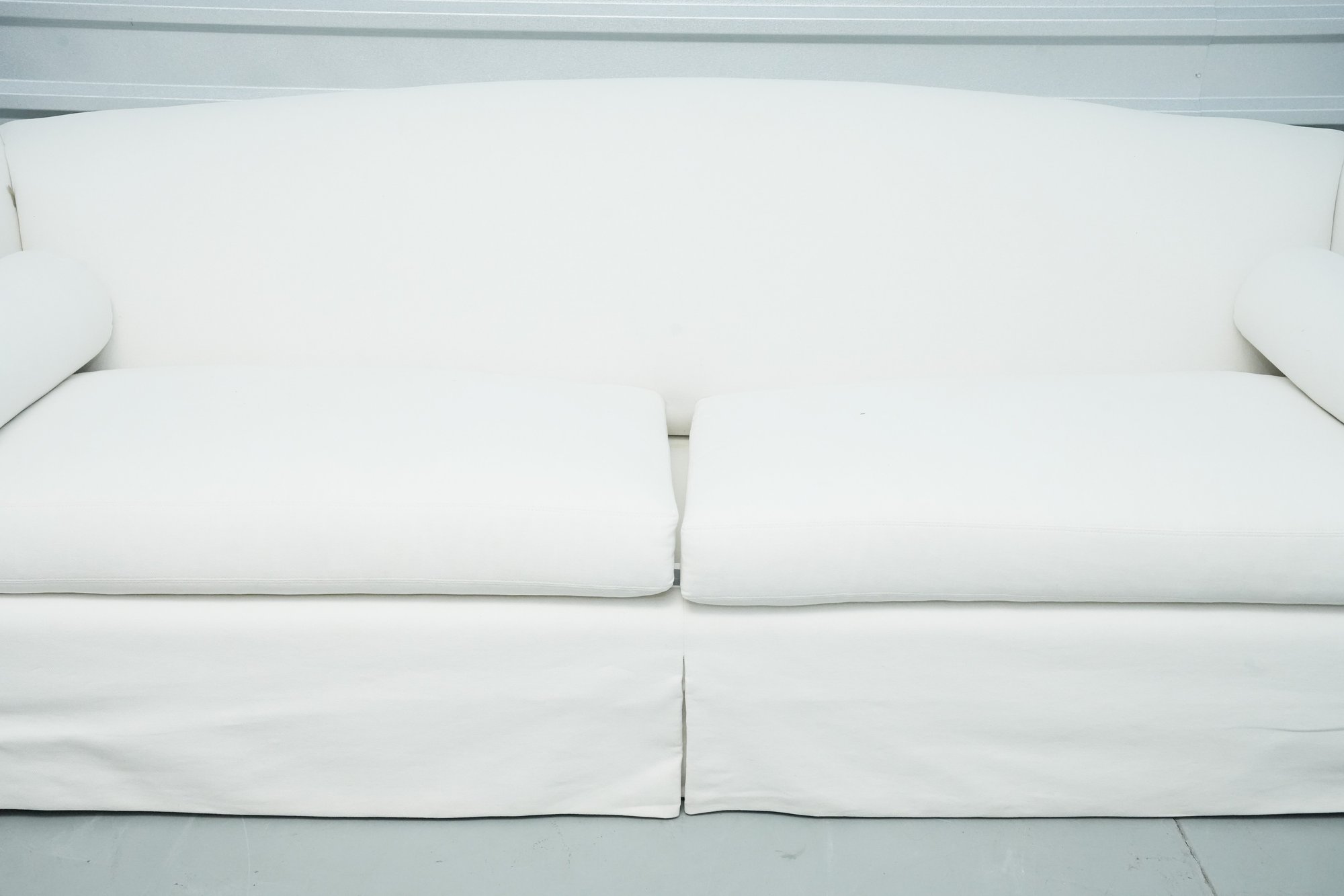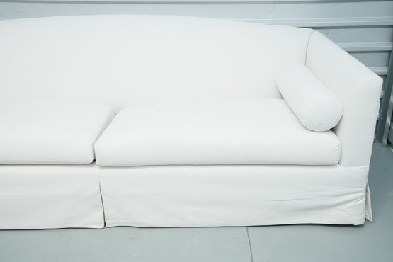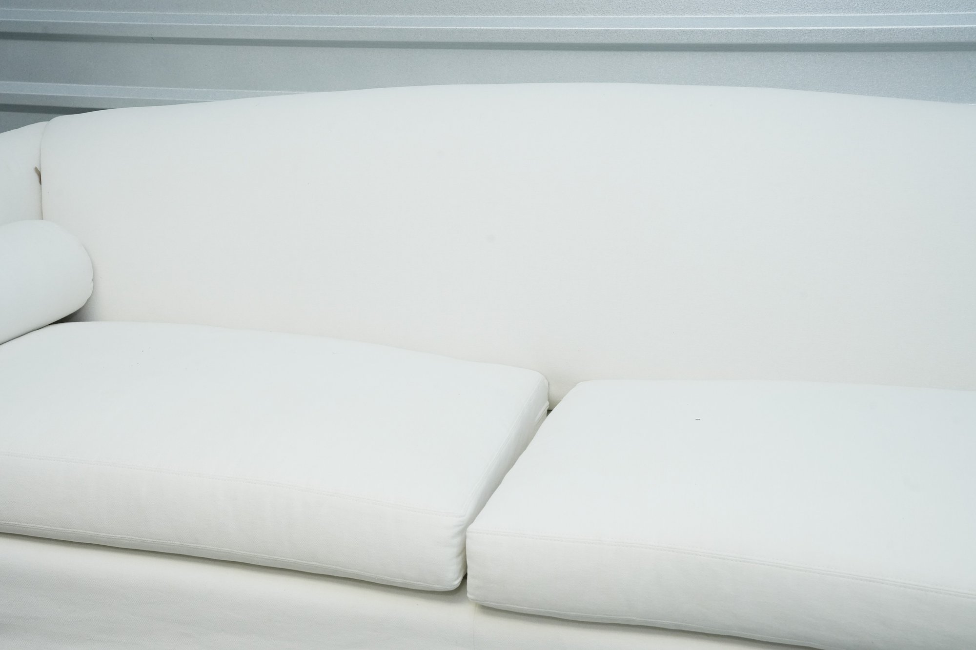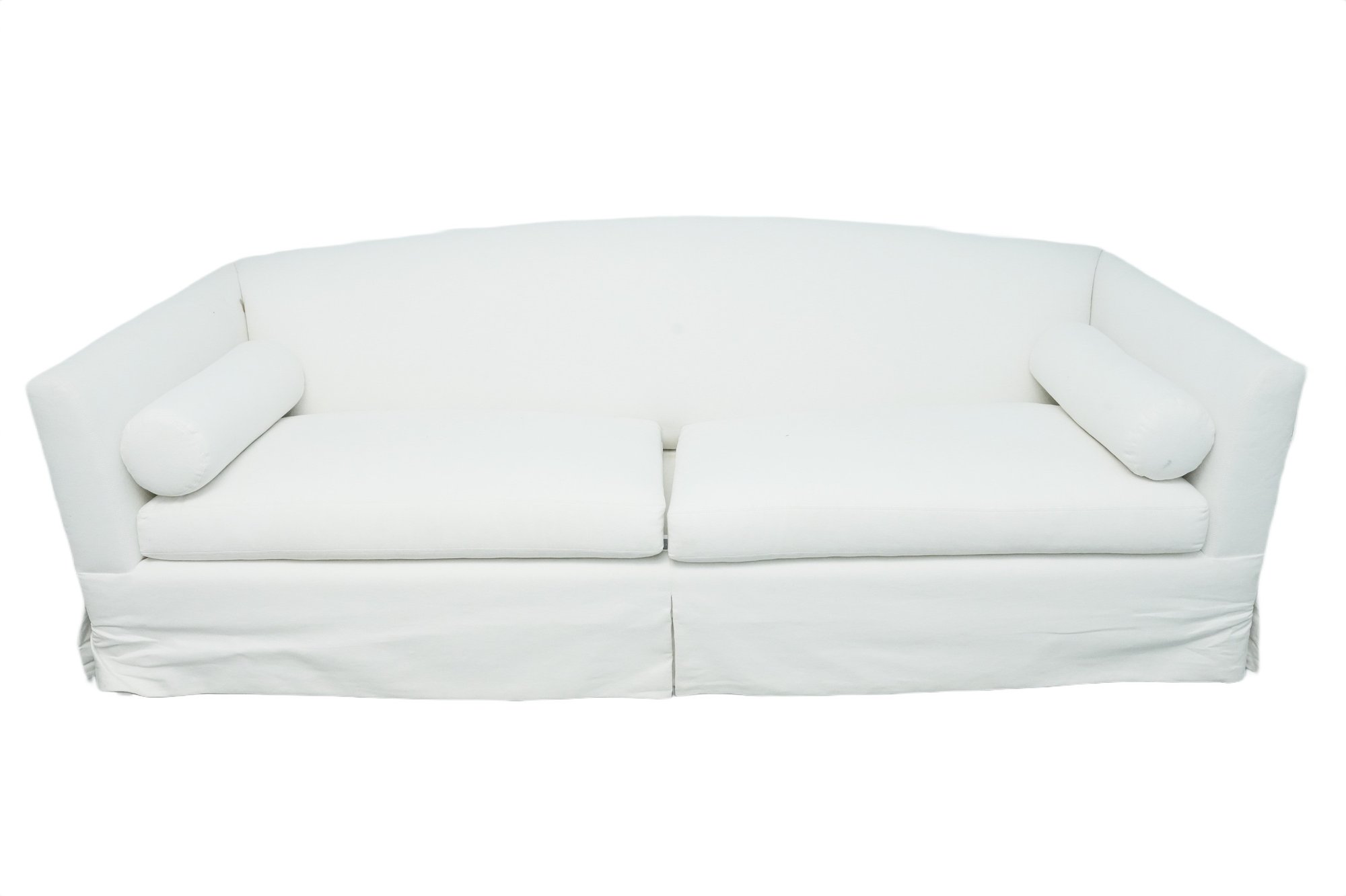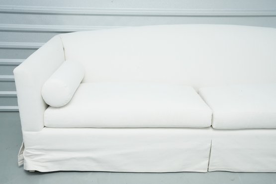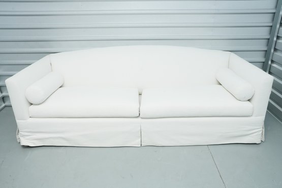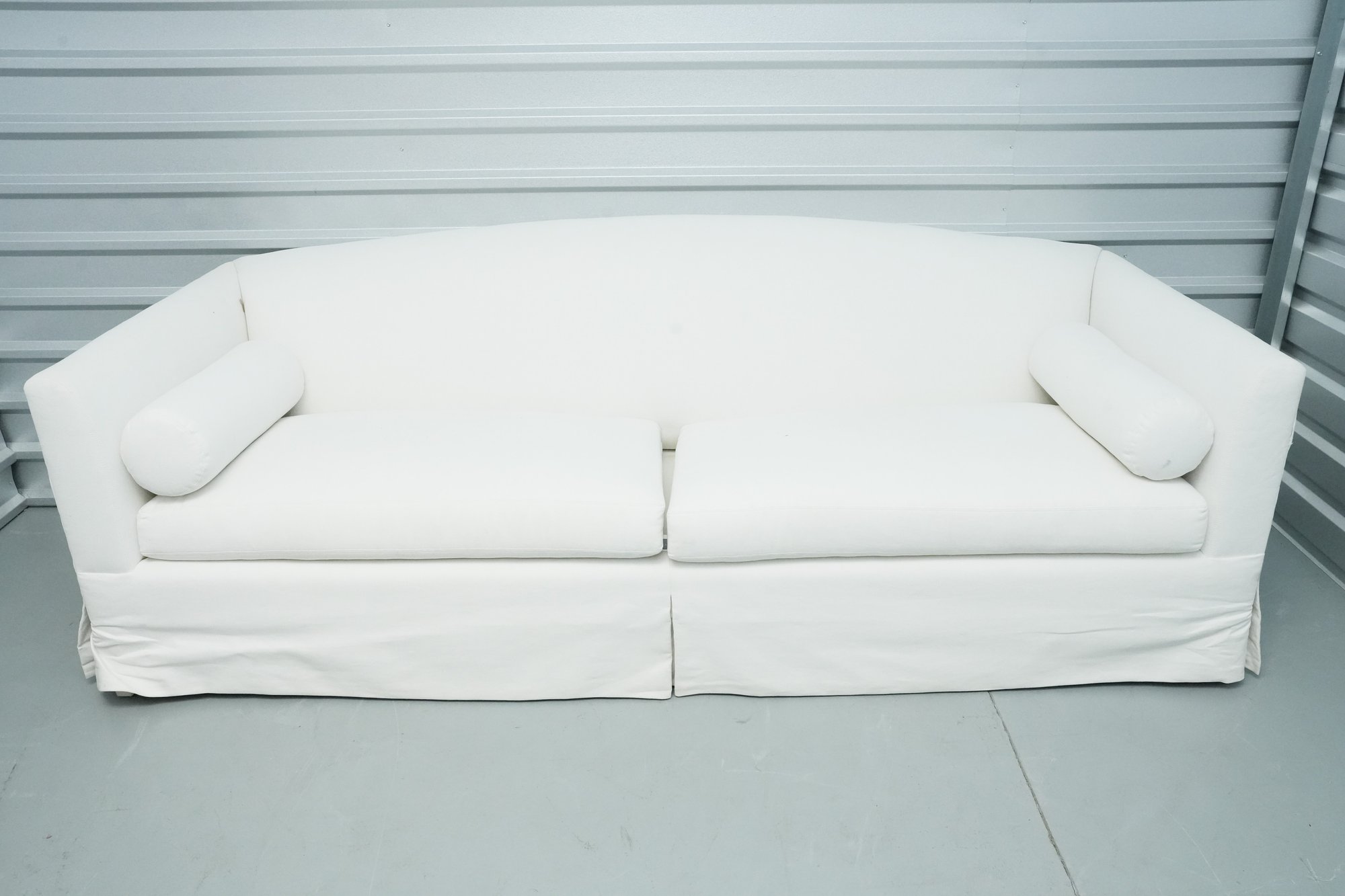Cream-colored upholstered sofa, featuring cylindrical side bolster pillows, a curved backrest, and a tailored floor-length skirt. Gently used, signs of wear/possible stain.
