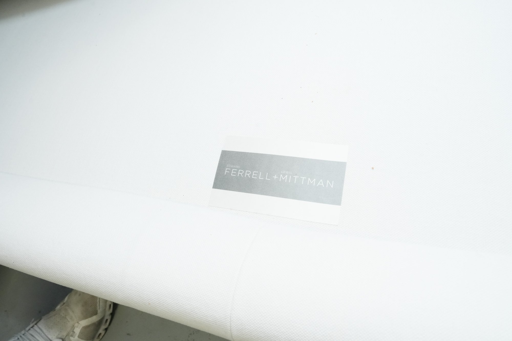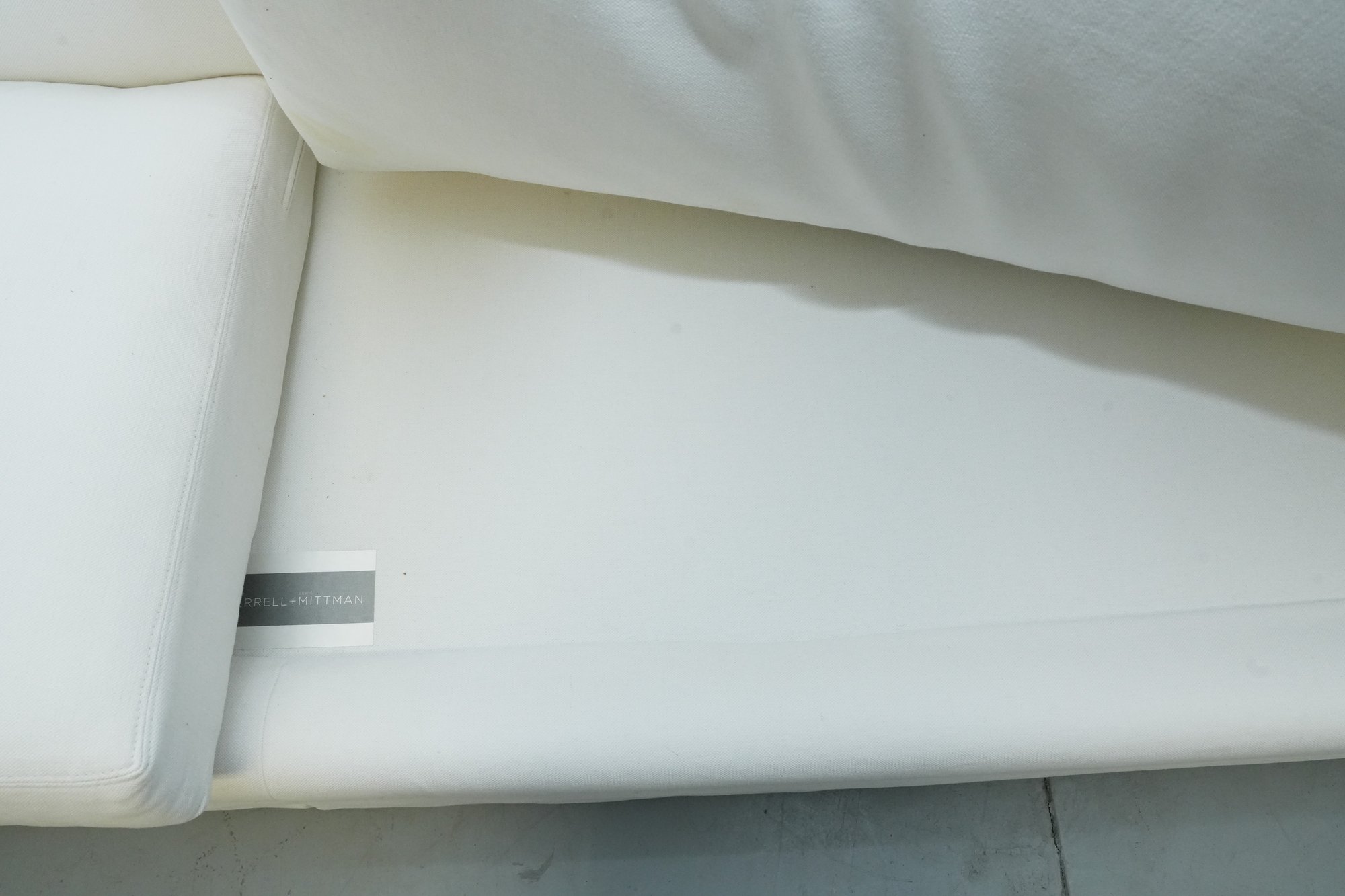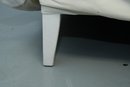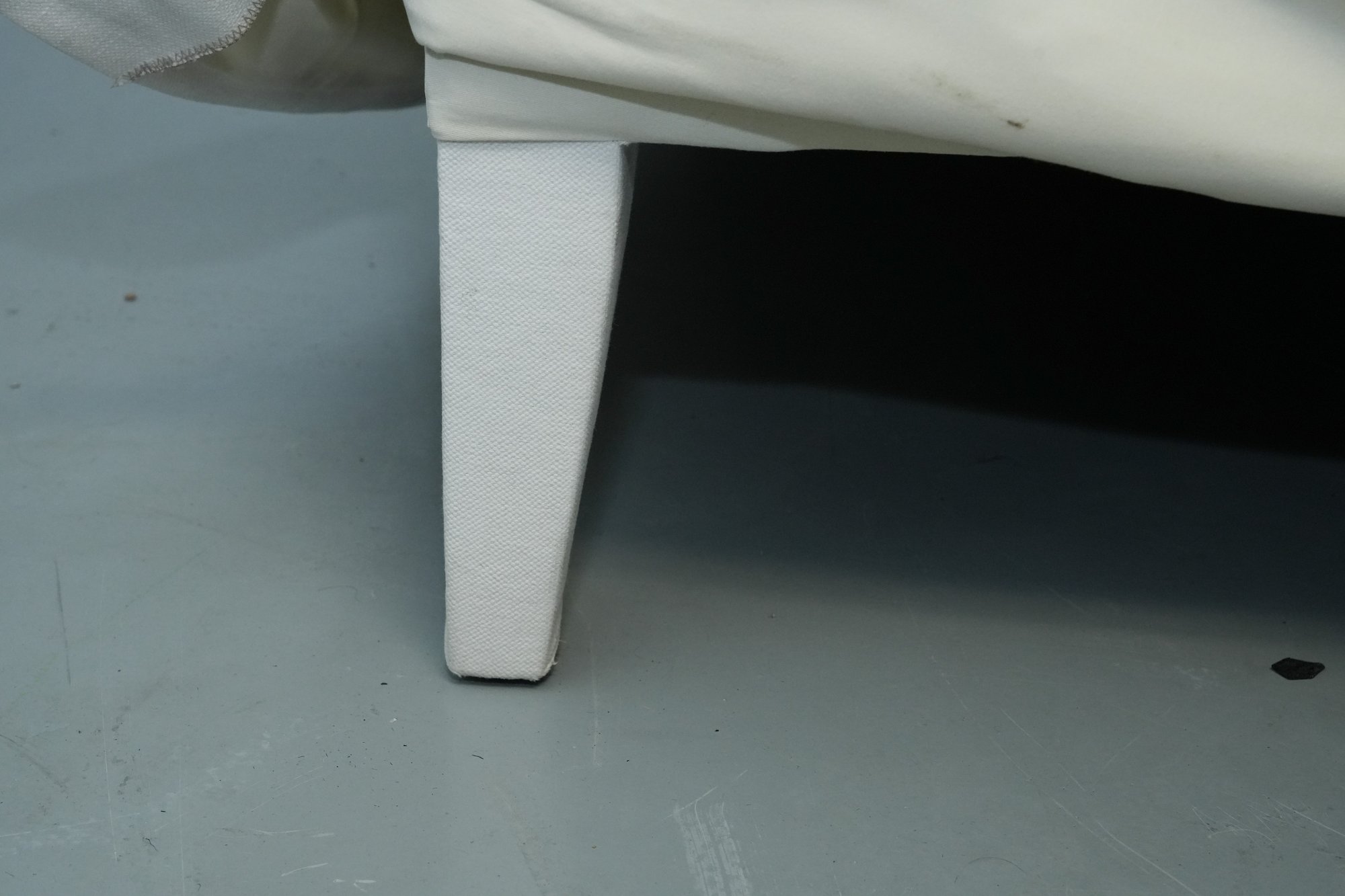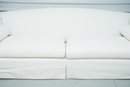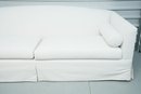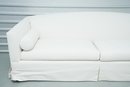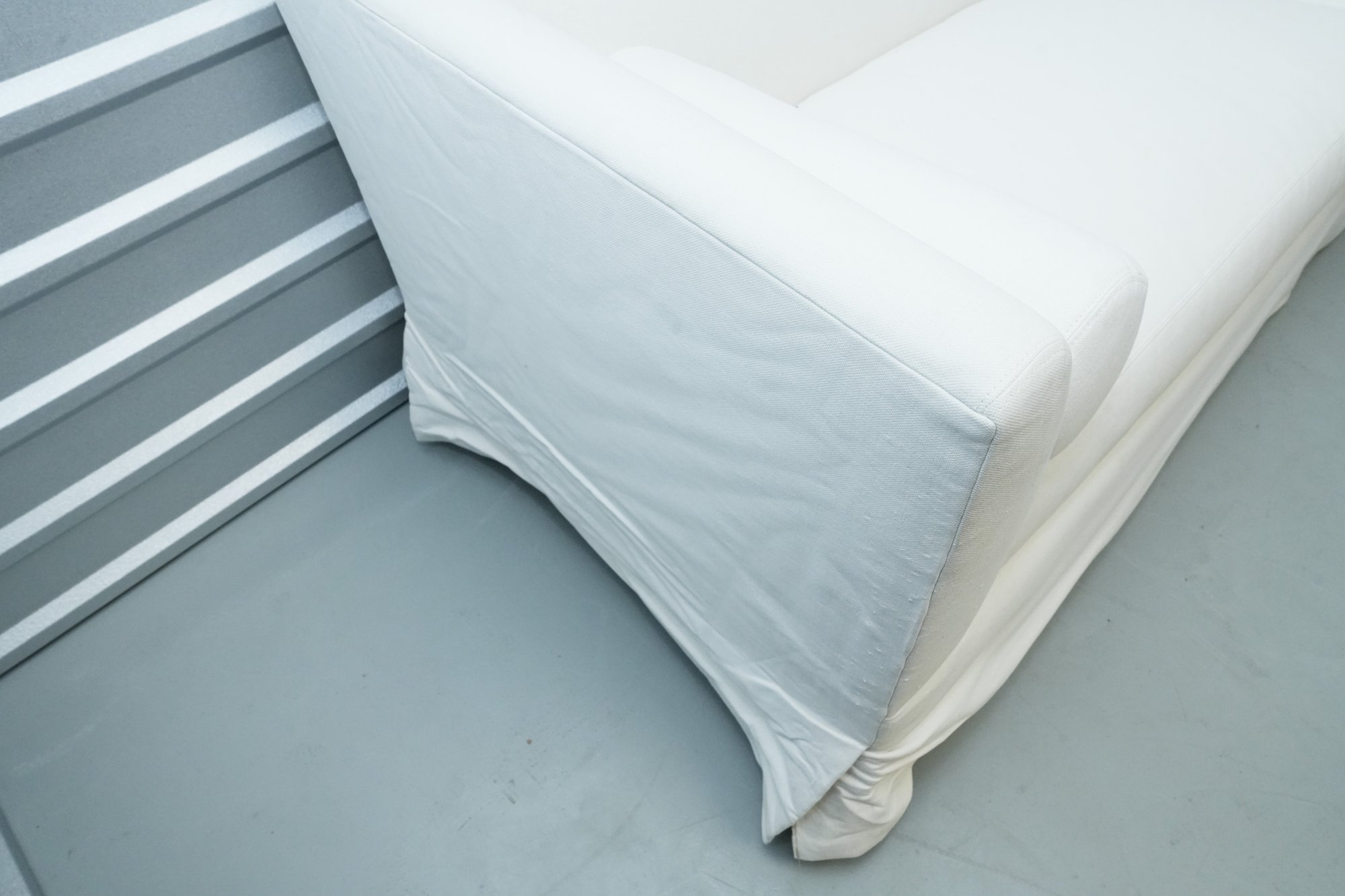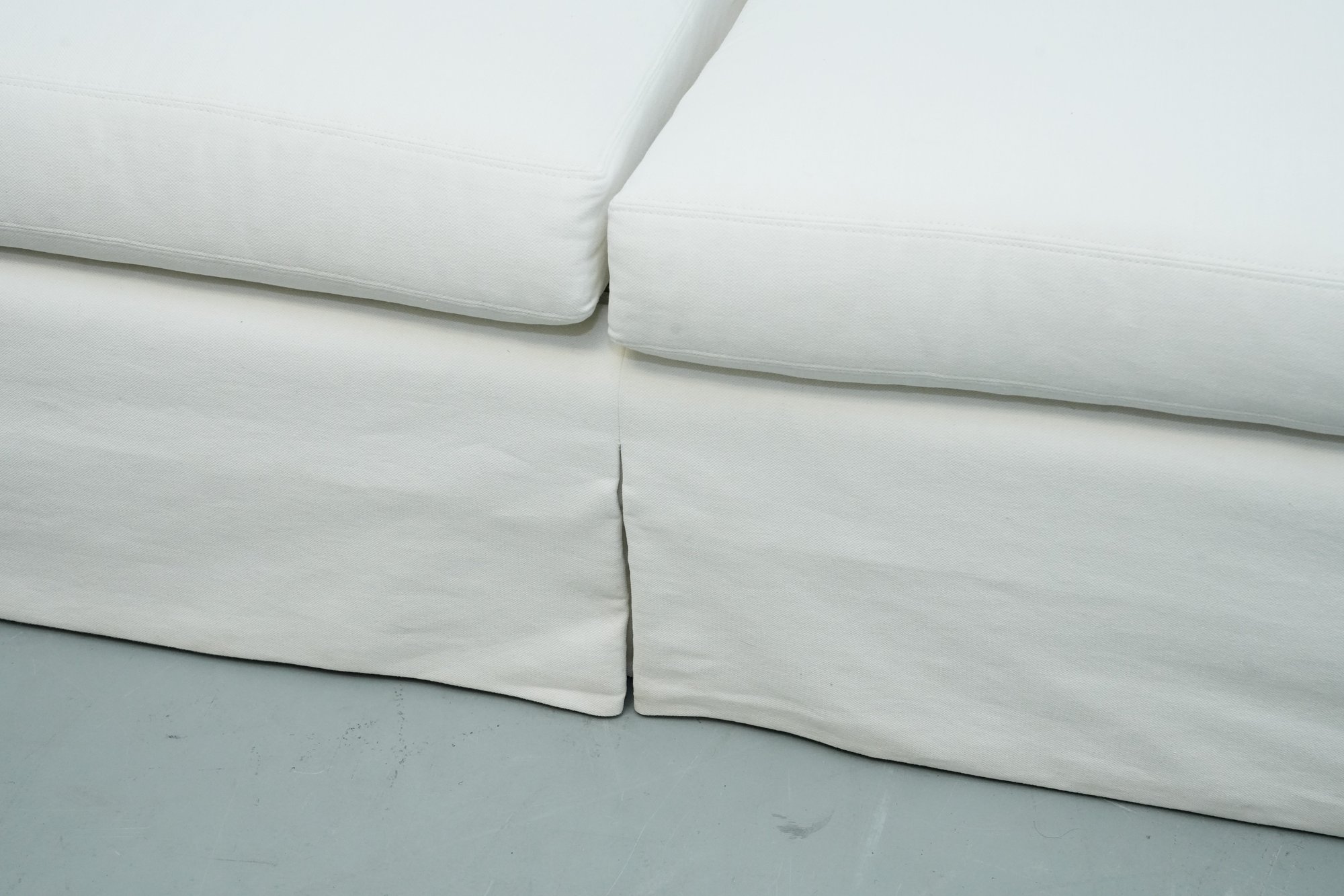 Cream-colored upholstered sofa, featuring cylindrical side bolster pillows, a curved backrest, and a tailored floor-length skirt. Gently used, signs of wear/possible stain.