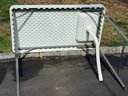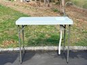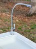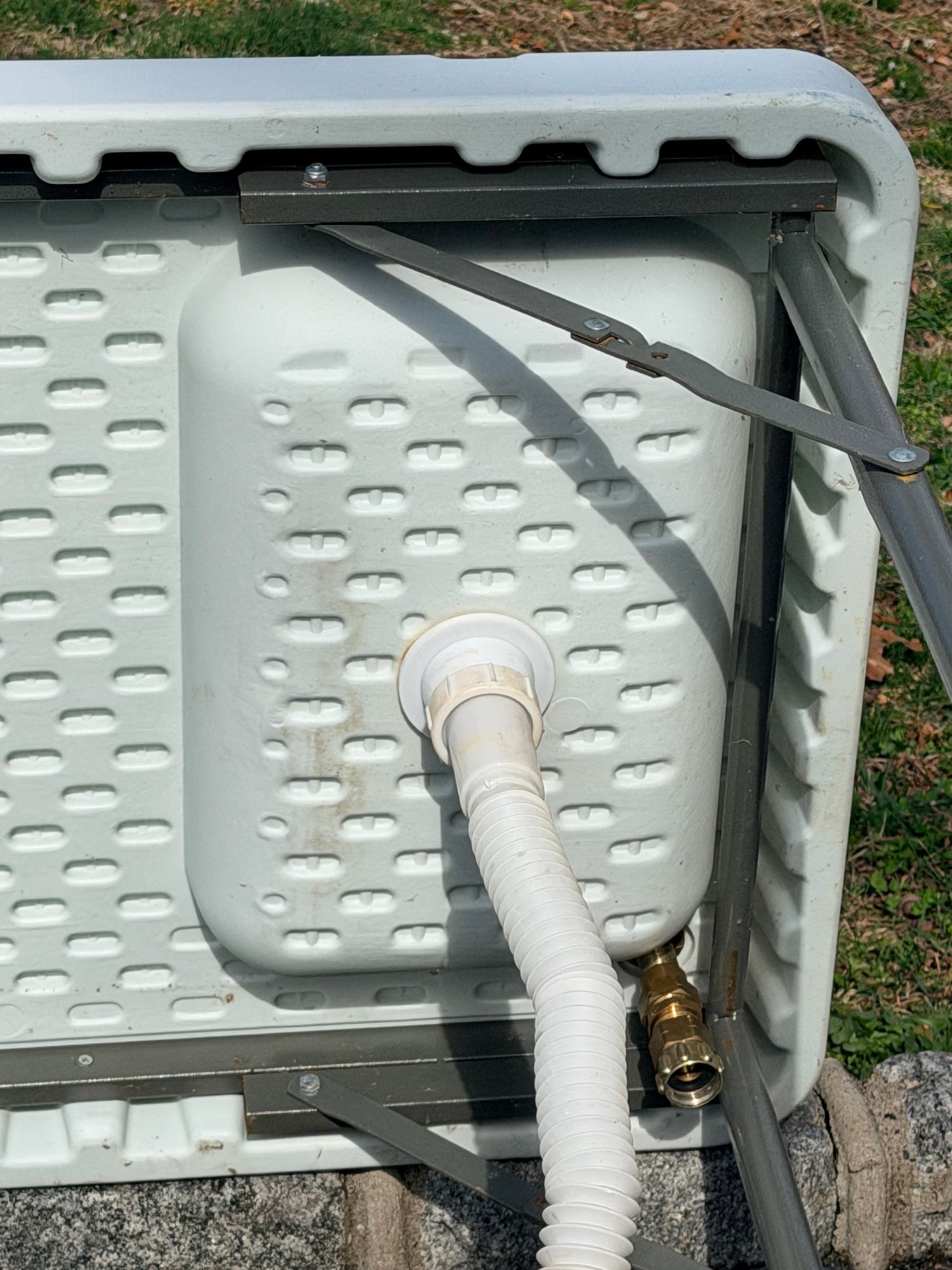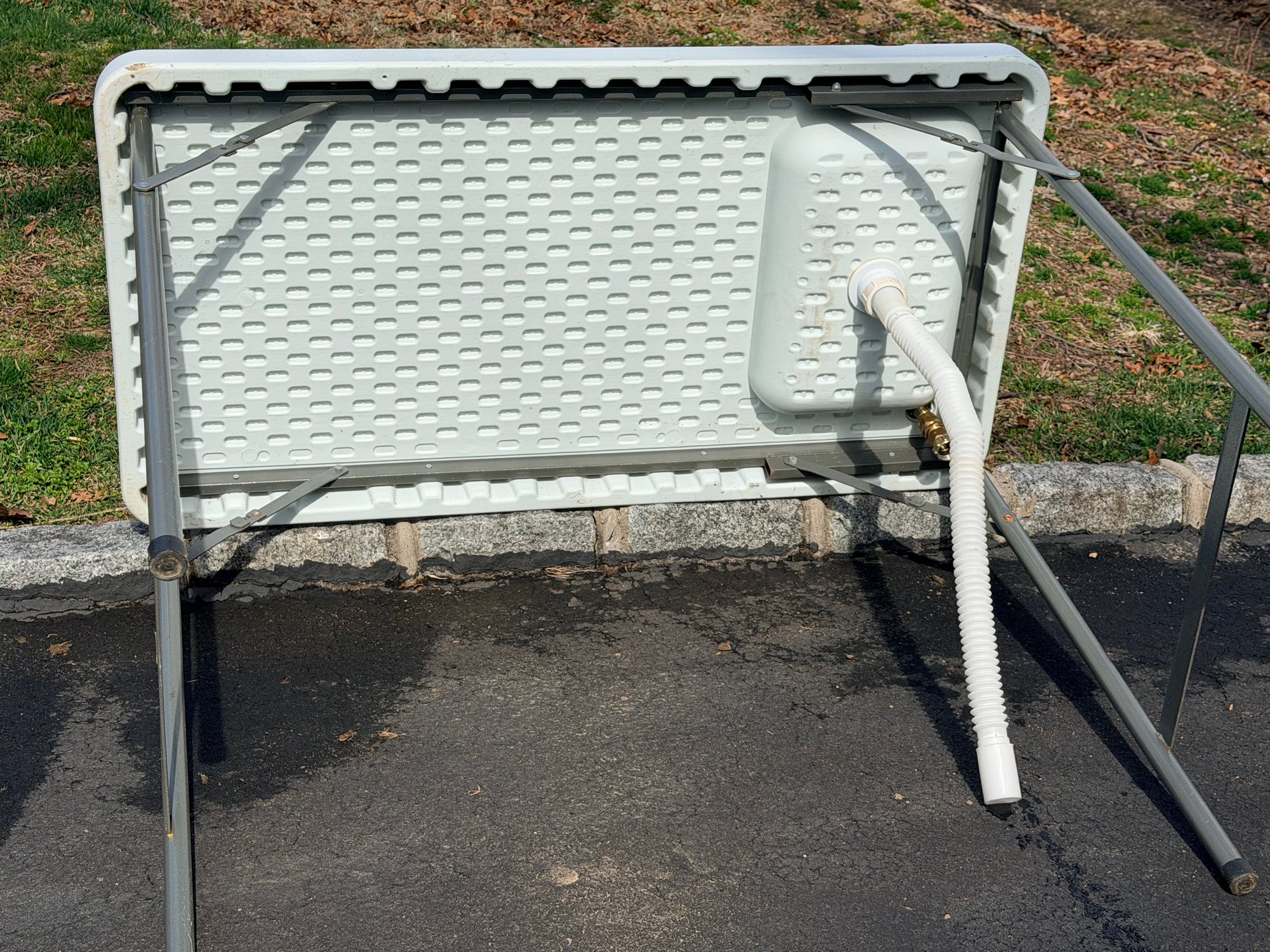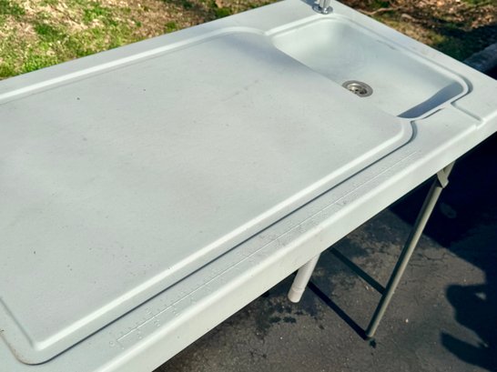Portable fish cleaning station featuring a molded work surface with integrated sink basin and gooseneck faucet. The table is supported by a folding metal frame with cross braces and includes a flexible drain hose for water runoff. Designed for outdoor use, ideal for cleaning fish, game, or other tasks requiring a washable work surface.
