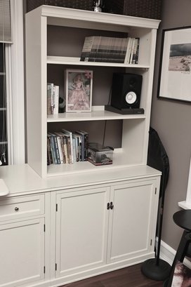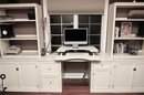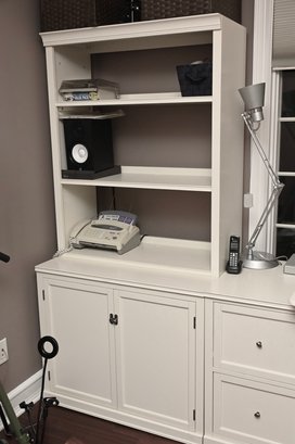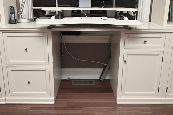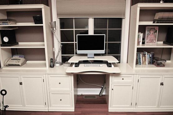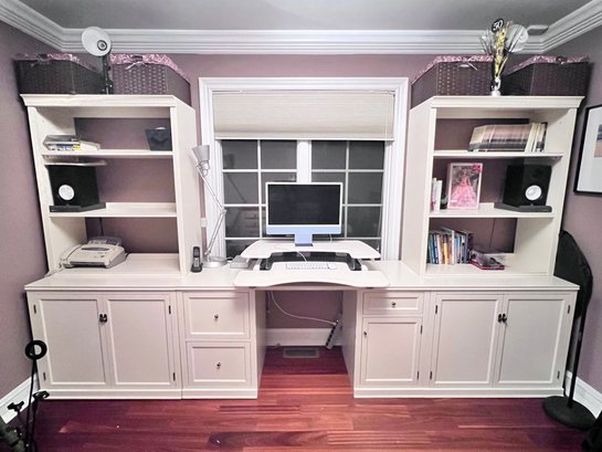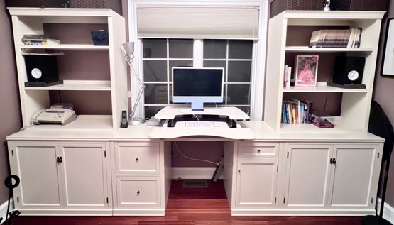Condition: Left 36” wide, middle 62” wide, right 36” wide. All pieces 23” deep. Desk 30” high, shelves 75” high. VariDesk not included.