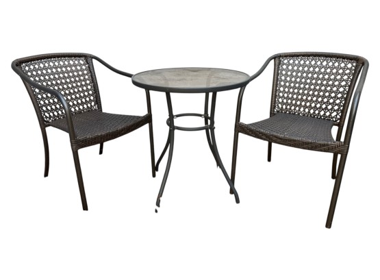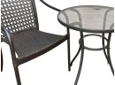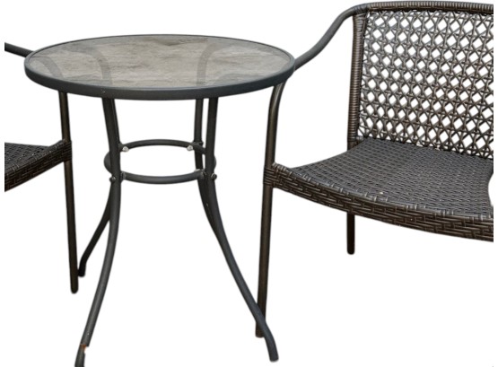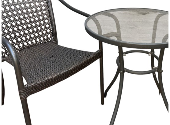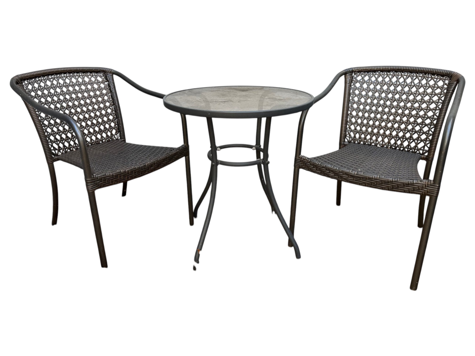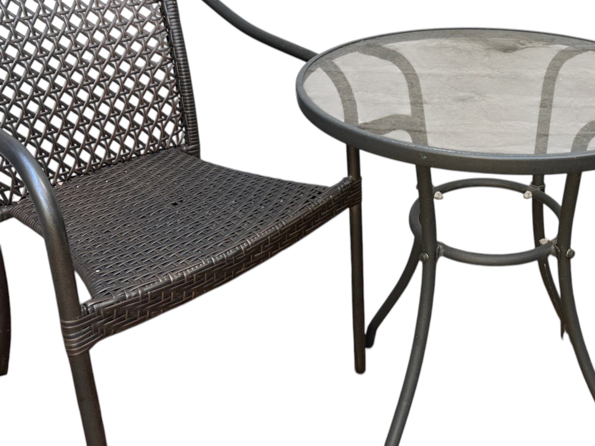 Outdoor bistro table and chairs set features two woven‑metal bistro chairs with gently curved backs and tightly patterned mesh seats. Their slim metal frames echo the round glass‑top table, which rests on a metal base with subtly flared legs.