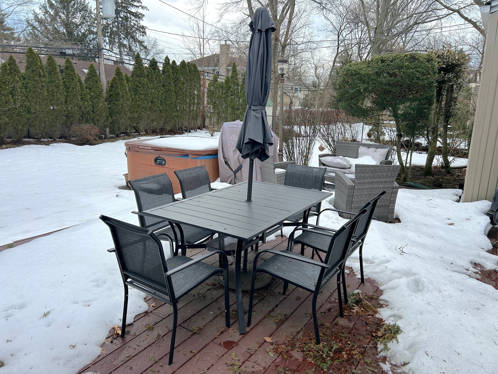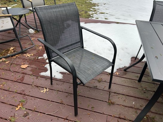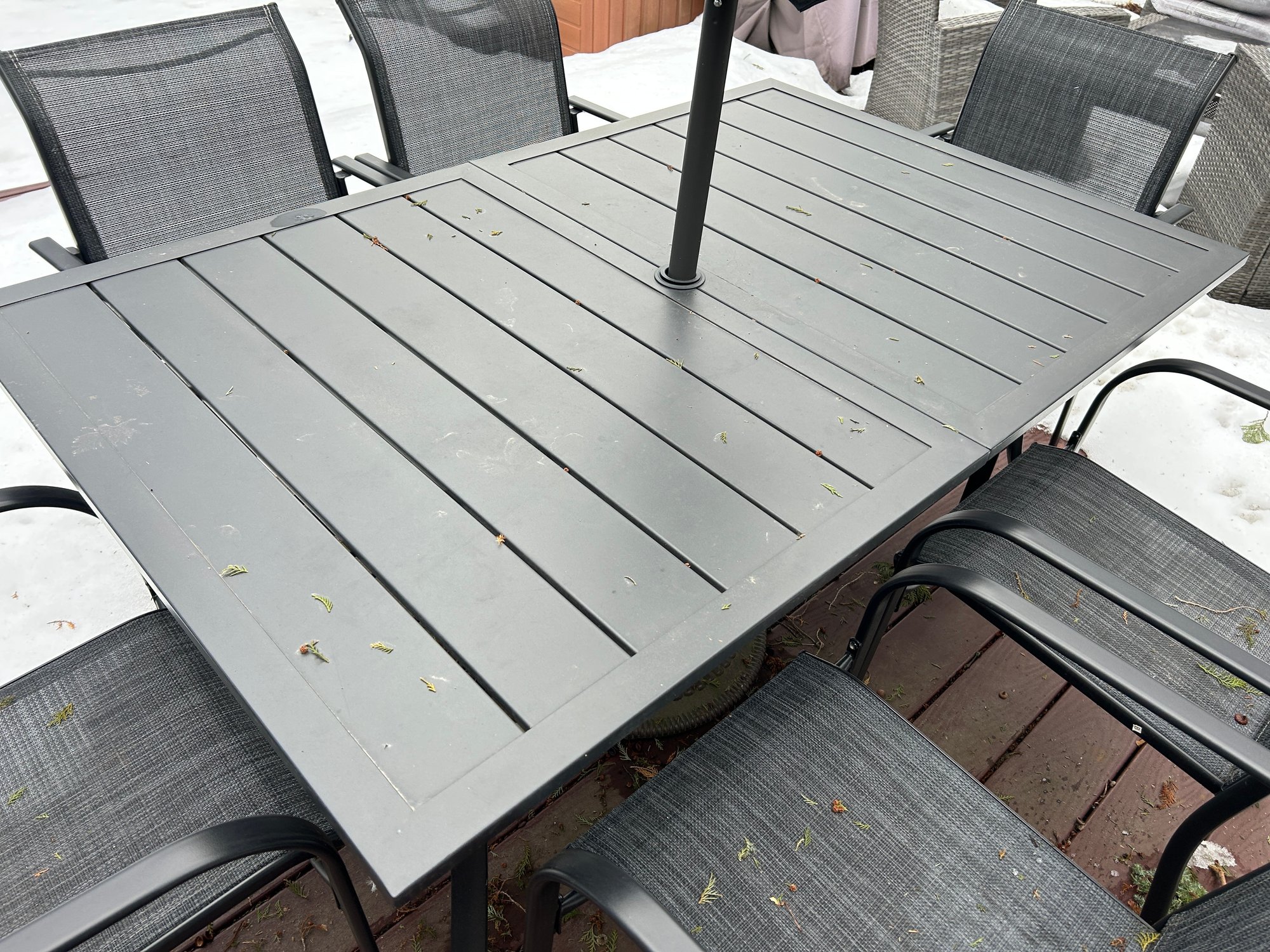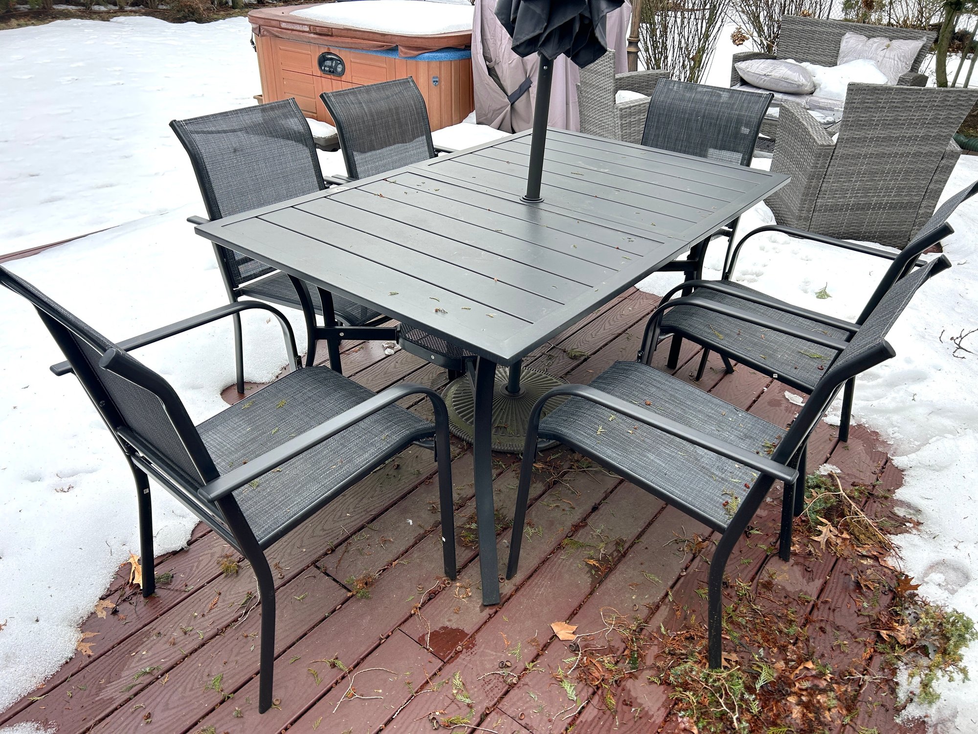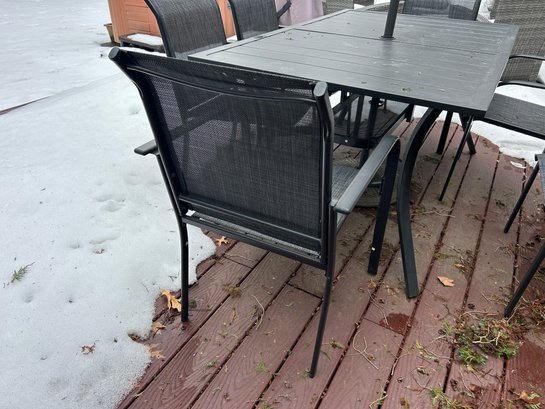 This is a black outdoor dining set featuring a rectangular slatted table, six armless chairs with mesh seats and backs, and a central patio umbrella. The table and chair frames are constructed from black metal. The gray fabric umbrella is currently folded and designed to fit into the table's central opening.