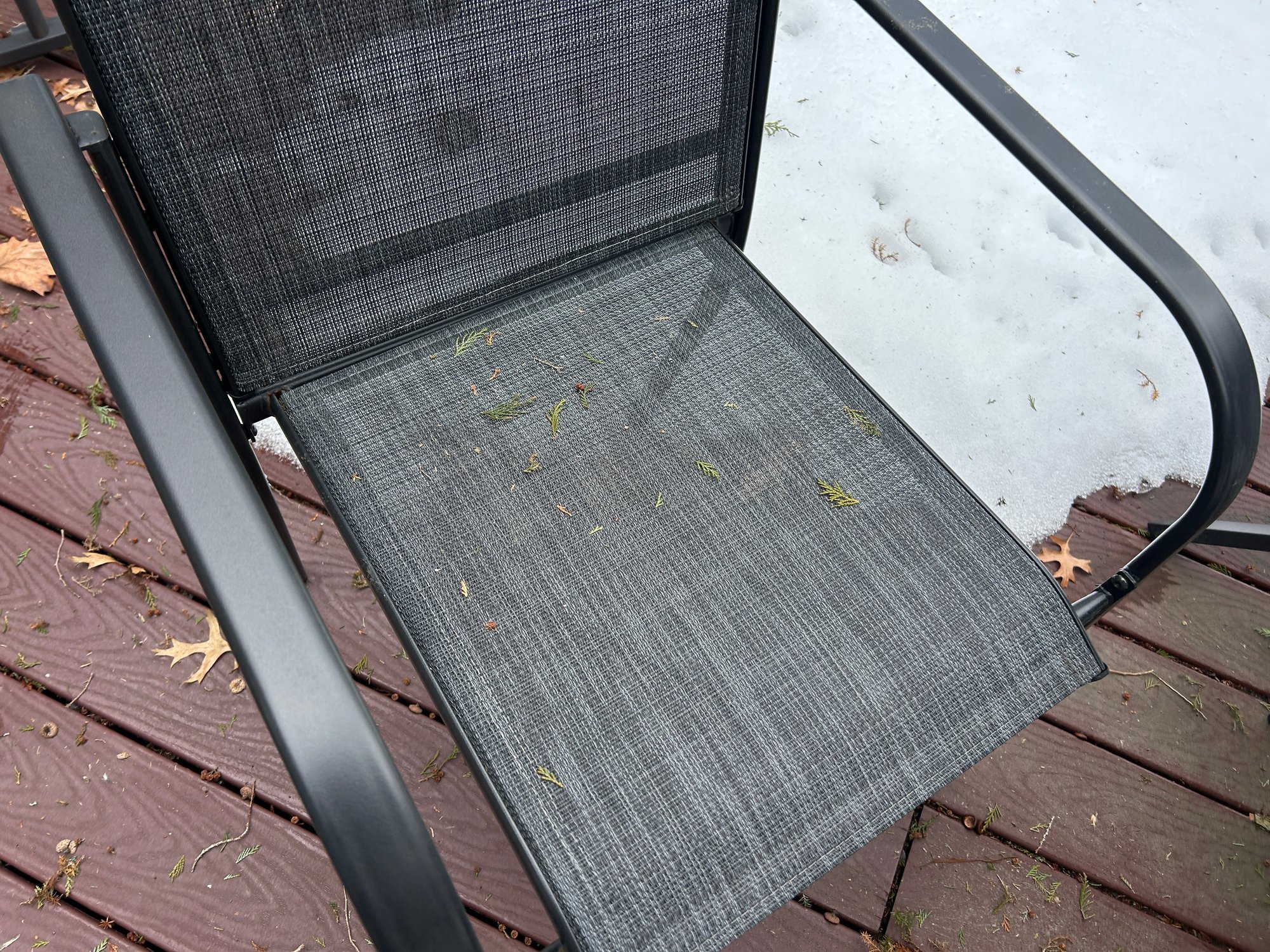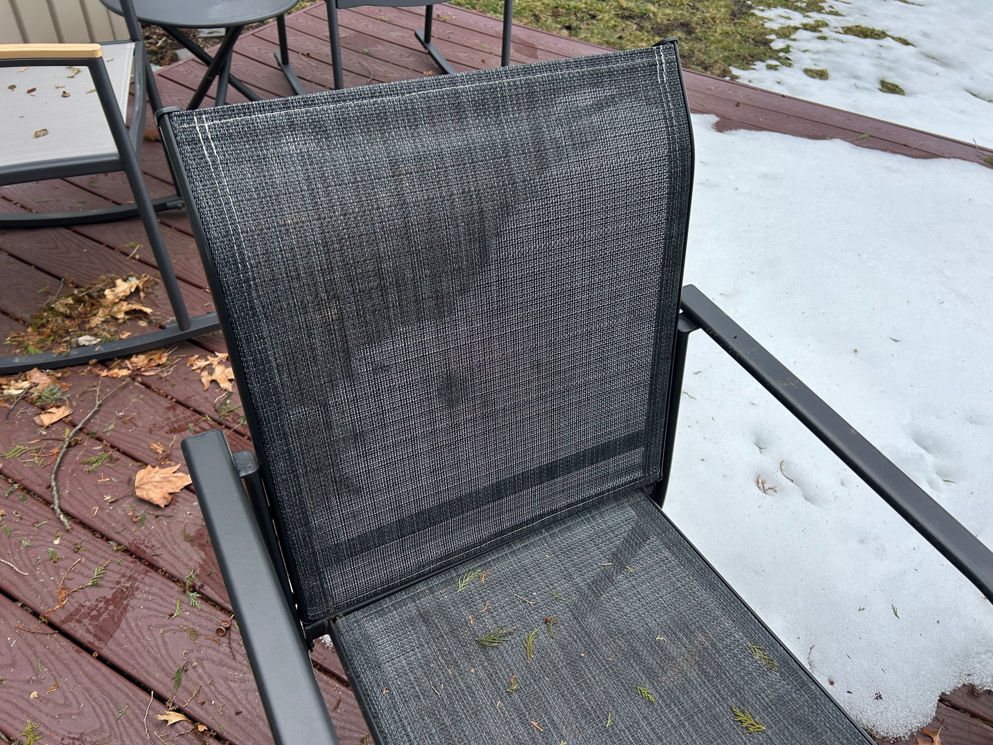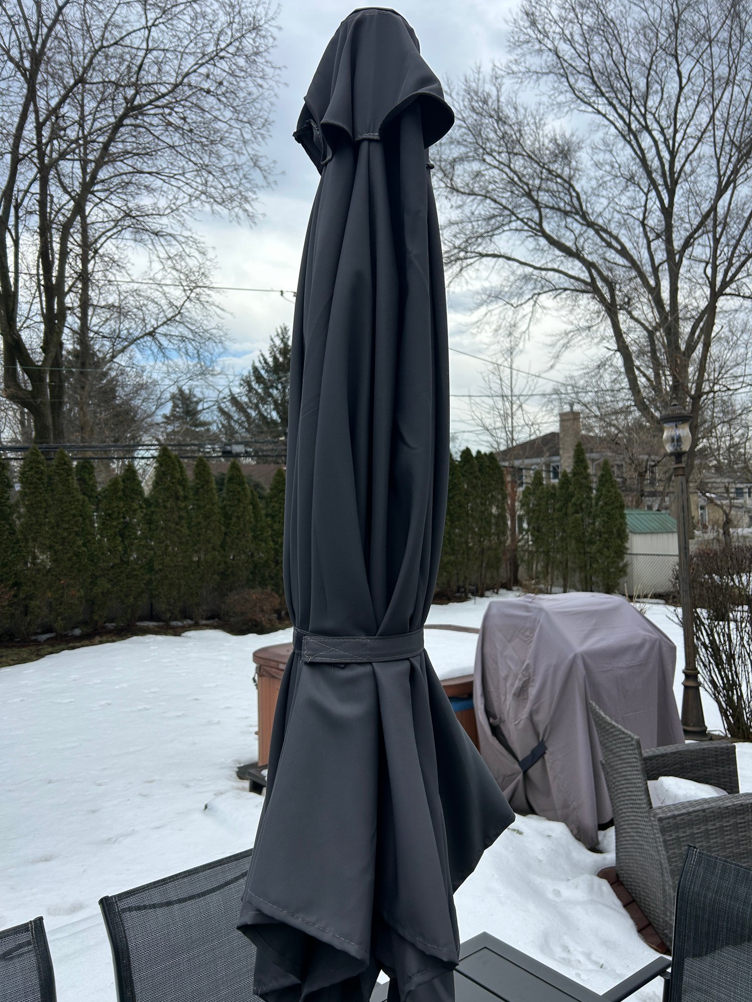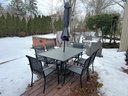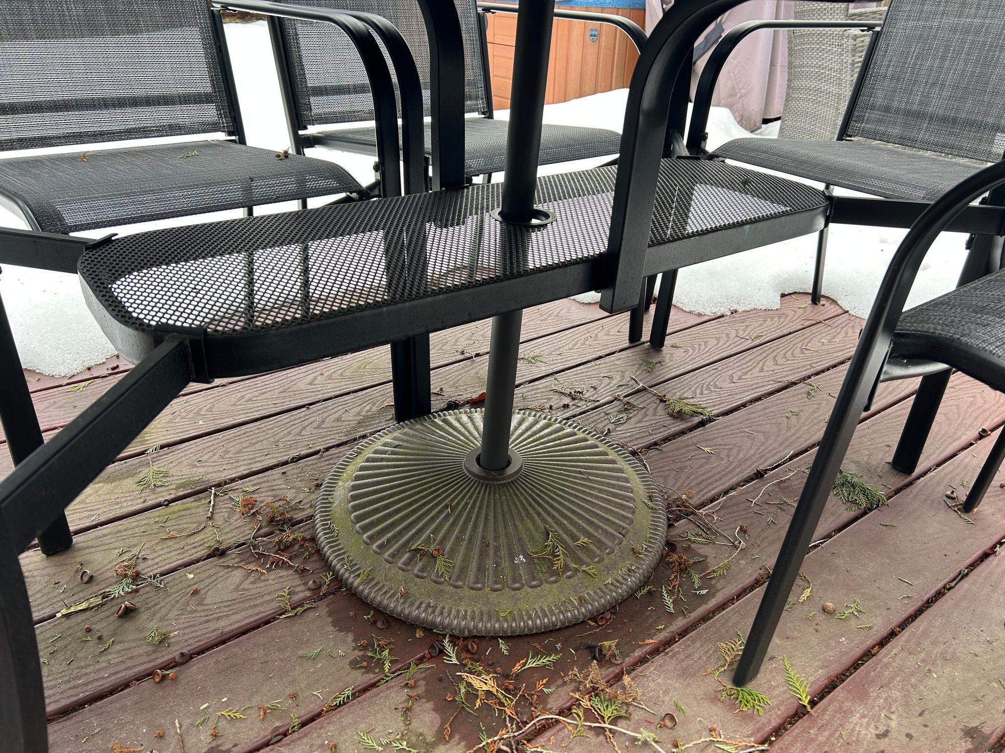 This is a black outdoor dining set featuring a rectangular slatted table, six armless chairs with mesh seats and backs, and a central patio umbrella. The table and chair frames are constructed from black metal. The gray fabric umbrella is currently folded and designed to fit into the table's central opening.