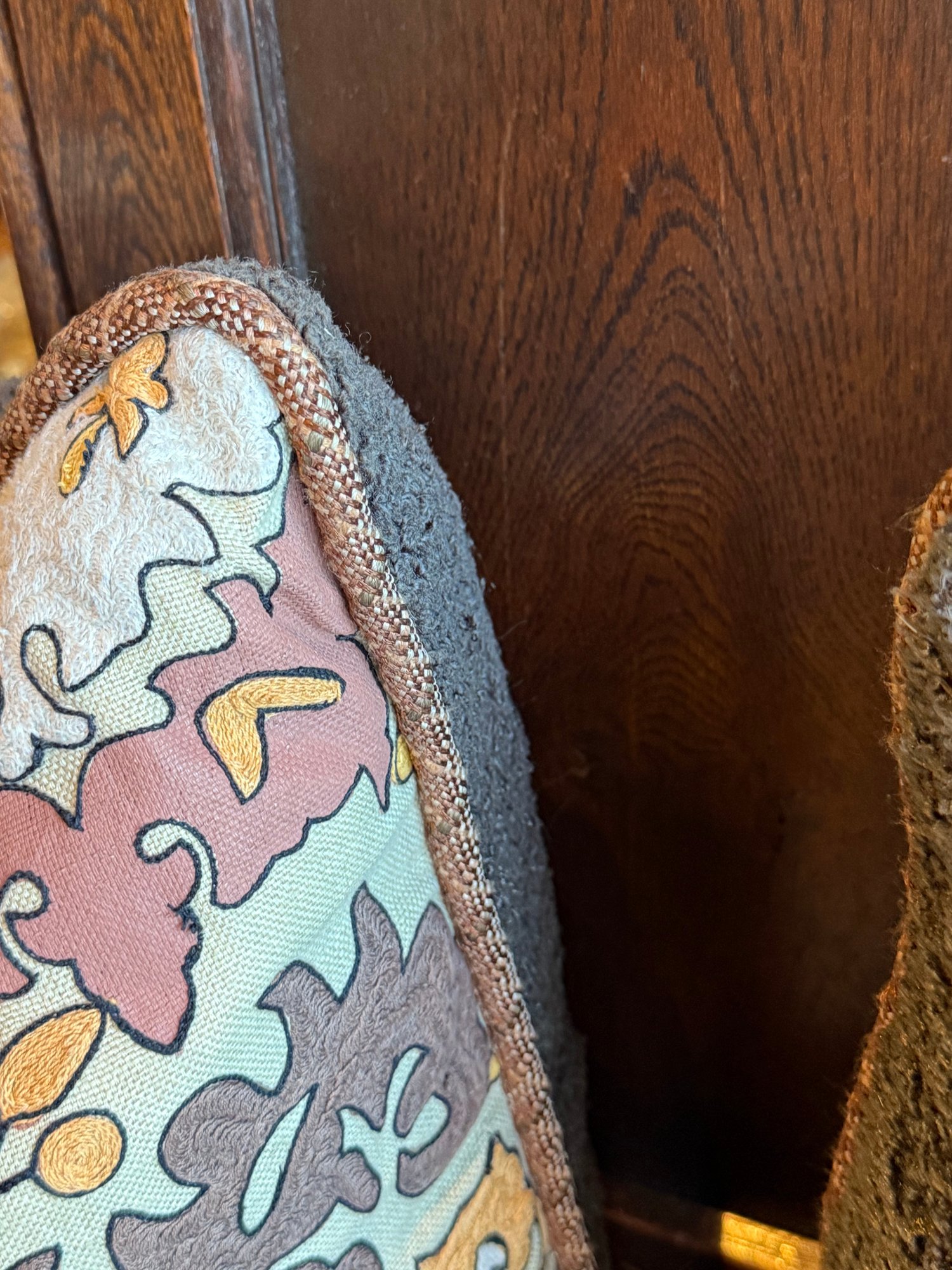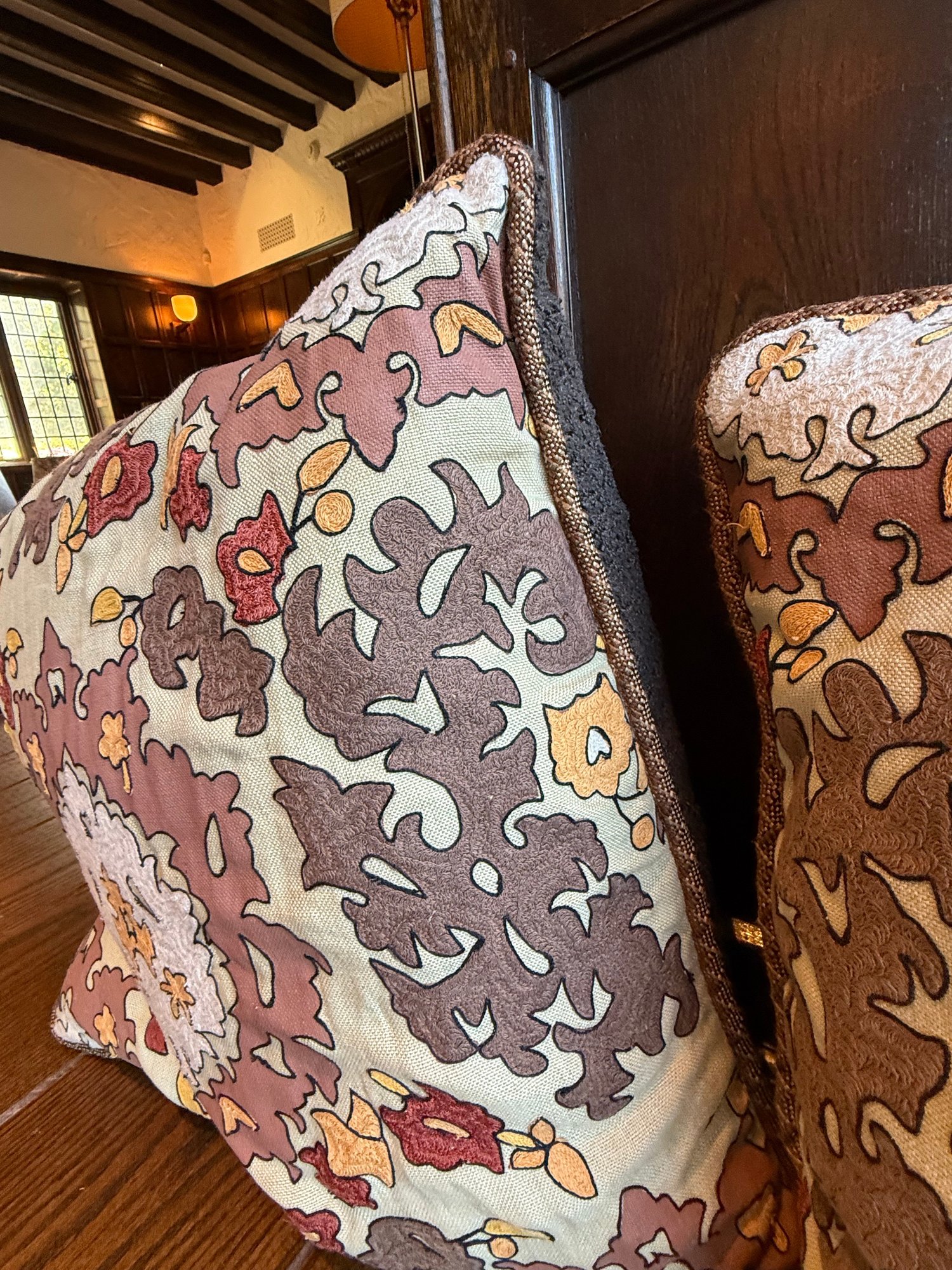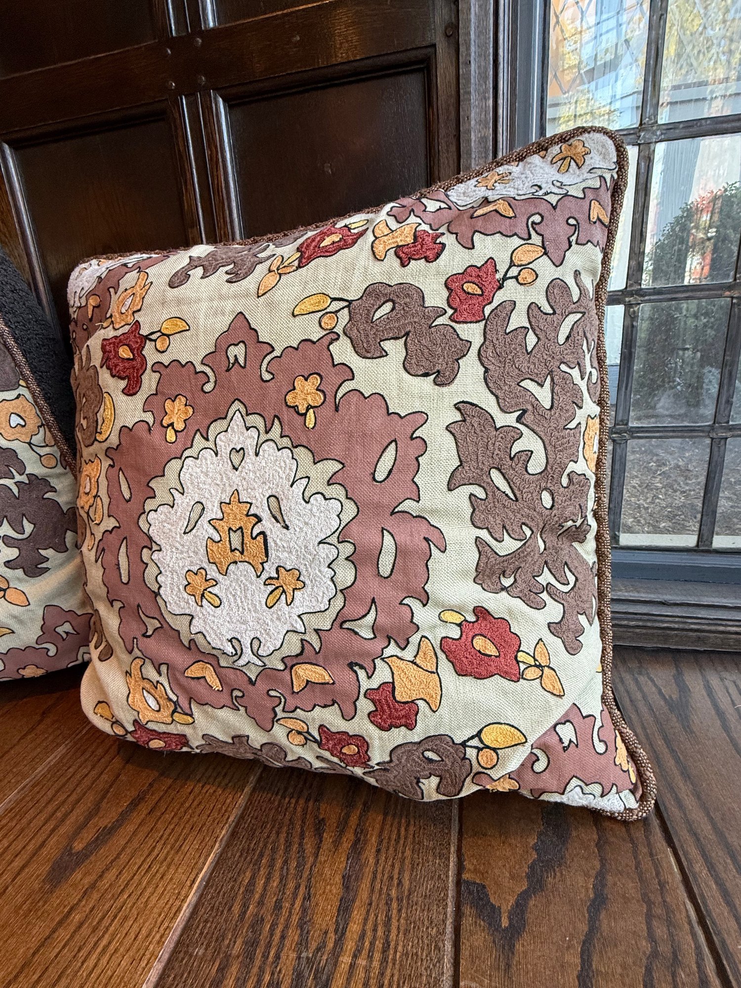 Pair of oversized square throw pillows, featuring a vintage-inspired autumnal floral tapestry pattern in warm brown, beige, and red tones.