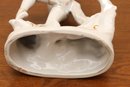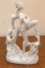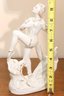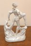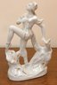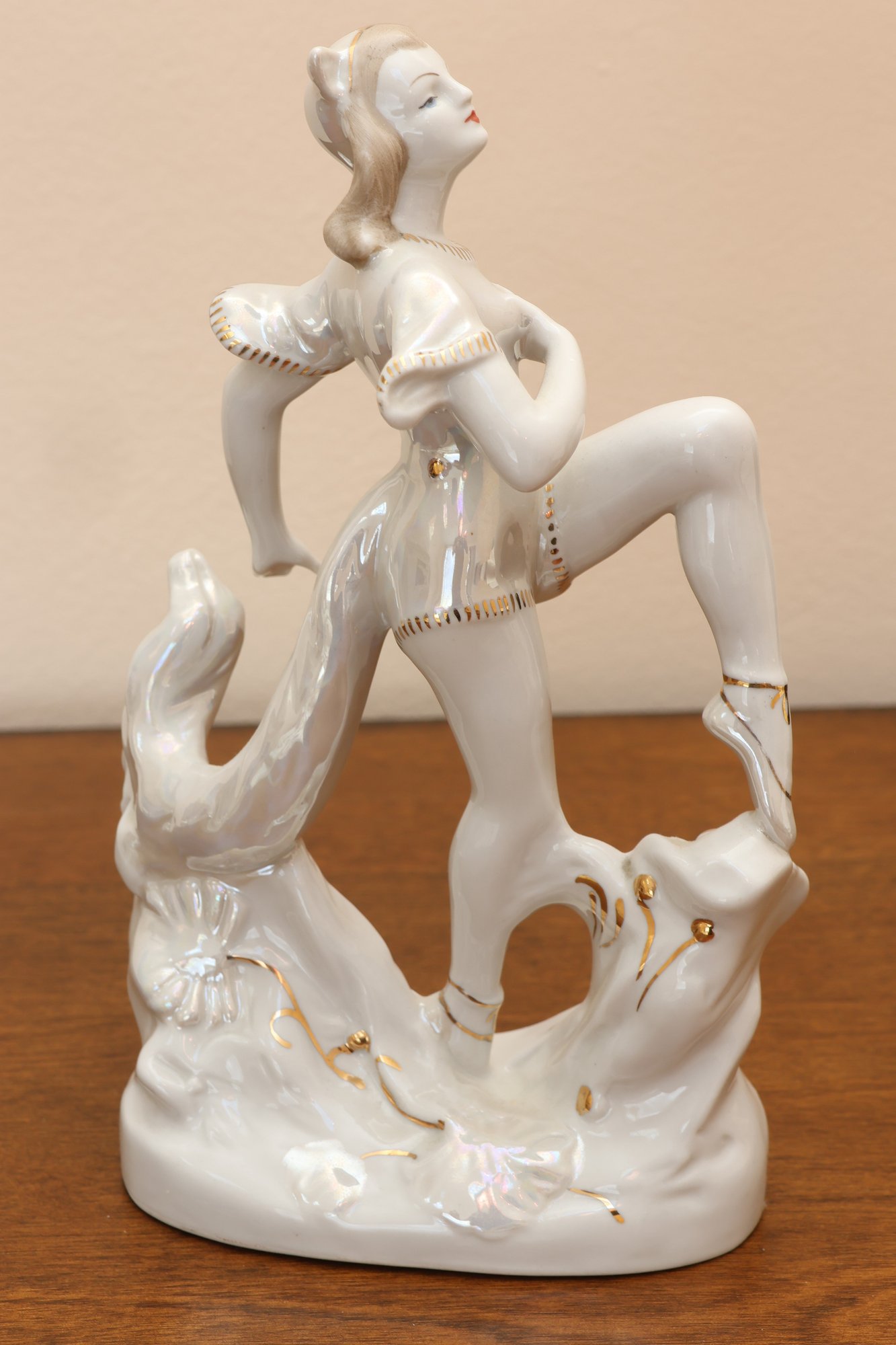 This is a white porcelain figurine depicting a female dancer in a dynamic pose. It features an iridescent luster glaze on parts of her clothing and the naturalistic base, accented with delicate gold detailing on her attire, hair, and the base's floral elements. The figurine appears to be in excellent structural integrity, showcasing fine craftsmanship.