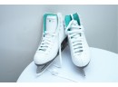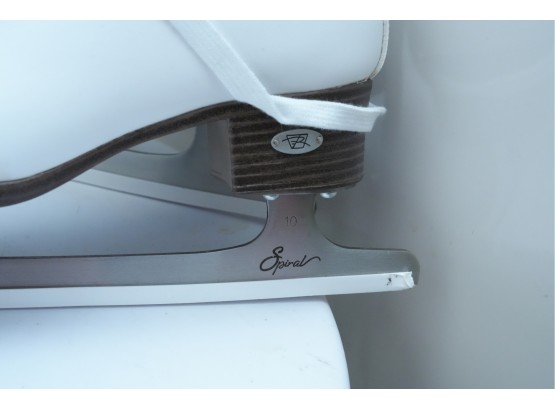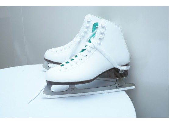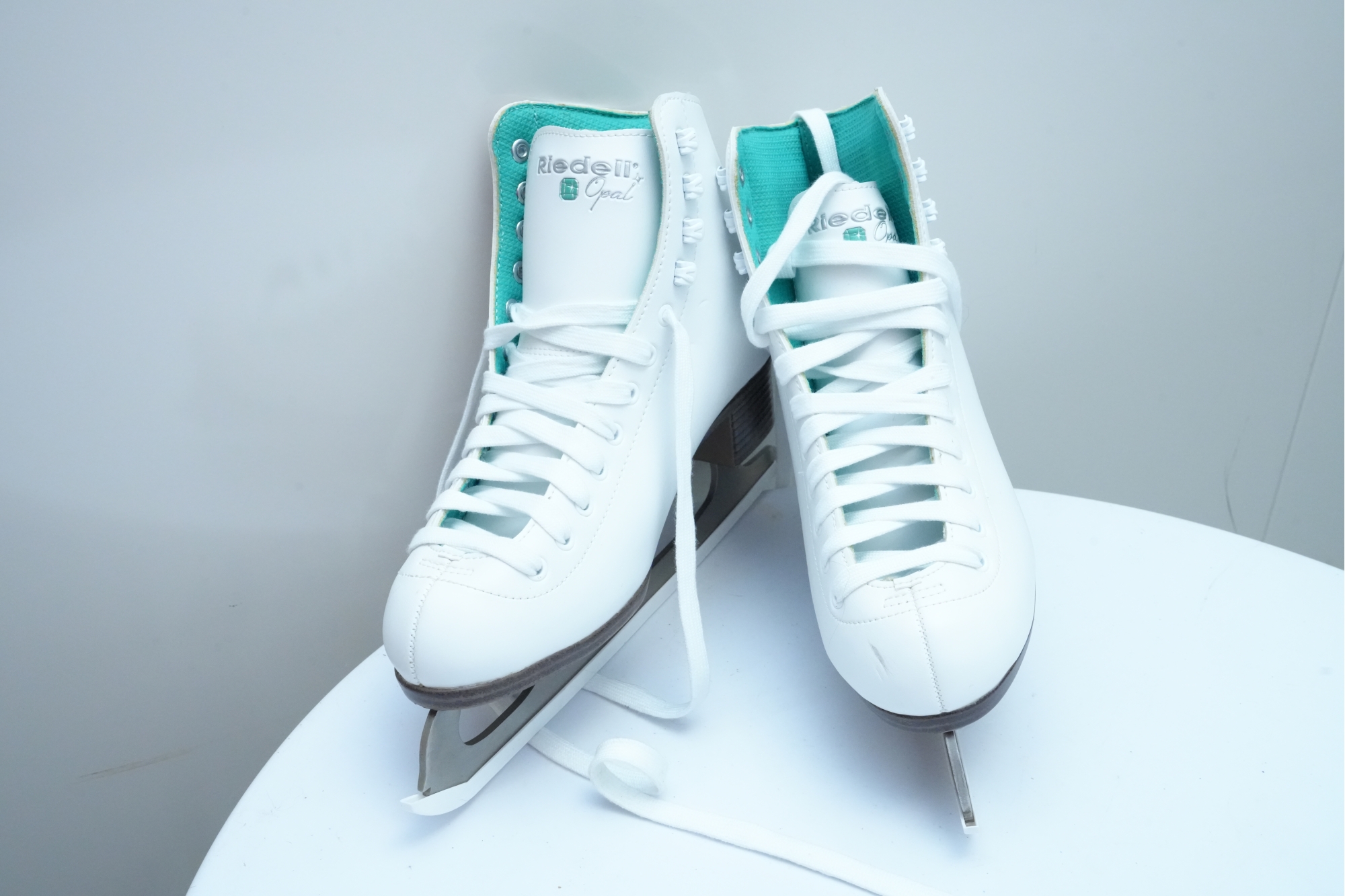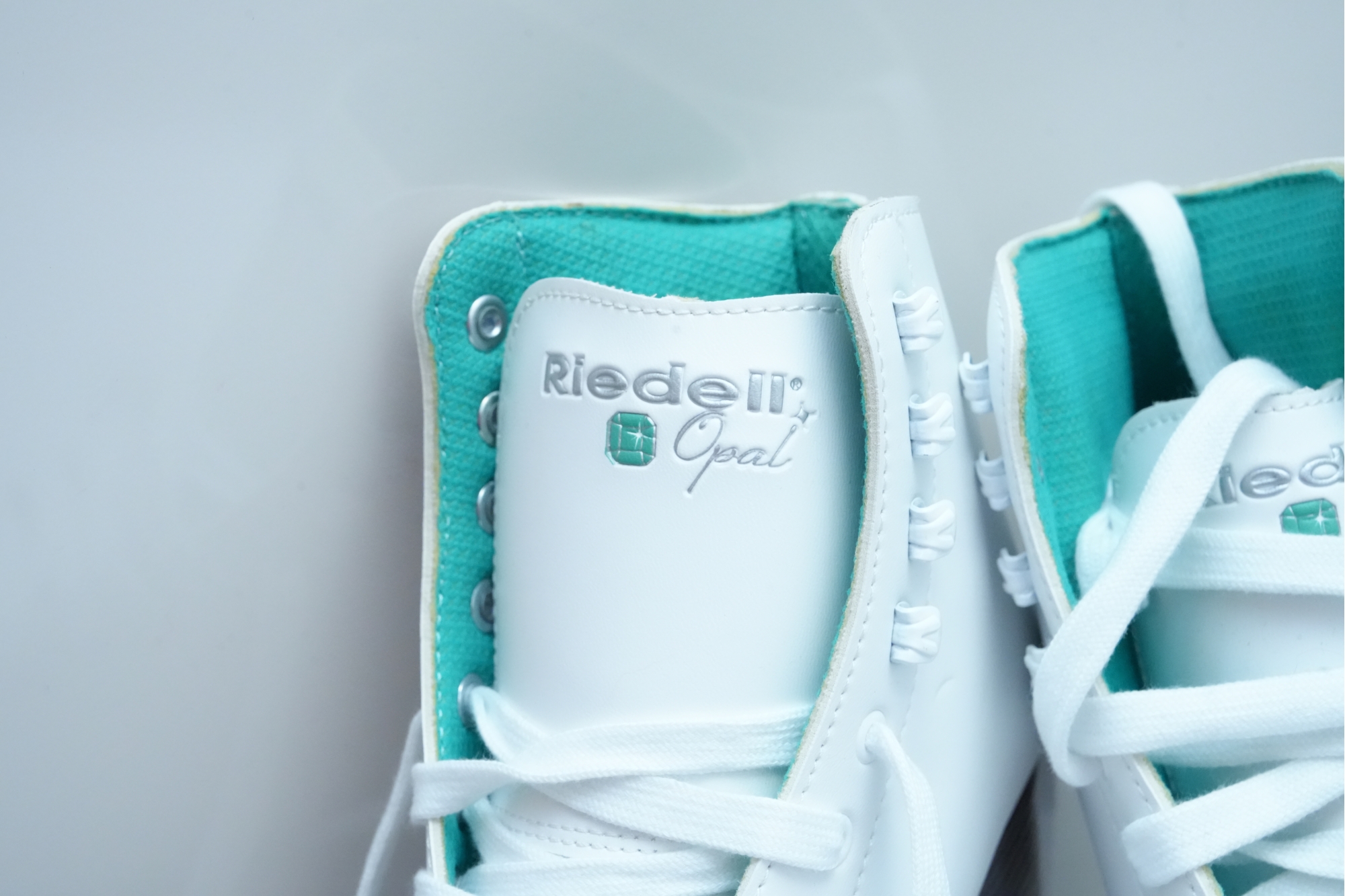 Riedell (U.S.A.) "110 Opal" women's figure skates in white, featuring synthetic uppers that provide light support and comfort. Label on inside of tongue marked "7," for "Women's 7."