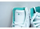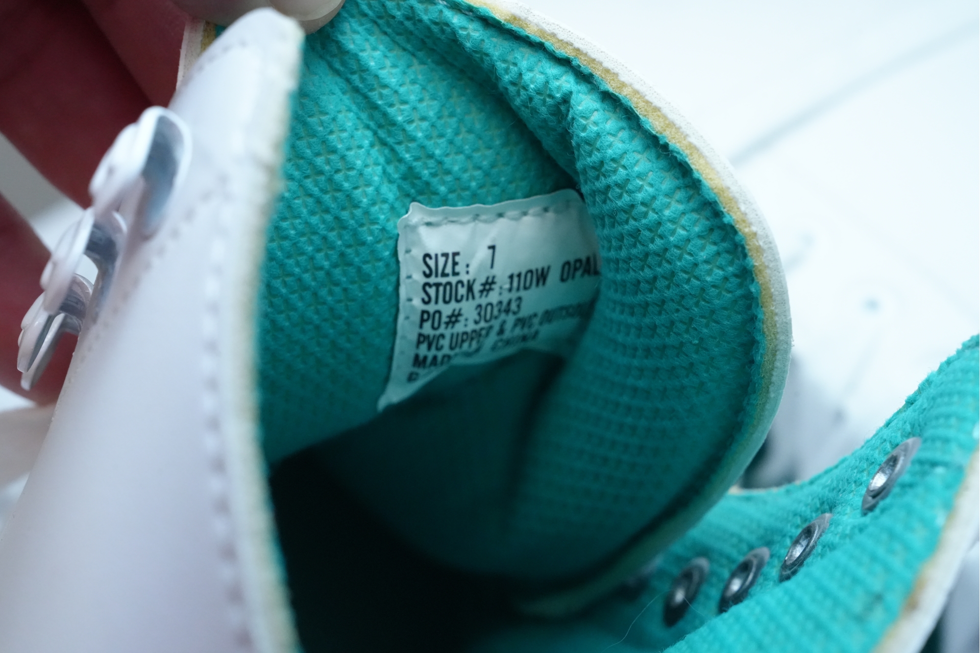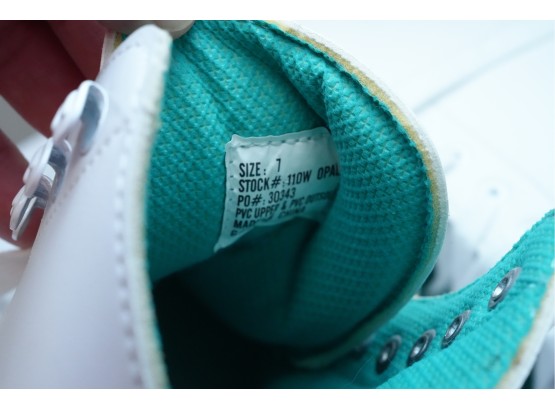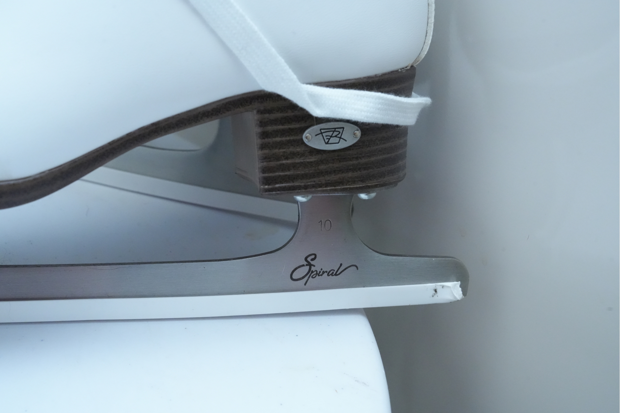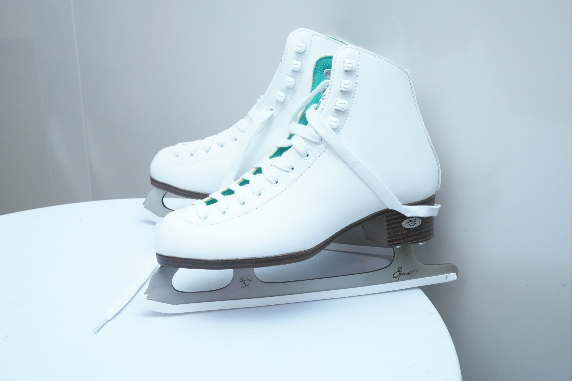 Riedell (U.S.A.) "110 Opal" women's figure skates in white, featuring synthetic uppers that provide light support and comfort. Label on inside of tongue marked "7," for "Women's 7."