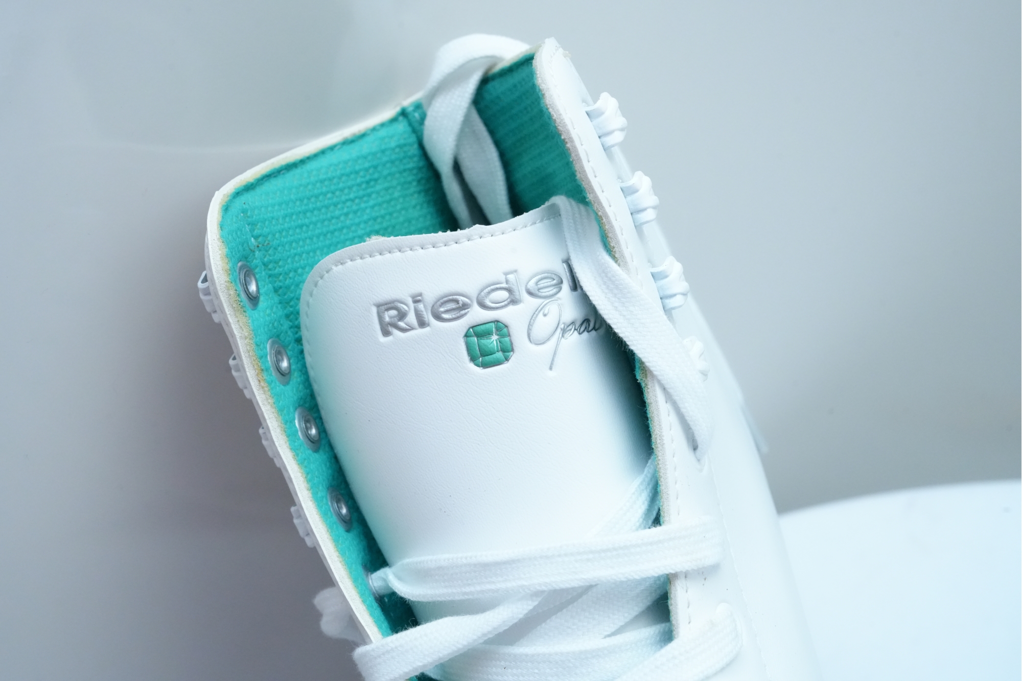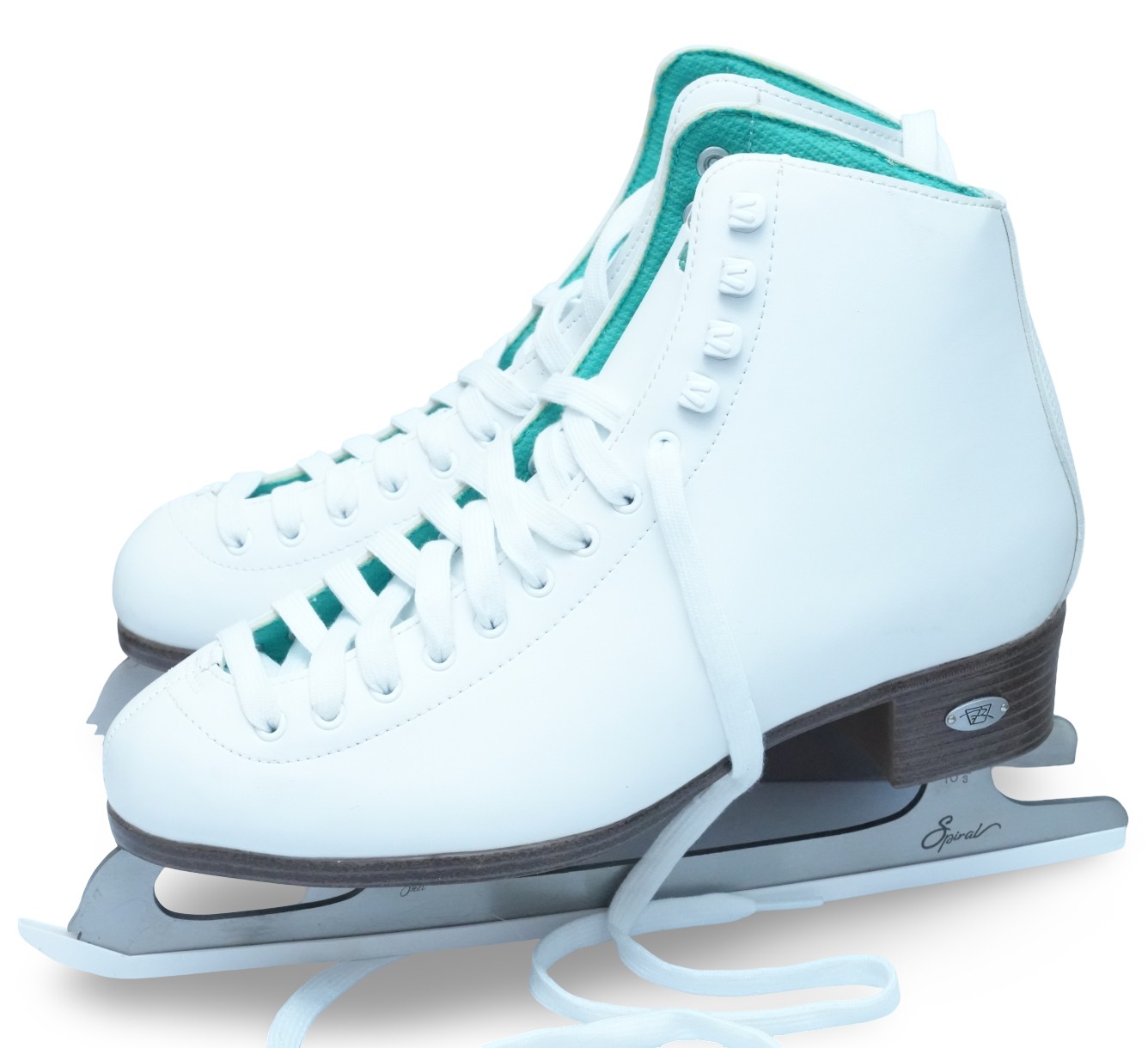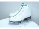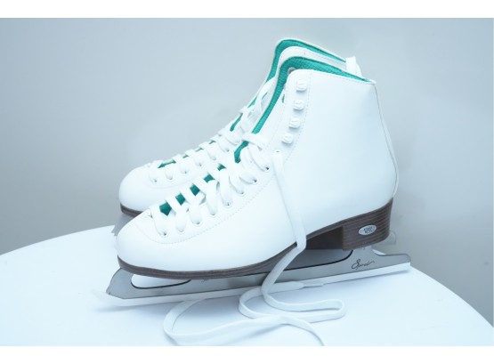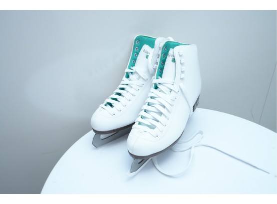 Riedell (U.S.A.) "110 Opal" women's figure skates in white, featuring synthetic uppers that provide light support and comfort. Label on inside of tongue marked "9," for "Women's 9."