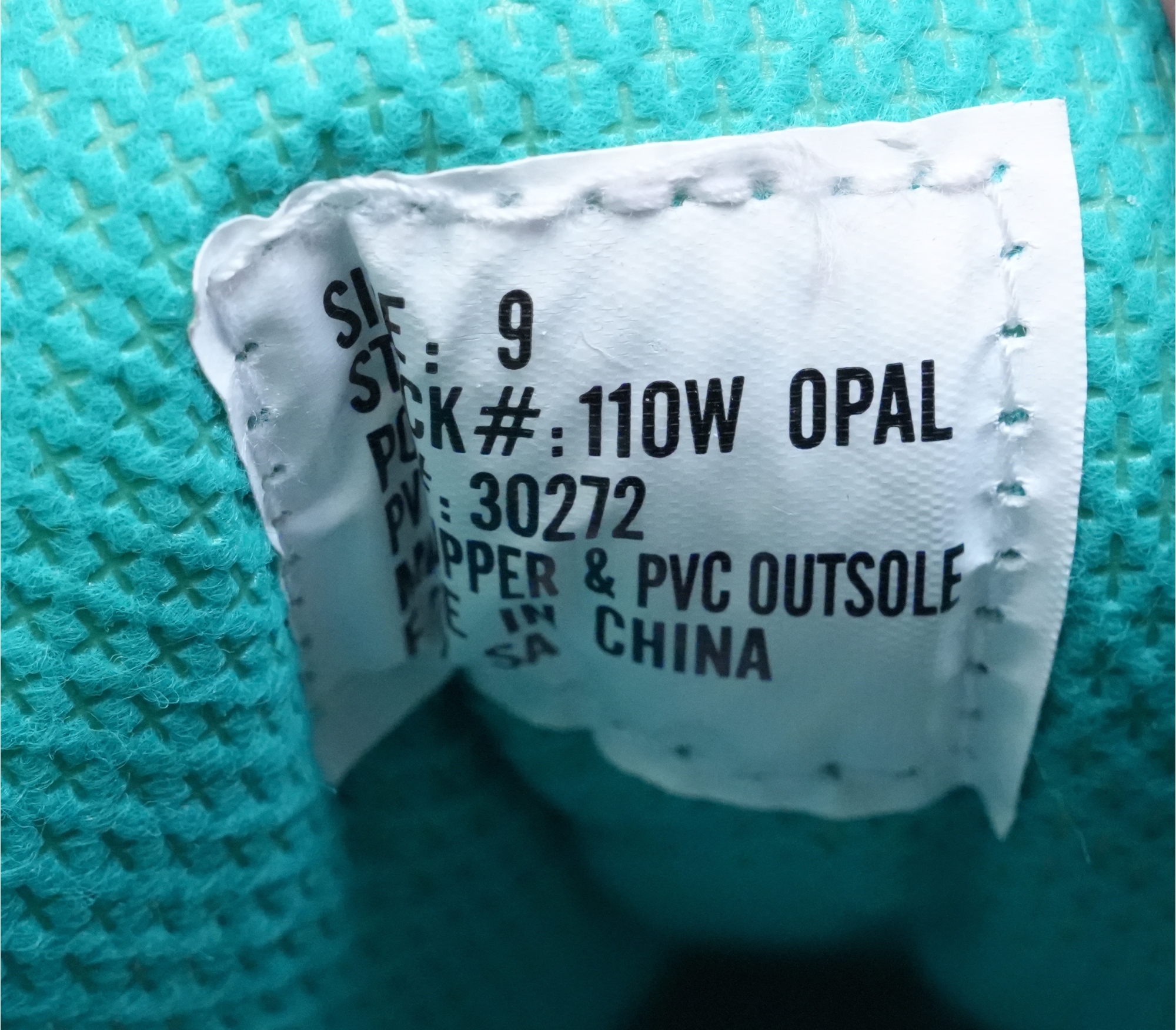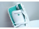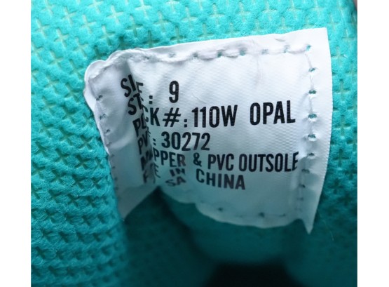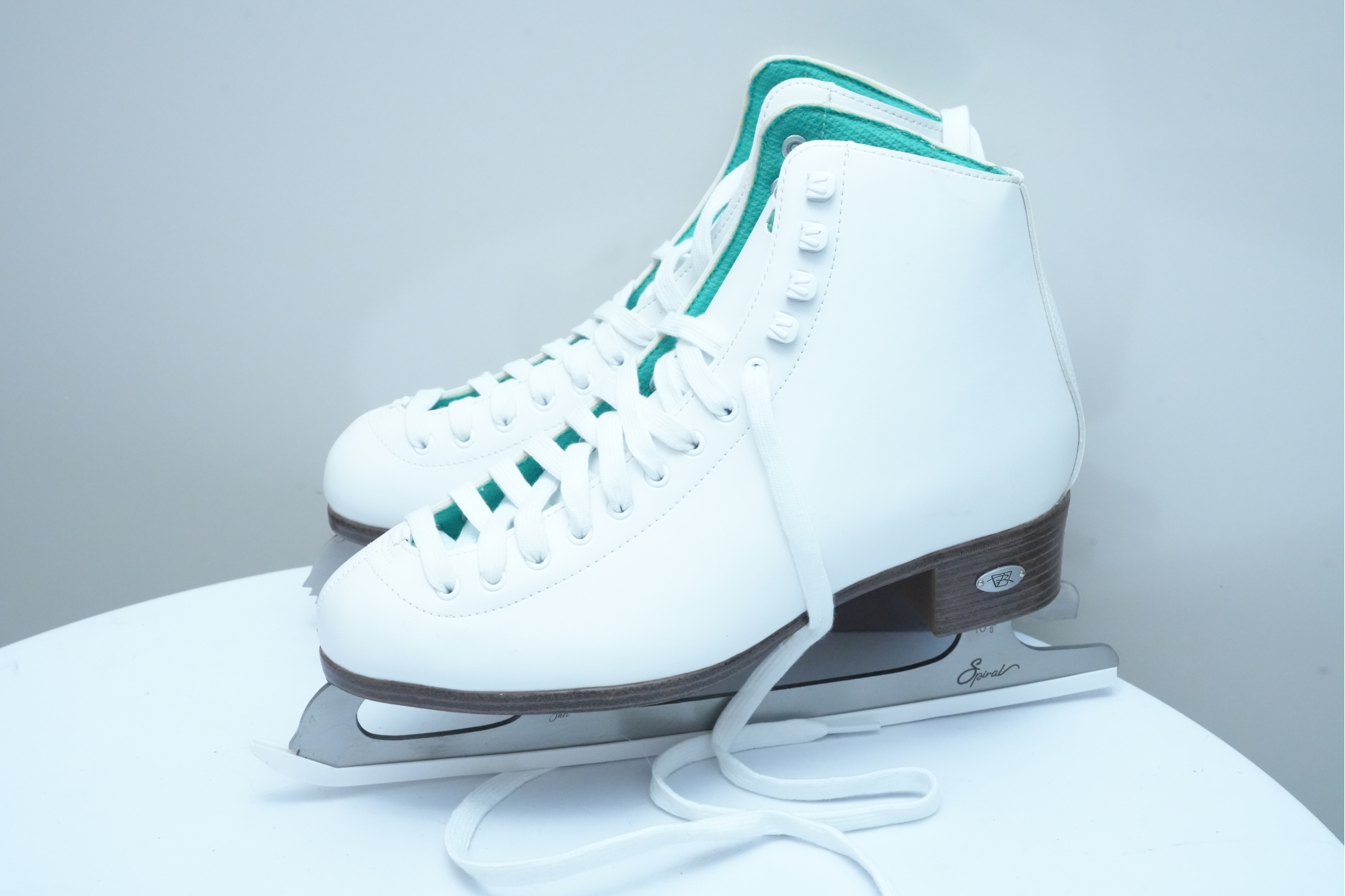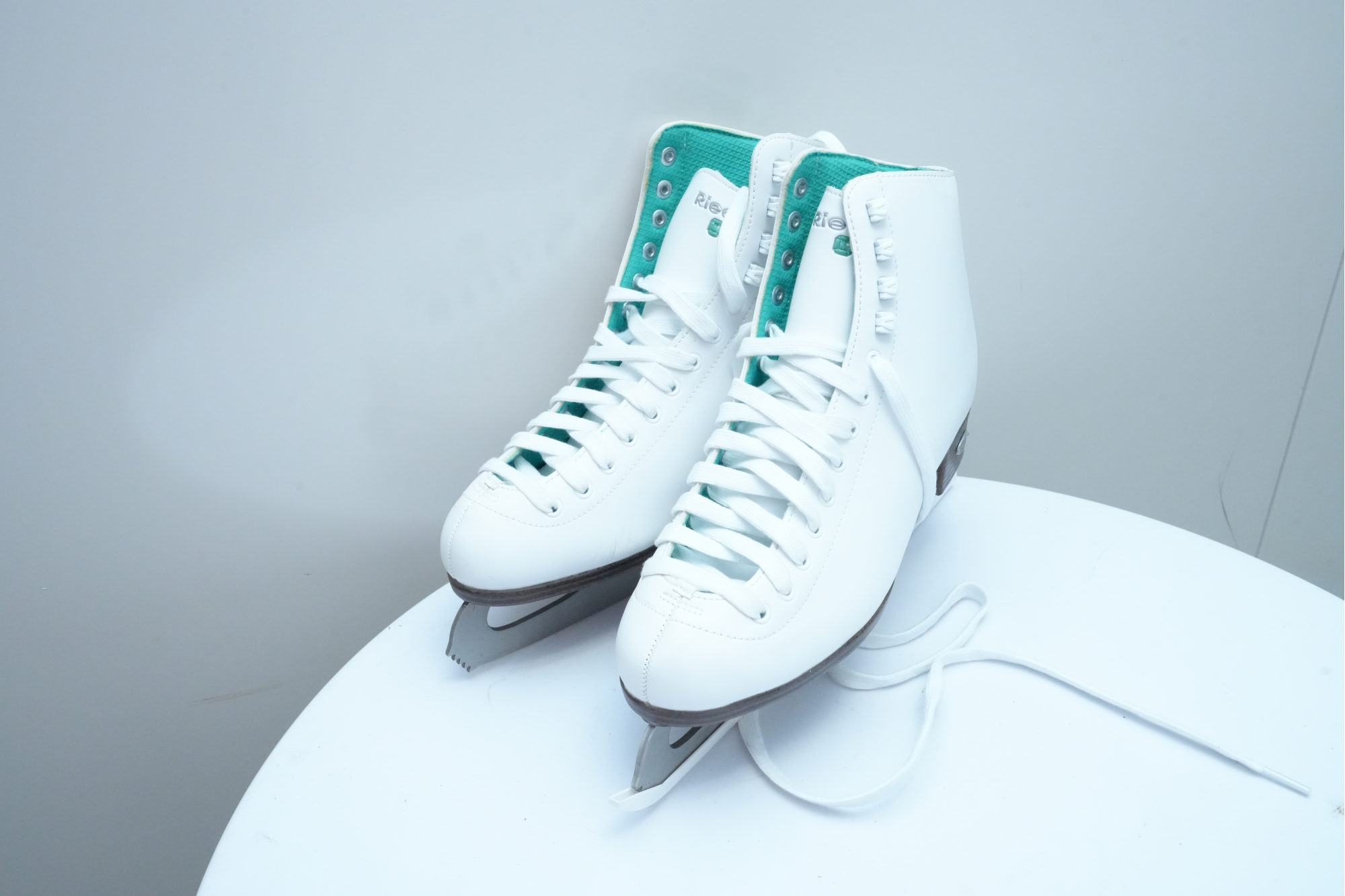 Riedell (U.S.A.) "110 Opal" women's figure skates in white, featuring synthetic uppers that provide light support and comfort. Label on inside of tongue marked "9," for "Women's 9."