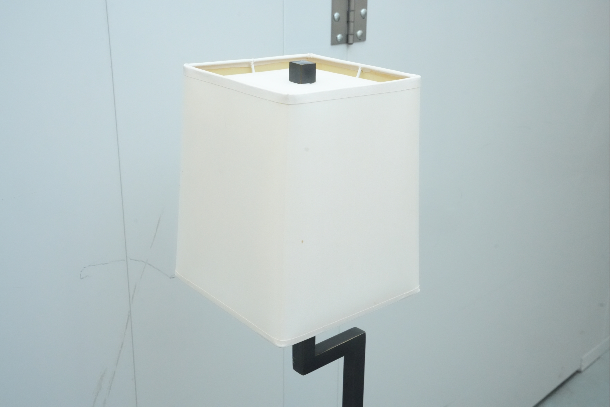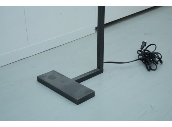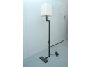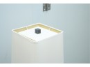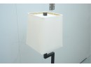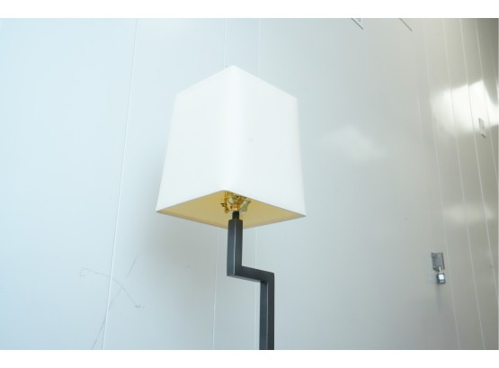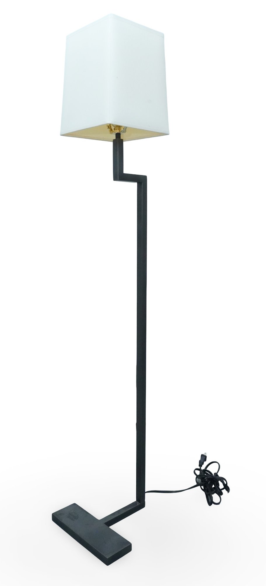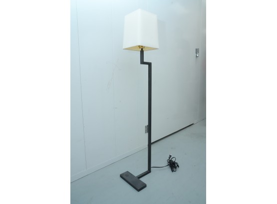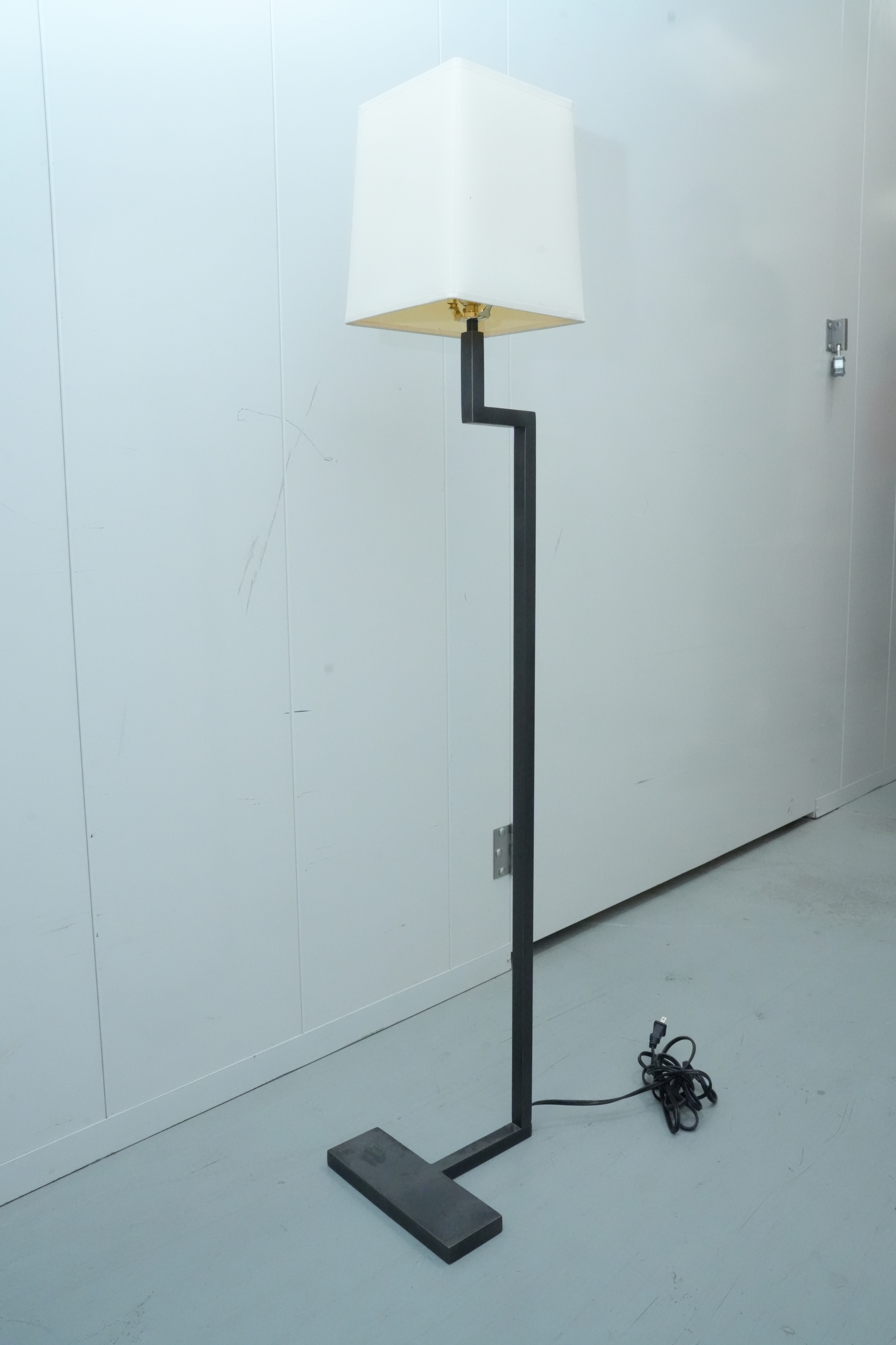 Robert Abbey (U.S.A.) "Doughnut Collection" C-shaped floor lamp with rectangular white lampshade with top diffusion panel and dimmerswitch.