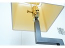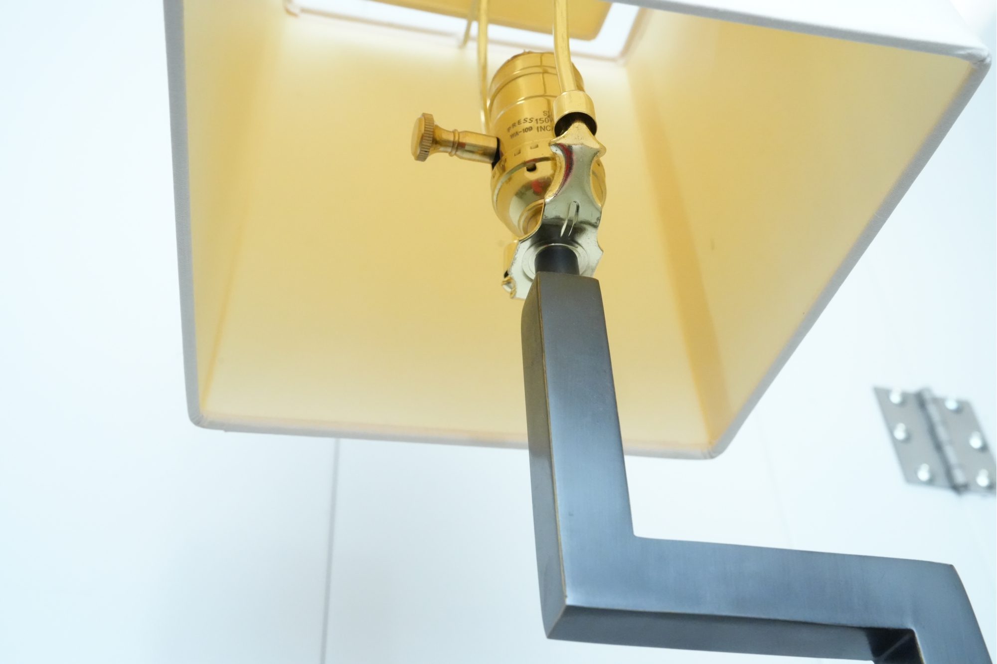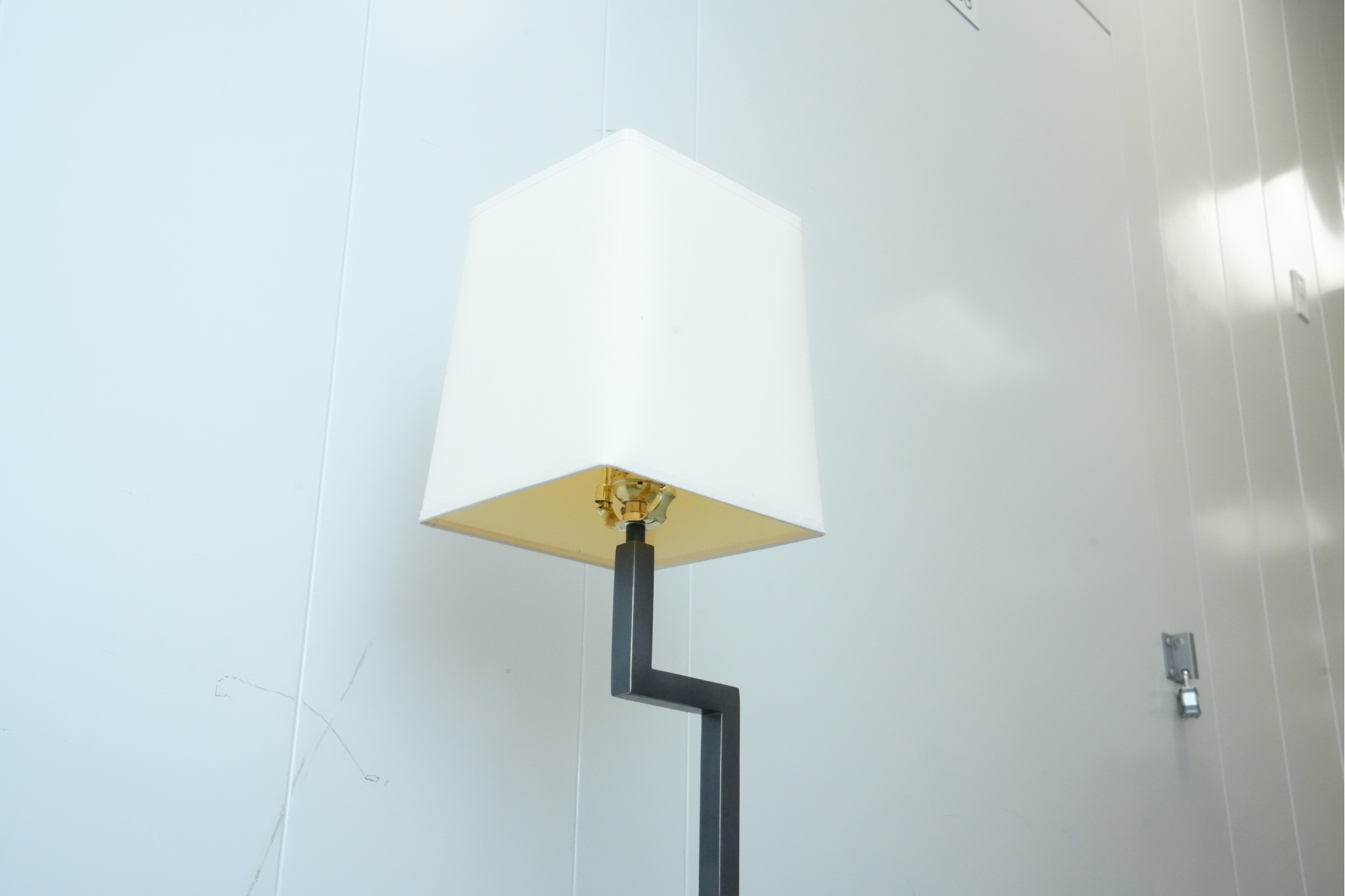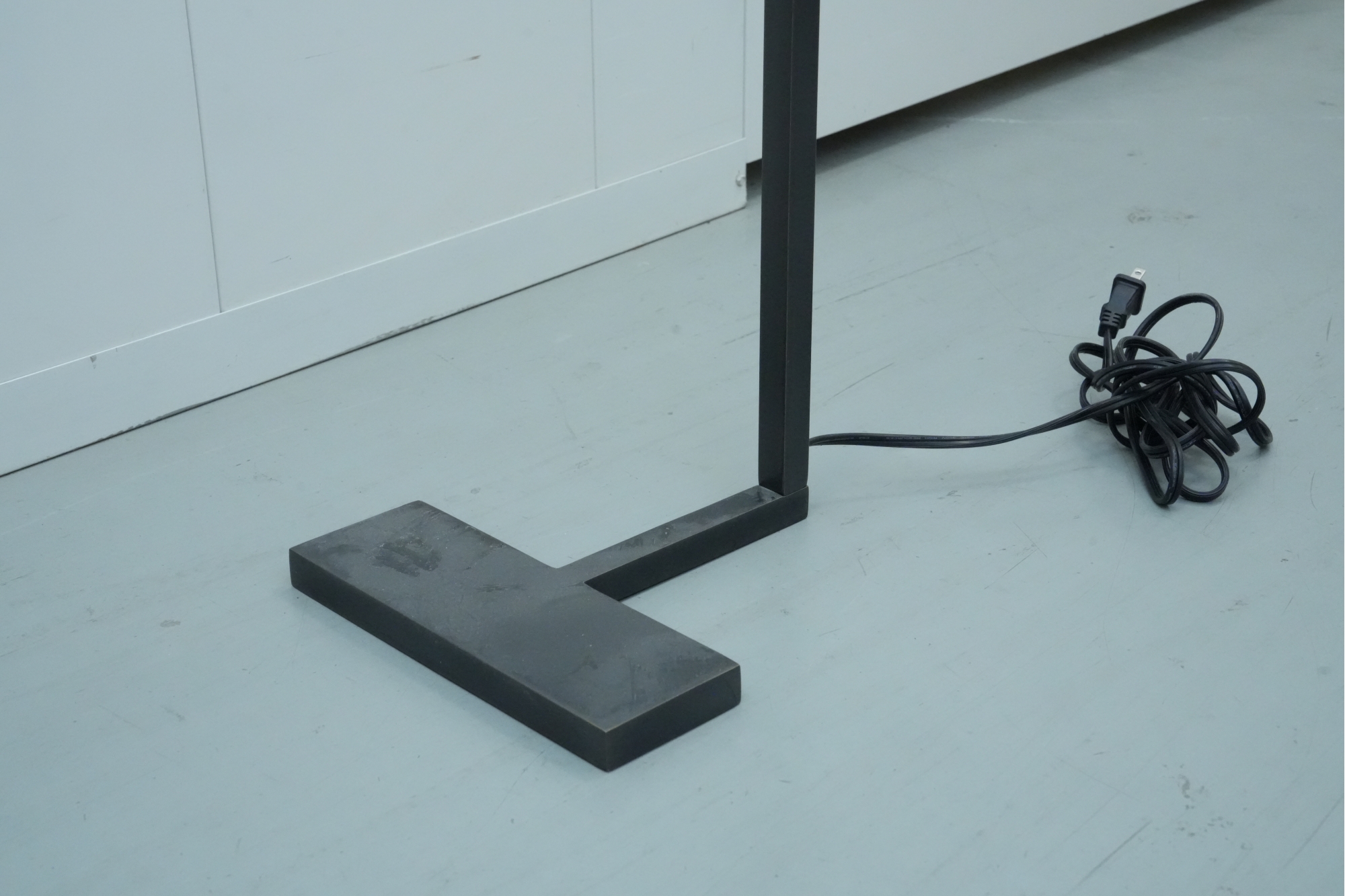 Robert Abbey (U.S.A.) "Doughnut Collection" C-shaped floor lamp with rectangular white lampshade with top diffusion panel and dimmerswitch.