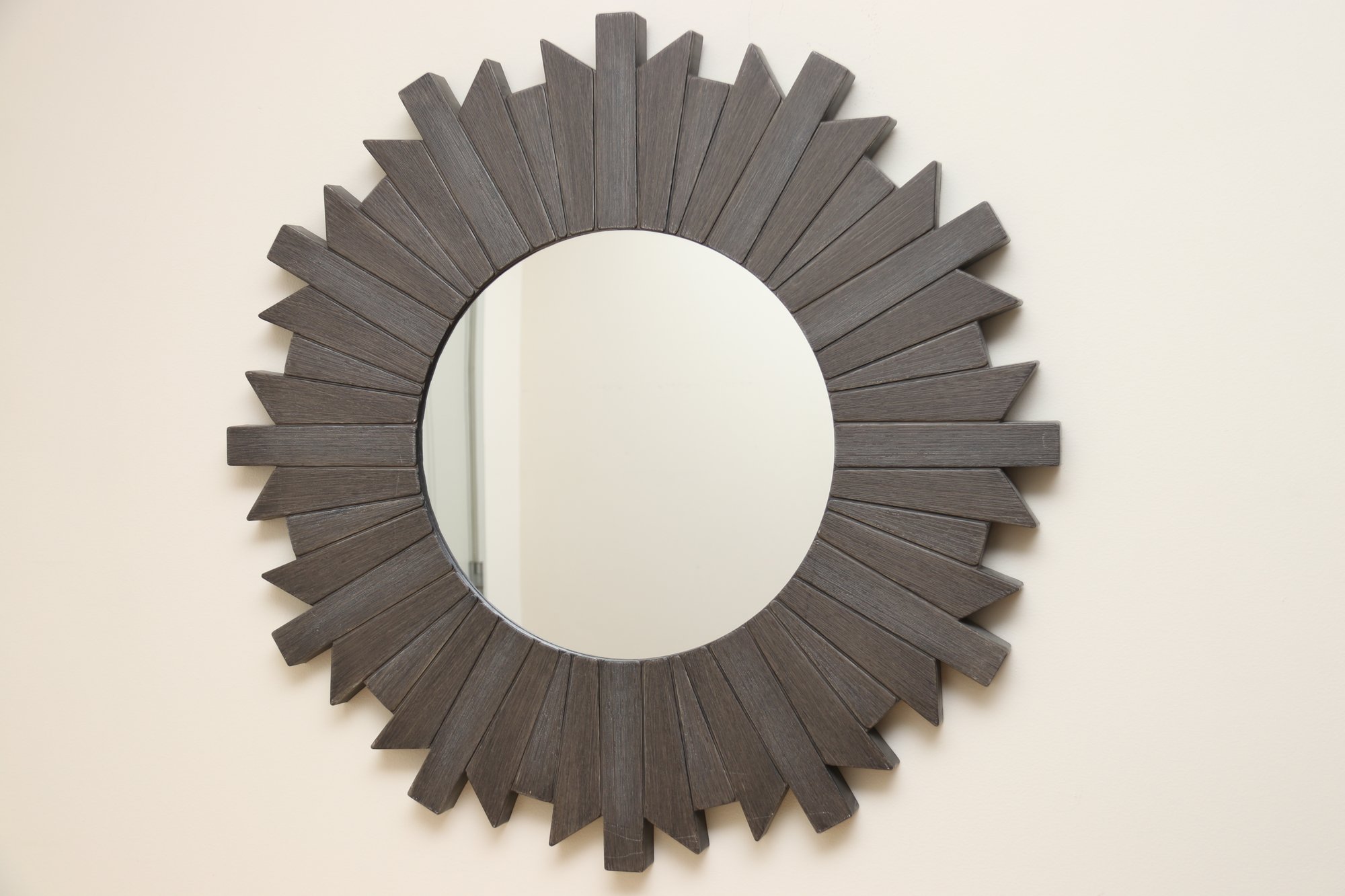Gray faux wood frame on a round mirror.
