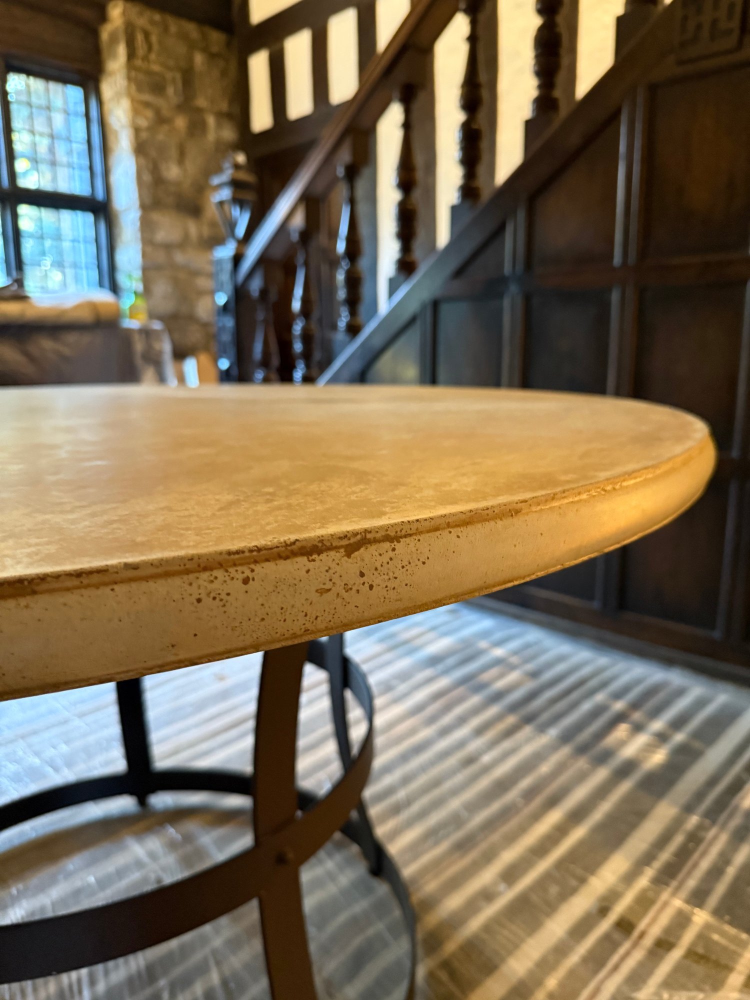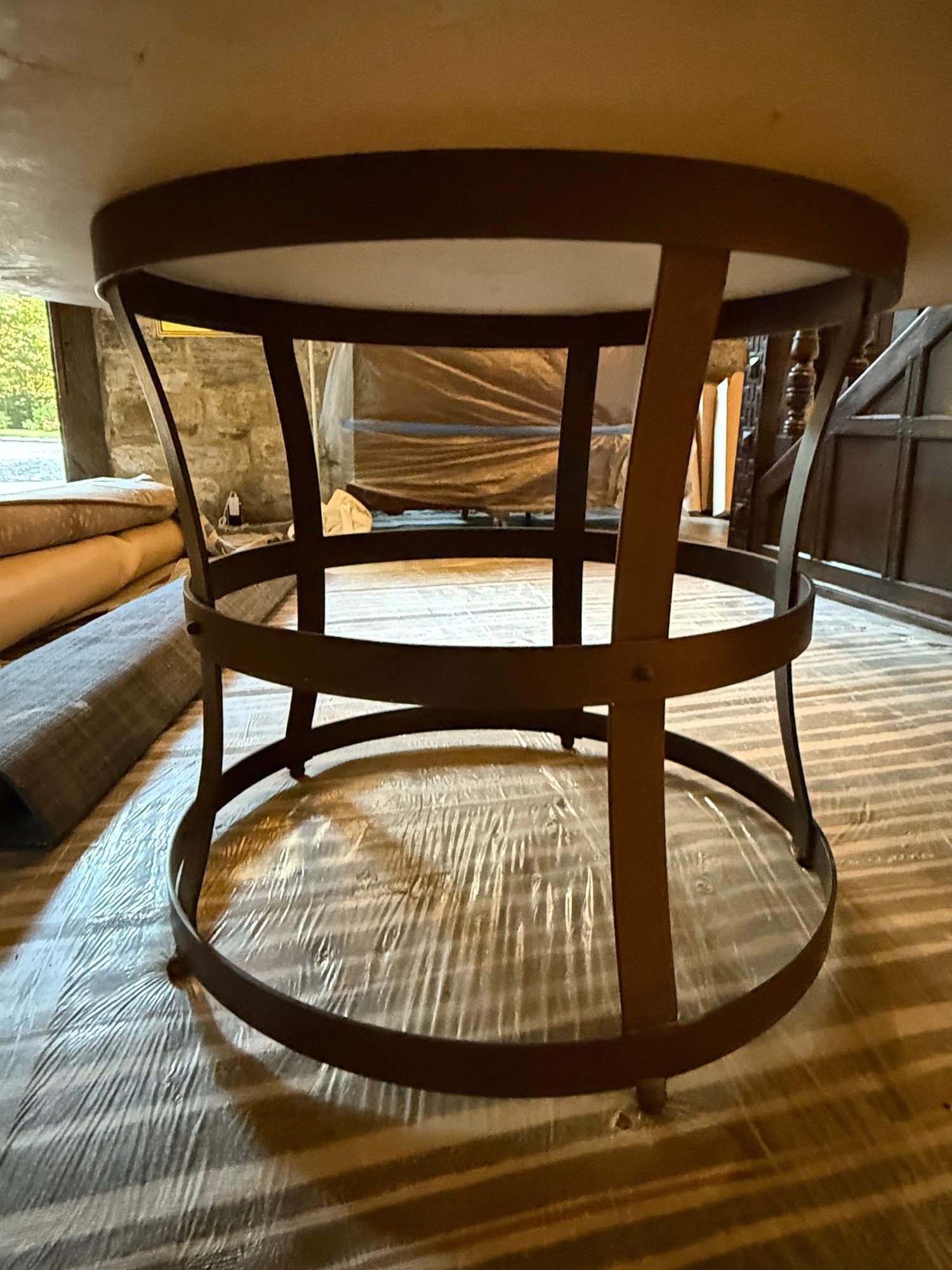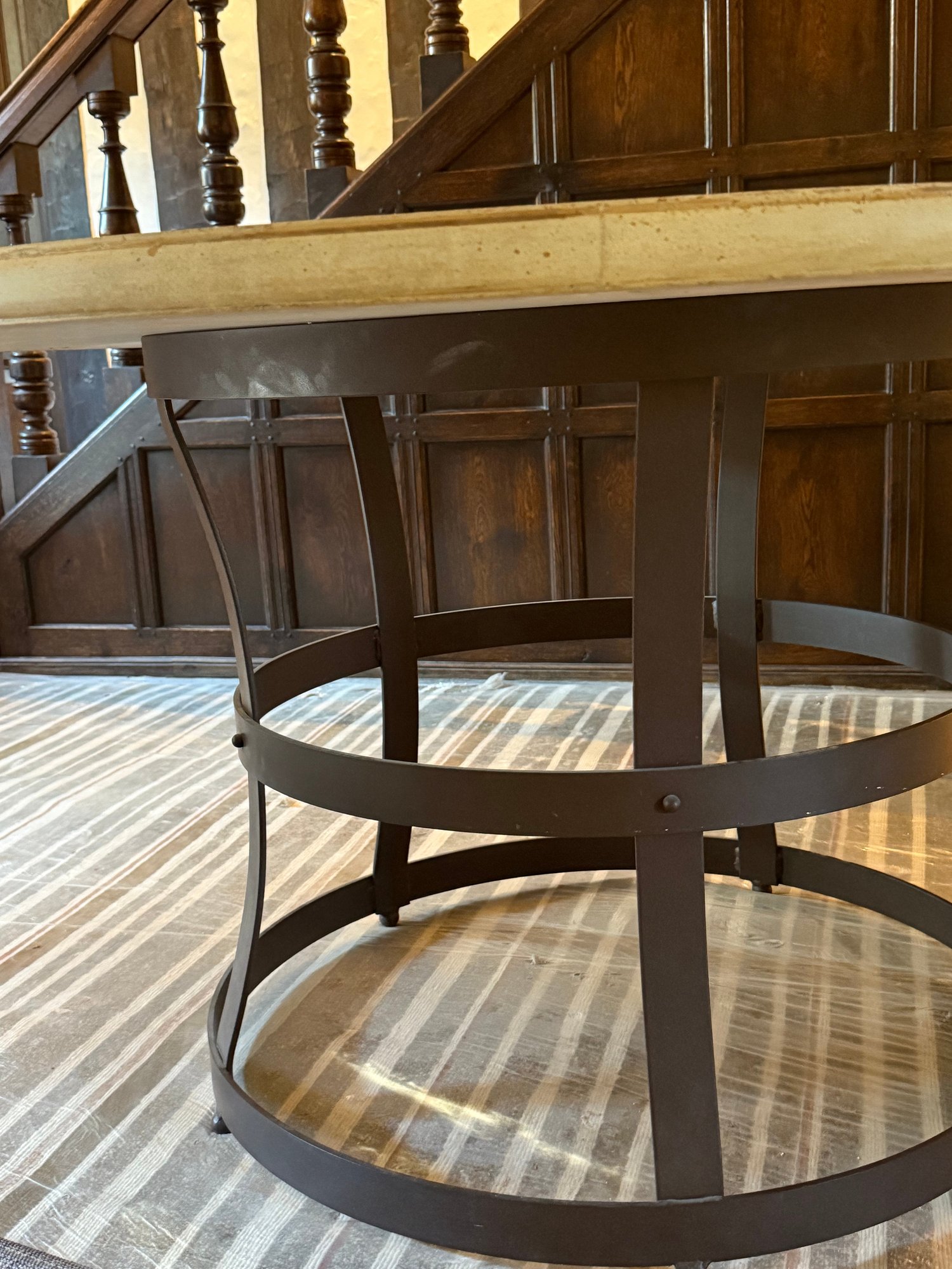 Contemporary round table featuring a thick top supported by curved vertical struts and dual circular bands, for an industrial-inspired design.