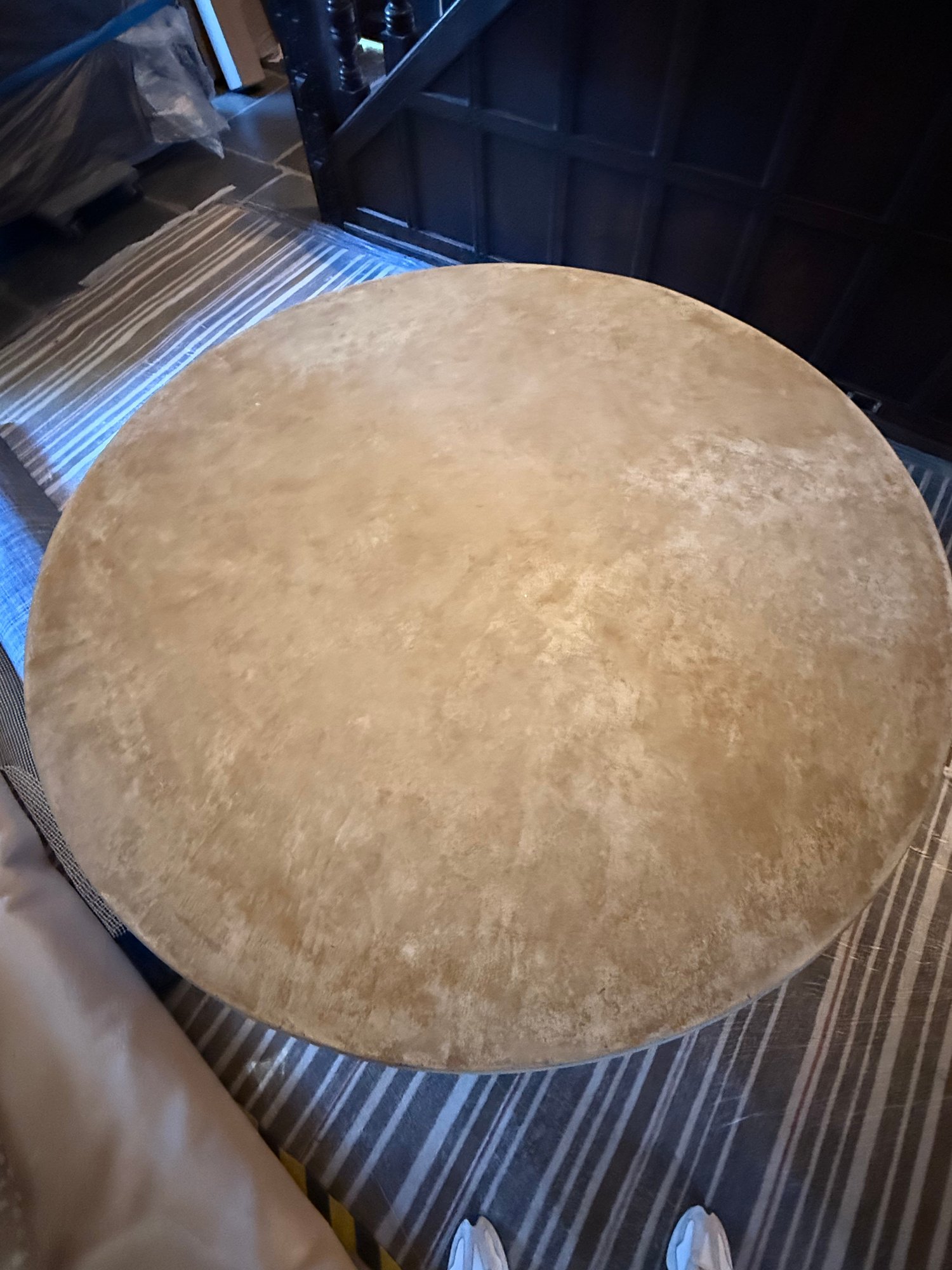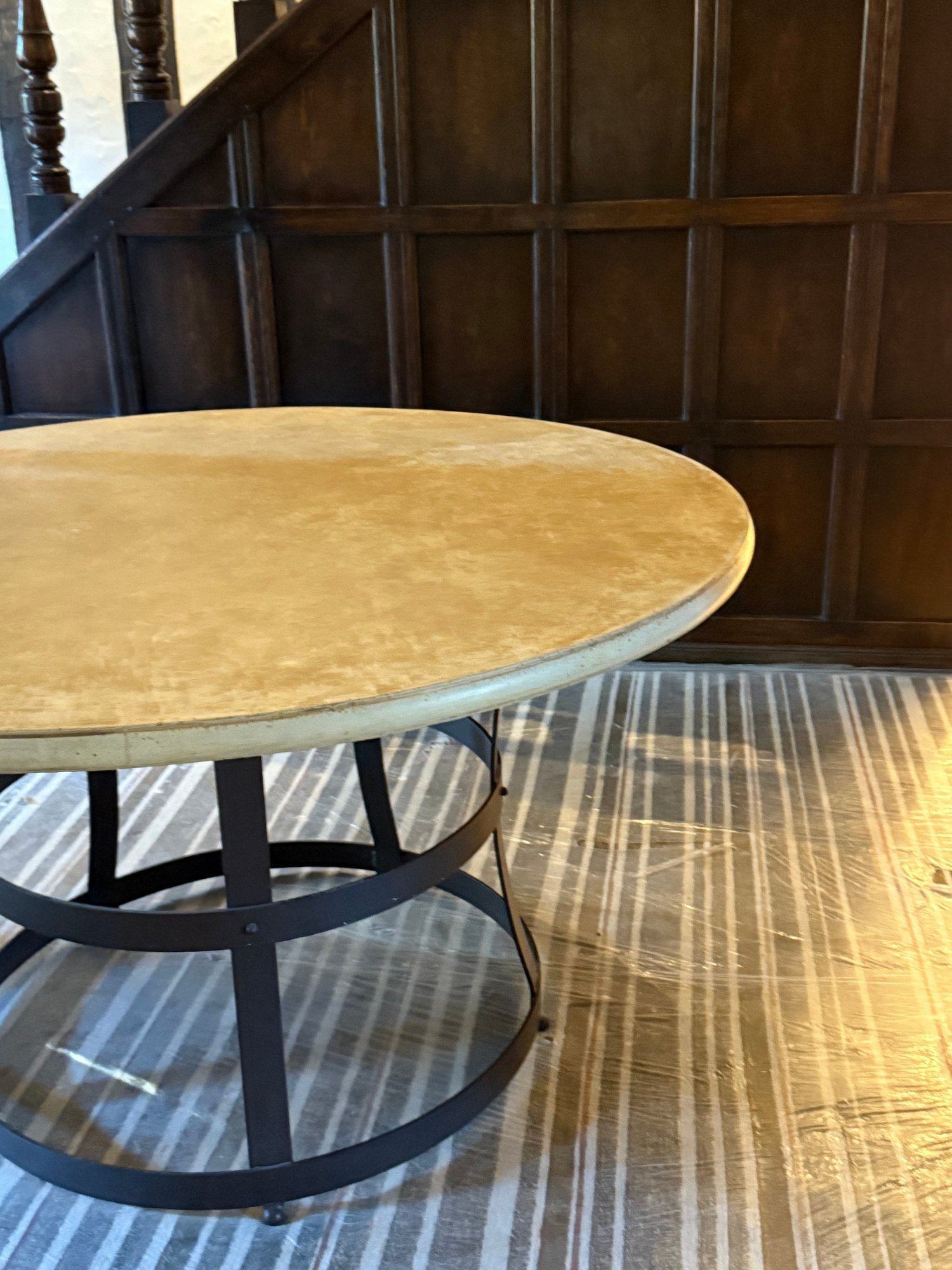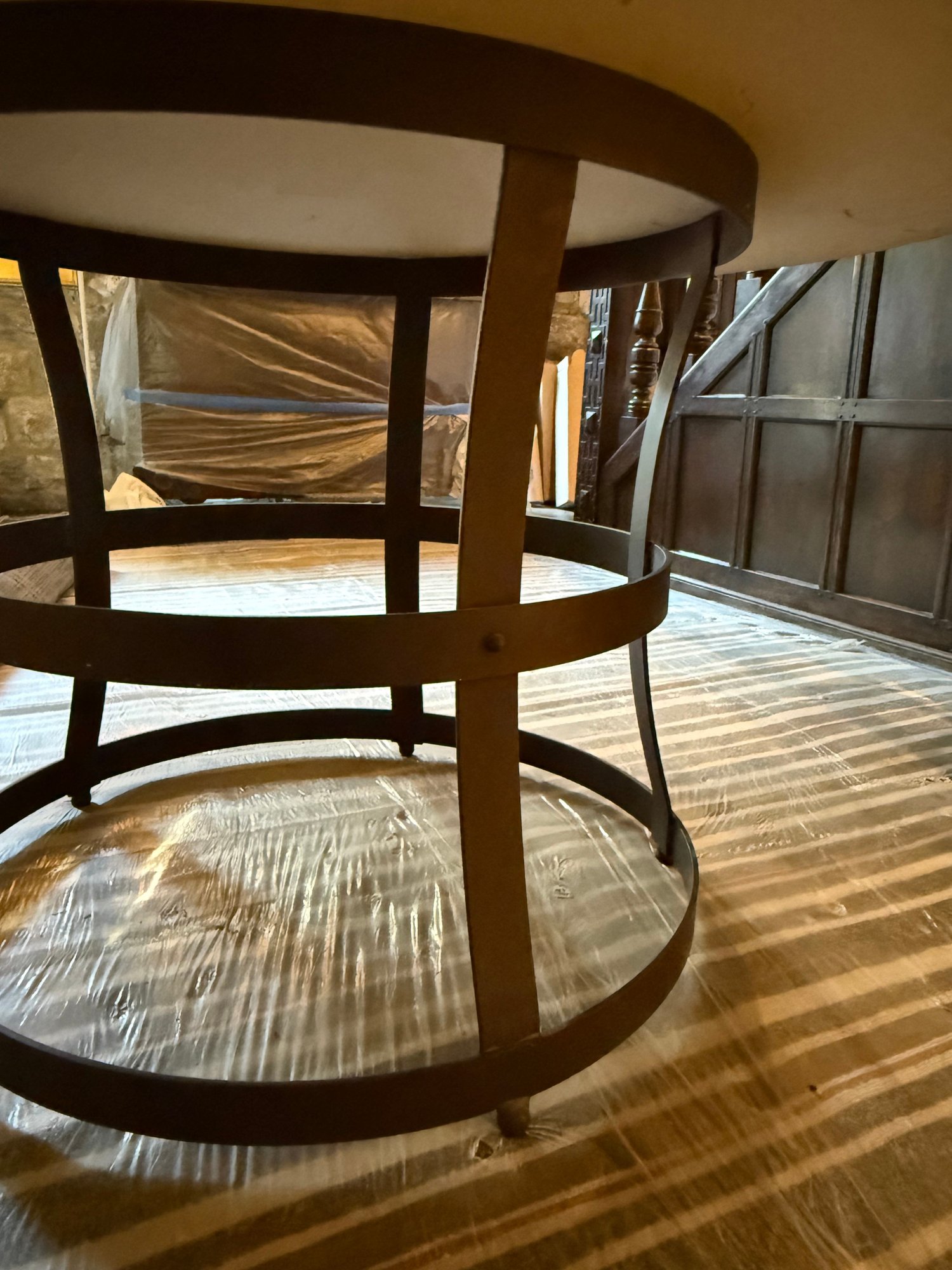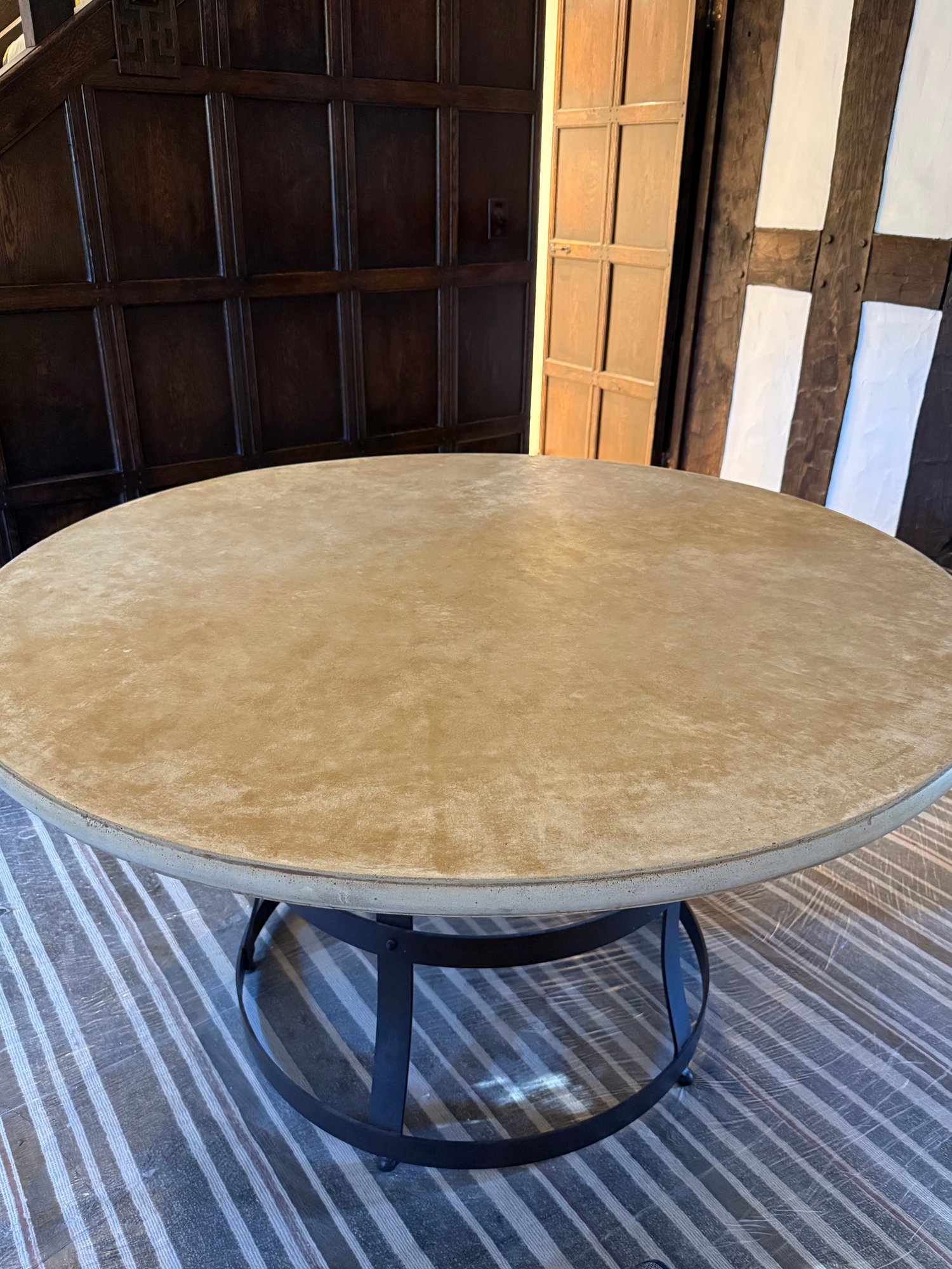 Contemporary round table featuring a thick top supported by curved vertical struts and dual circular bands, for an industrial-inspired design.