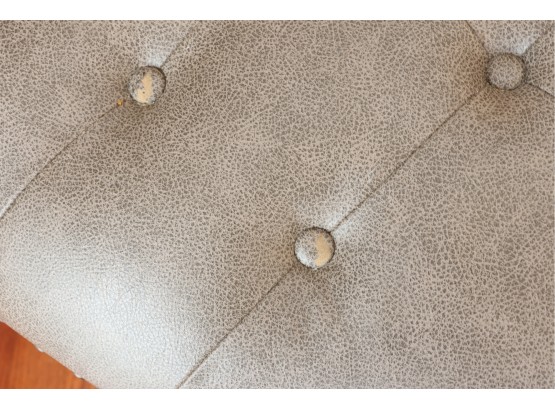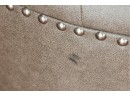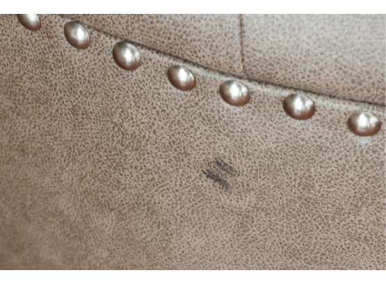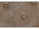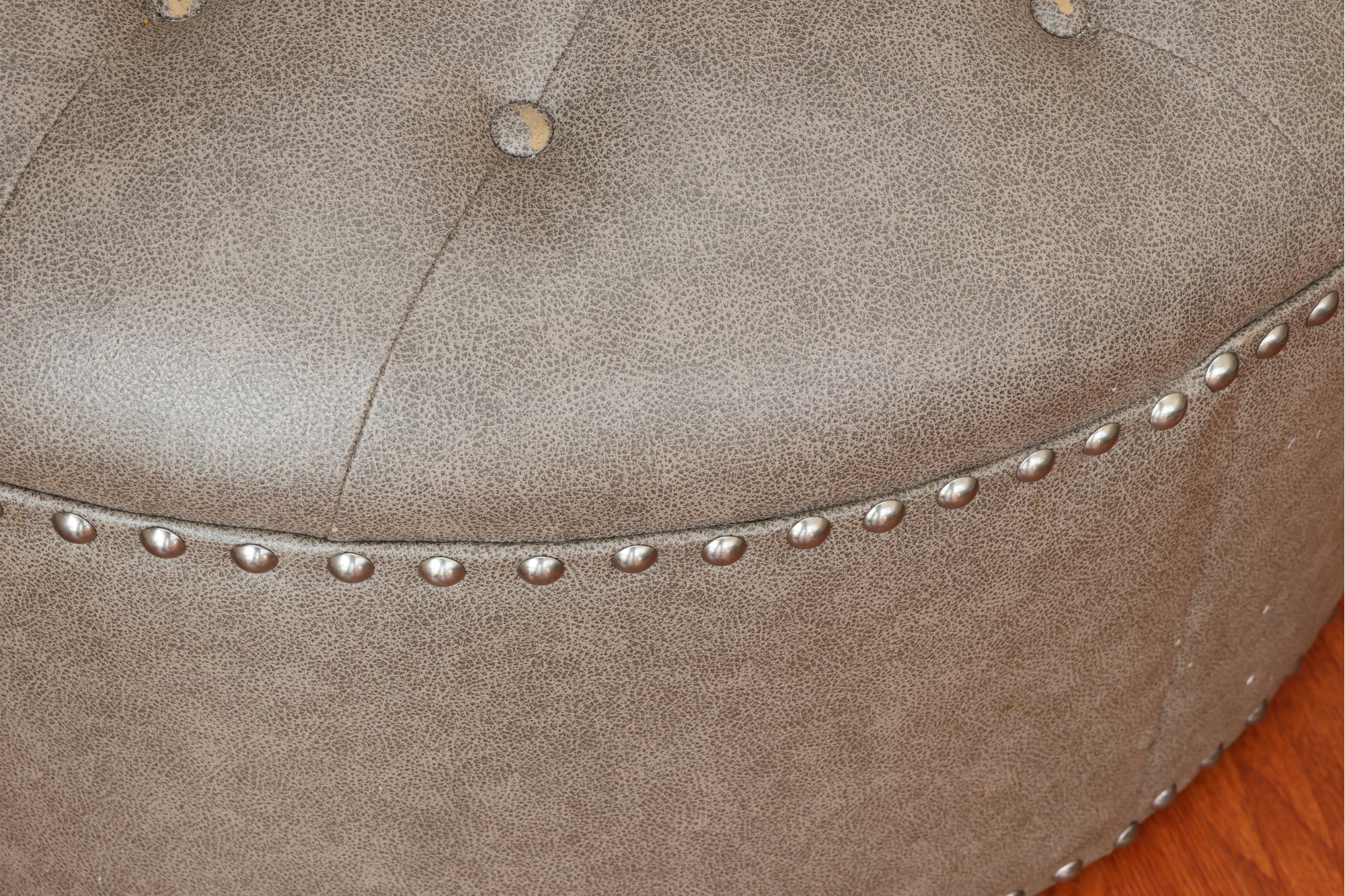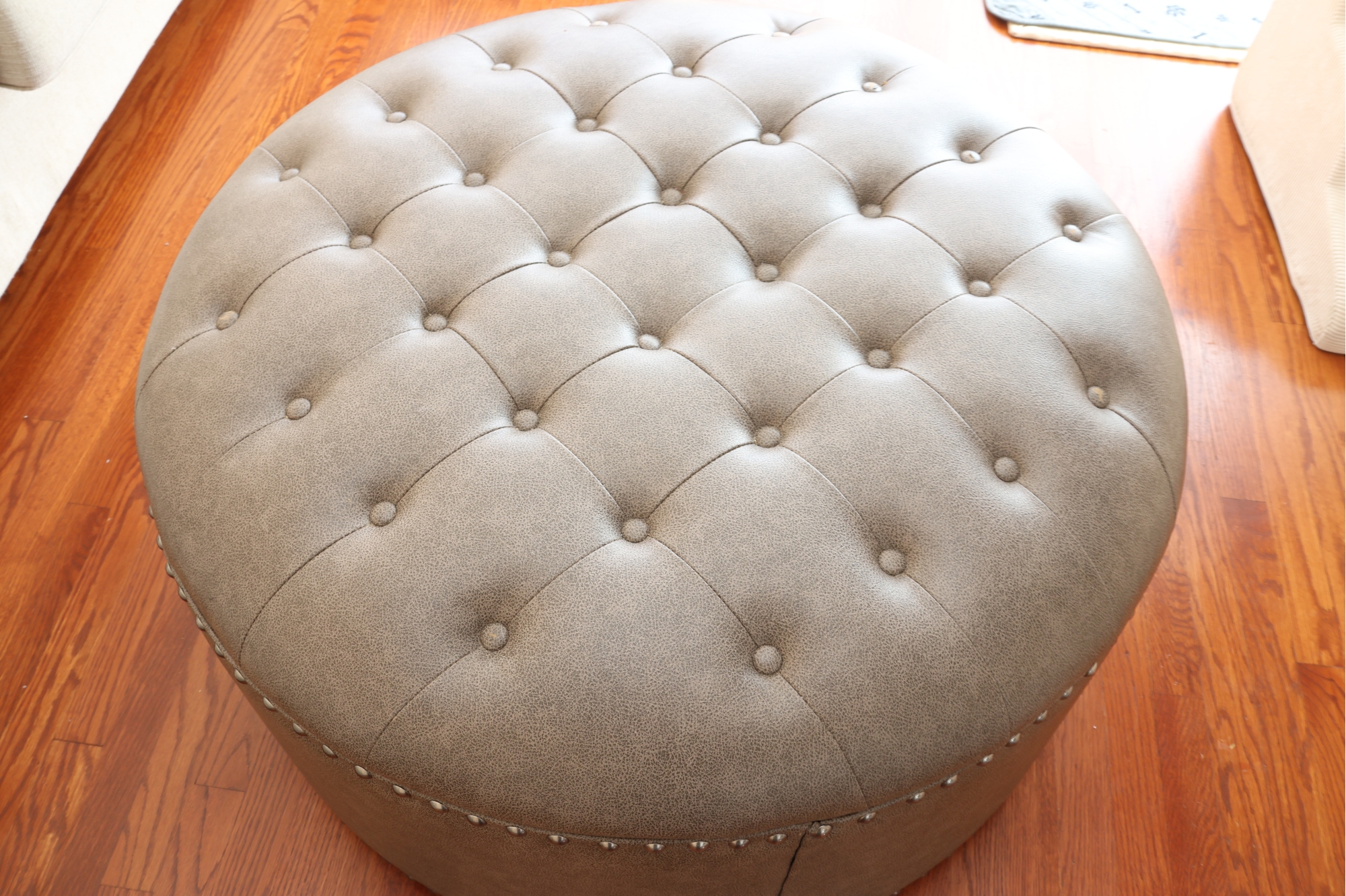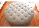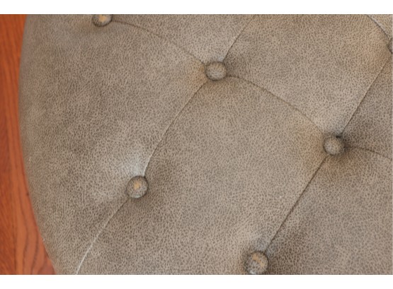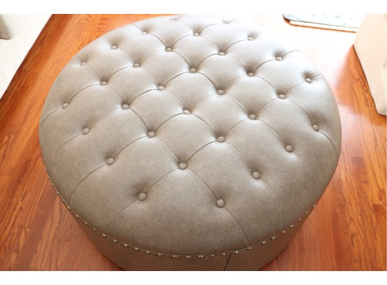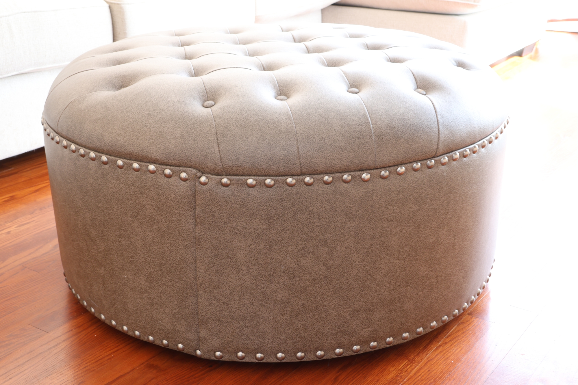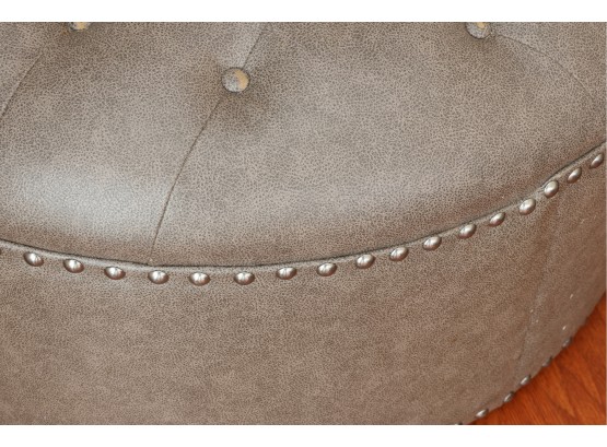 This is a round, tufted ottoman upholstered in a taupe faux leather or suede-like fabric, measuring 36" x 36" x 17". It features a deeply tufted top surface and is adorned with decorative silver-tone nailhead trim along its top and bottom edges. The fabric shows a slight texture, and the overall construction appears sturdy.