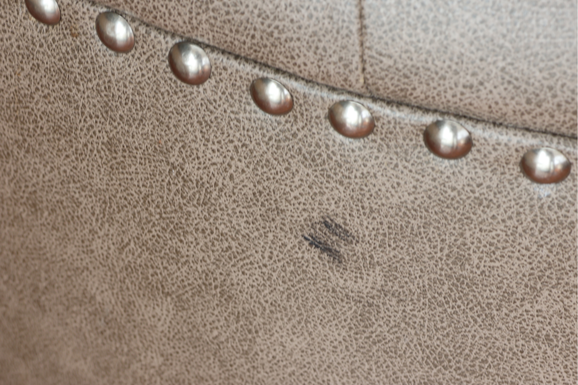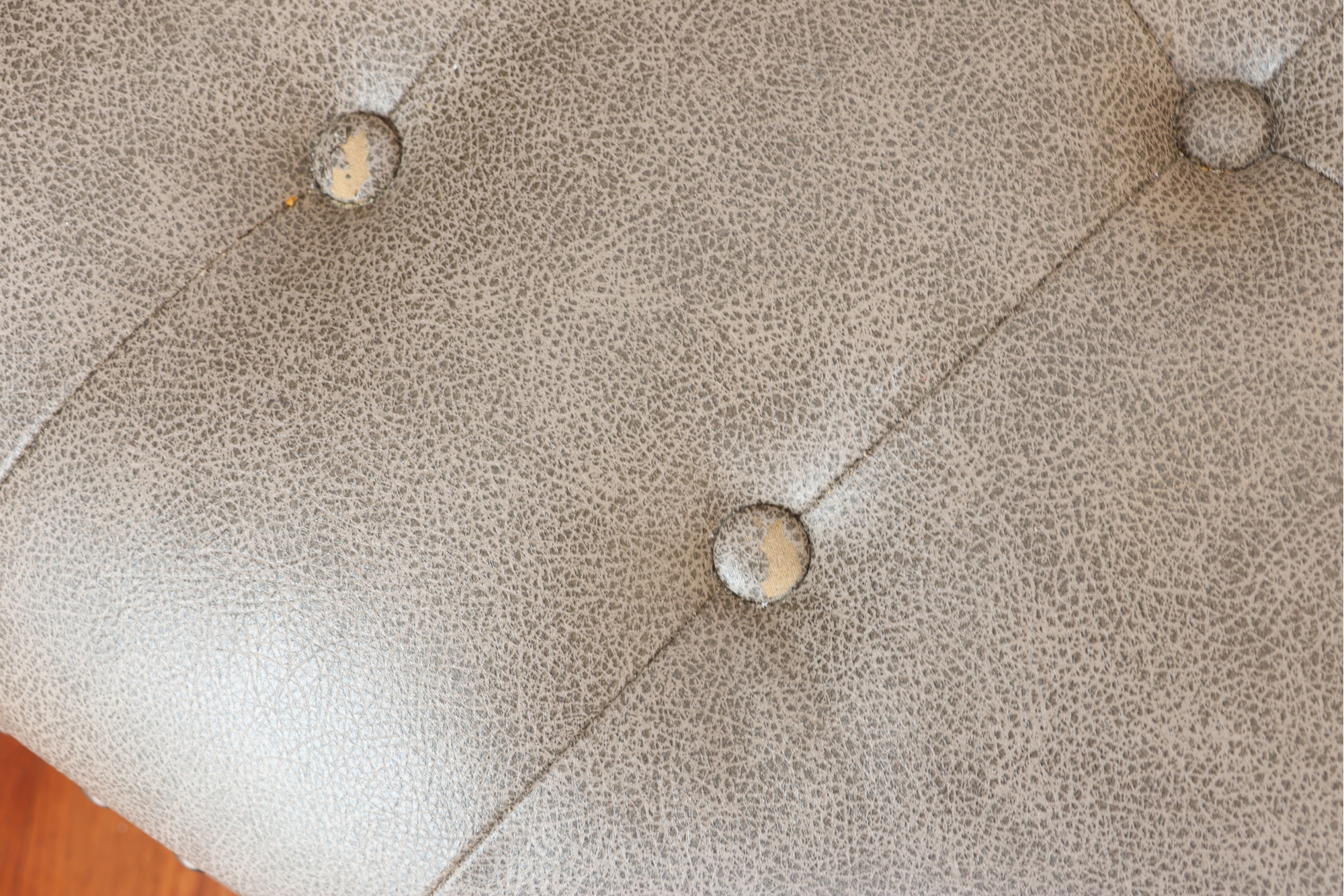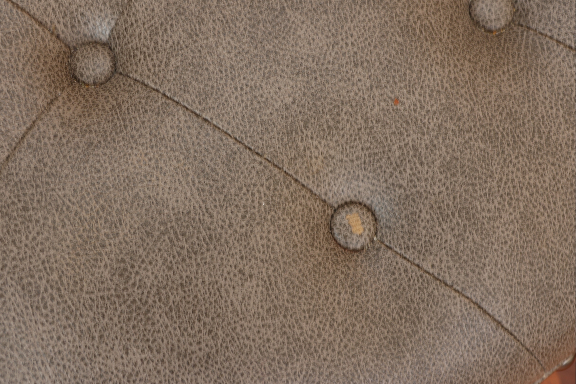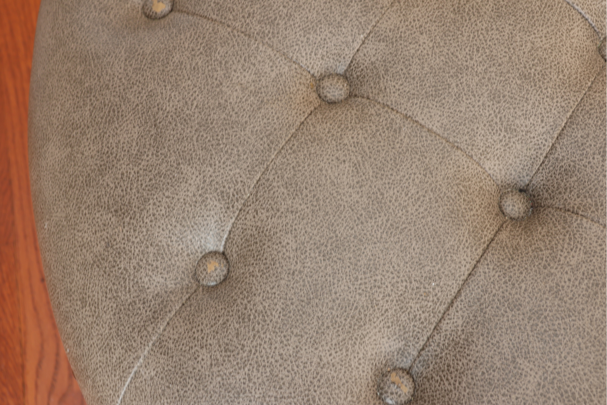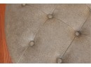 This is a round, tufted ottoman upholstered in a taupe faux leather or suede-like fabric, measuring 36" x 36" x 17". It features a deeply tufted top surface and is adorned with decorative silver-tone nailhead trim along its top and bottom edges. The fabric shows a slight texture, and the overall construction appears sturdy.