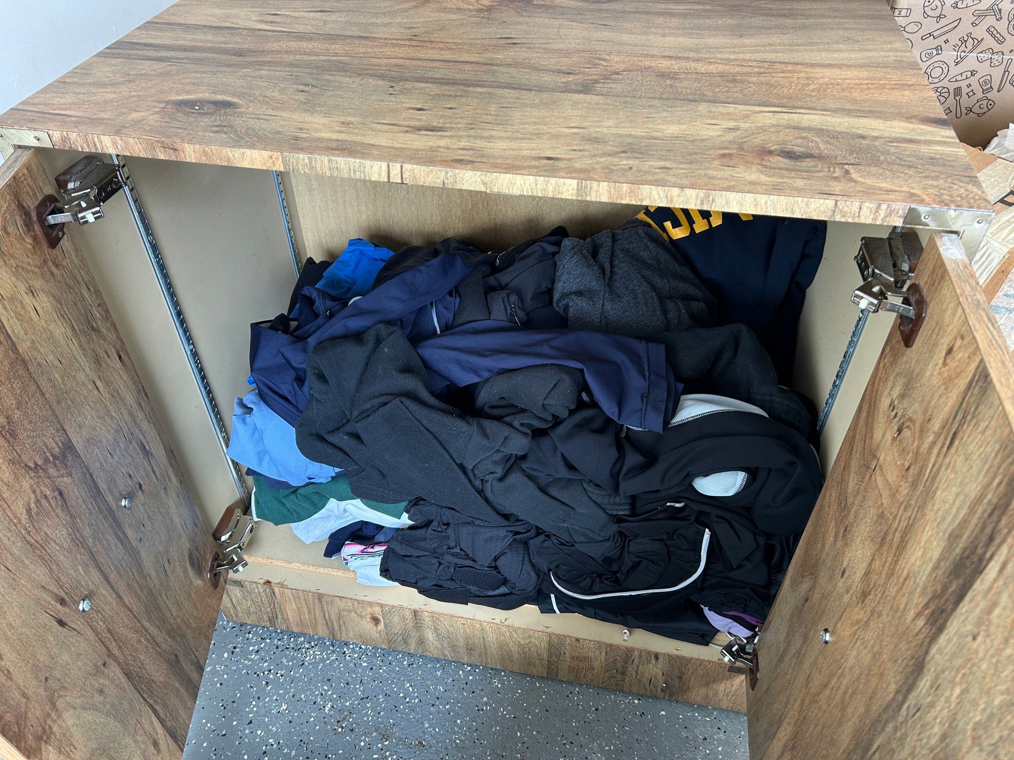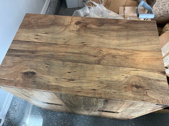This is a rectangular wooden storage cabinet featuring two front doors with recessed brass-toned handles. It is constructed from natural wood with visible grain and knots, accented by brass corner protectors on the top and bottom edges. The cabinet exhibits a rustic aesthetic with minor surface wear consistent with its style.
