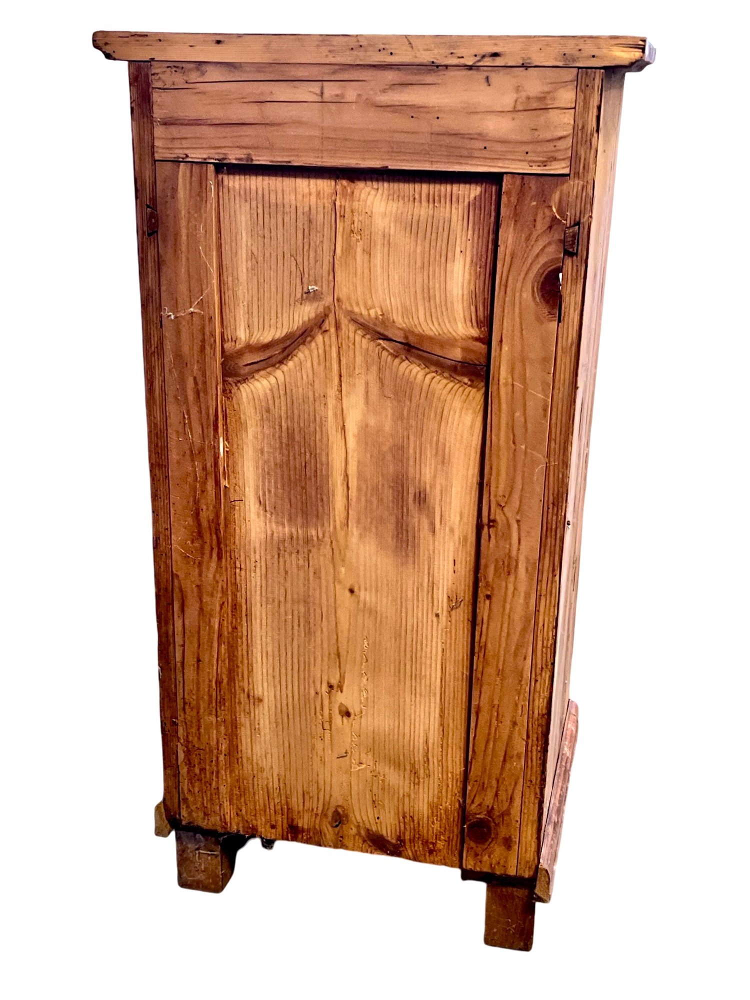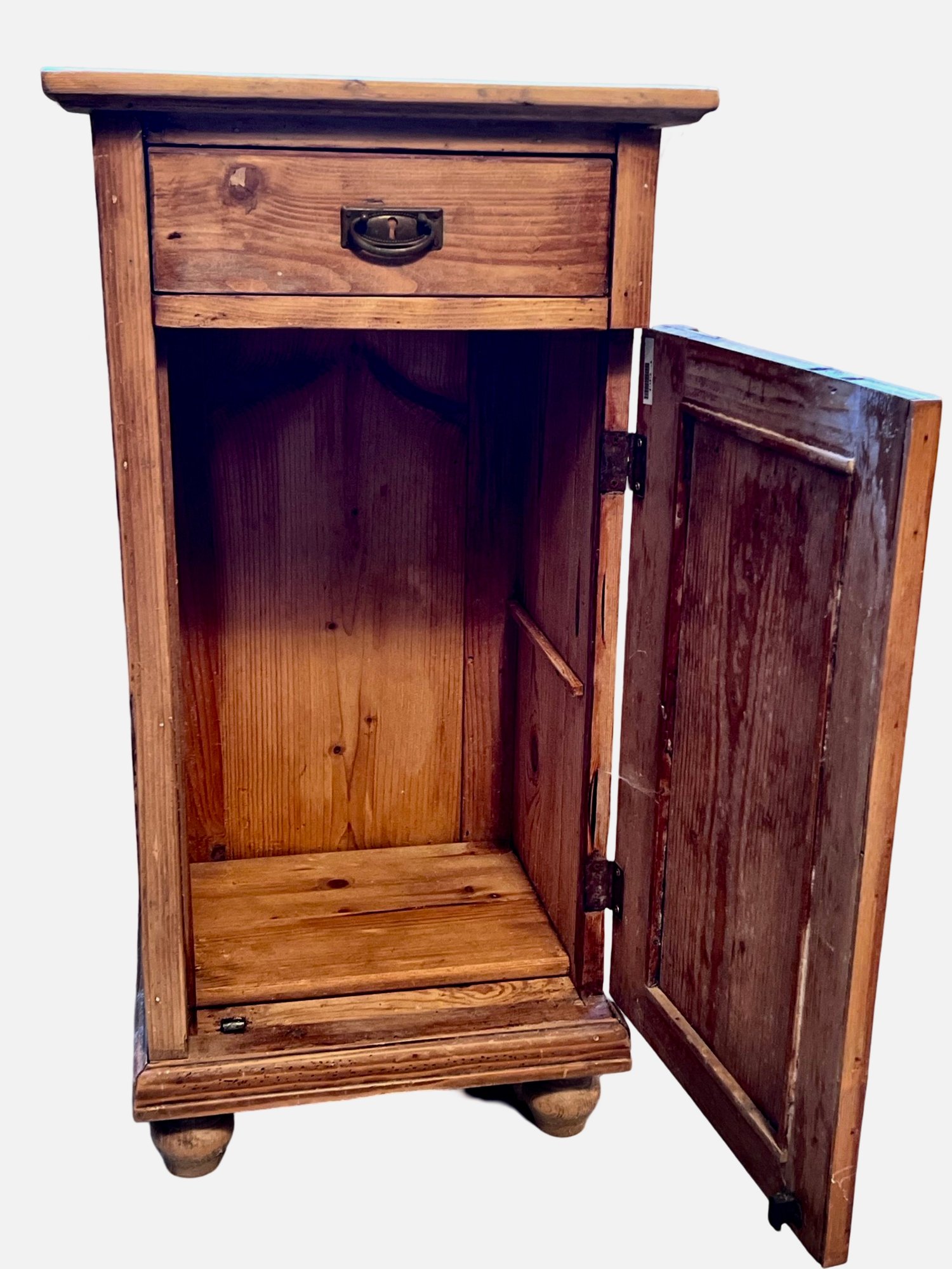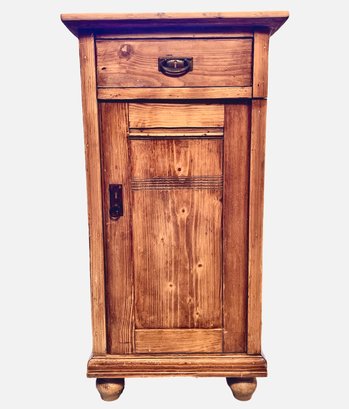 This is a pair of rustic antique wooden cabinets with a weathered patina, likely made of pine. The cabinet features a single drawer at the top with a brass pull handle, complemented by a lower door with a recessed panel and a keyhole escutcheon. The natural wood grain is prominently visible, adding to its rustic charm. The piece stands on four rounded bun feet, elevating its traditional aesthetic. Its simple yet sturdy construction makes it a versatile storage solution, perfect for use as a bedside table, accent cabinet, or entryway storage.
