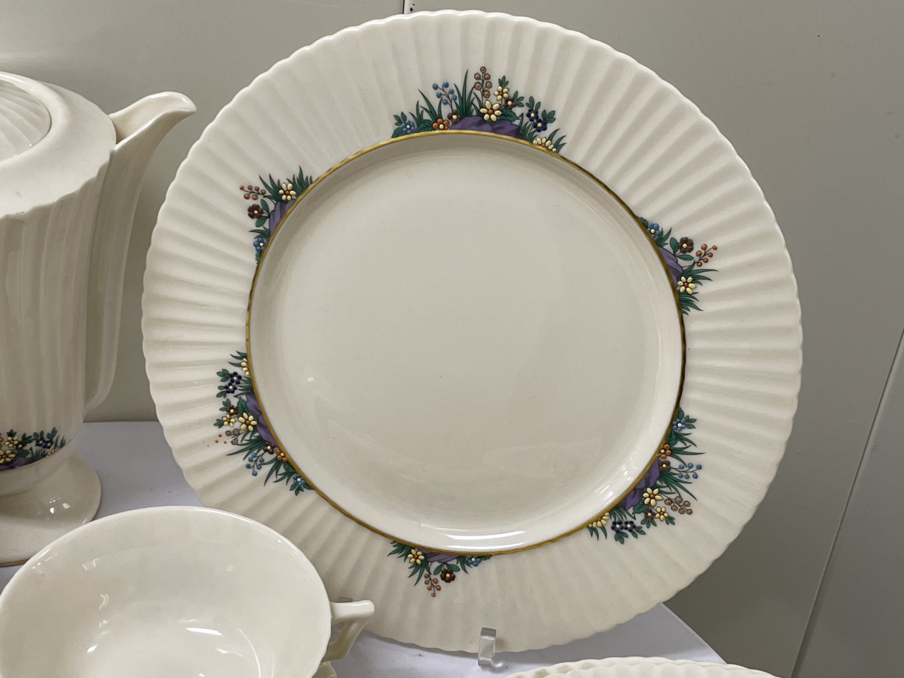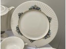 1 pitcher, 10 dinner plates, 5 bread plates, 10 dessert, 12 salad plates, 1 tereen, 1 sugar, 12 smaller dinner plates, 2 trays, 2 oval bowels, 11 tea cups single handle, 12 double handle