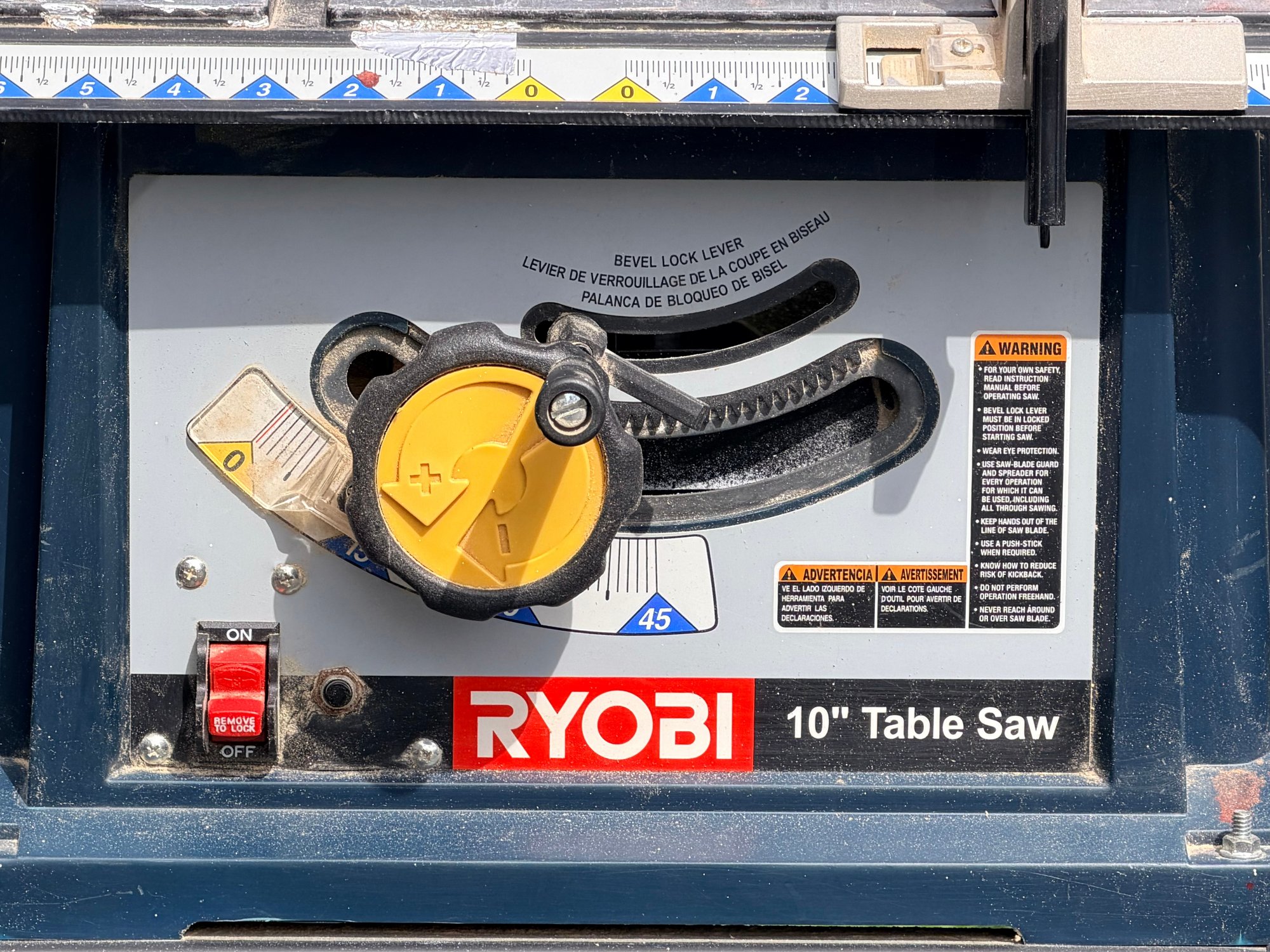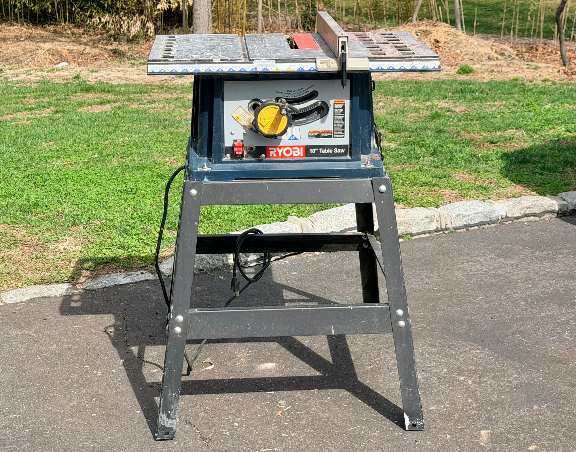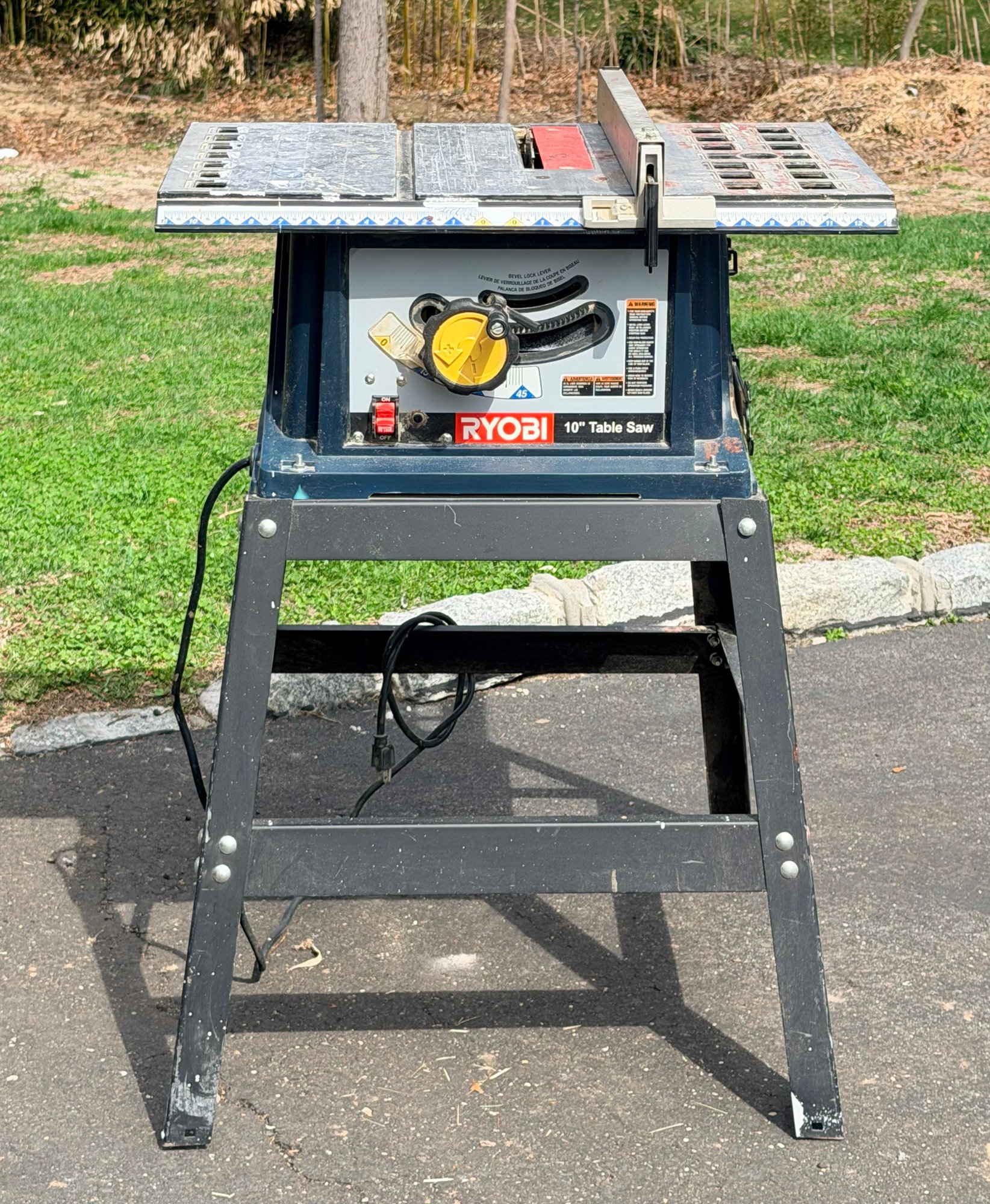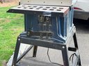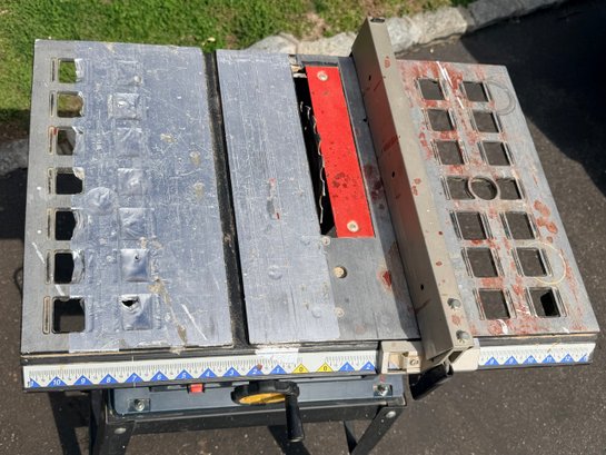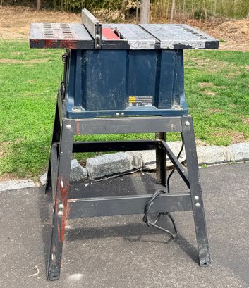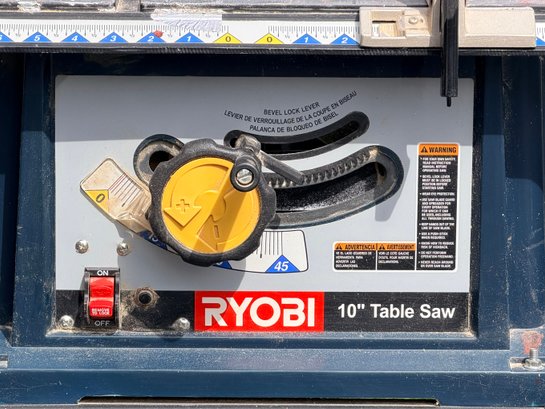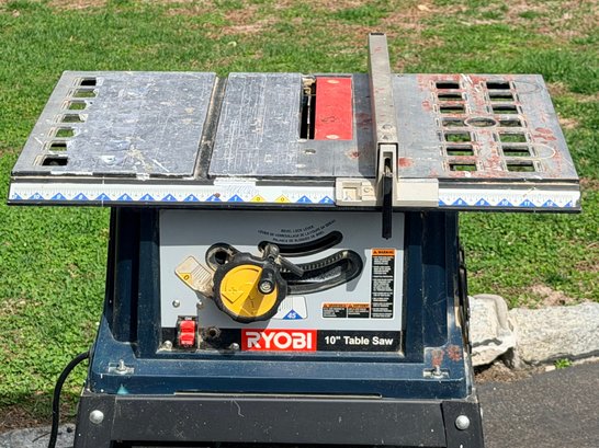 A Ryobi 10-inch table saw mounted on a metal stand, featuring an adjustable fence, blade height and angle controls, and a flat work surface with measurement markings, designed for general woodworking and cutting applications in a workshop or jobsite setting.