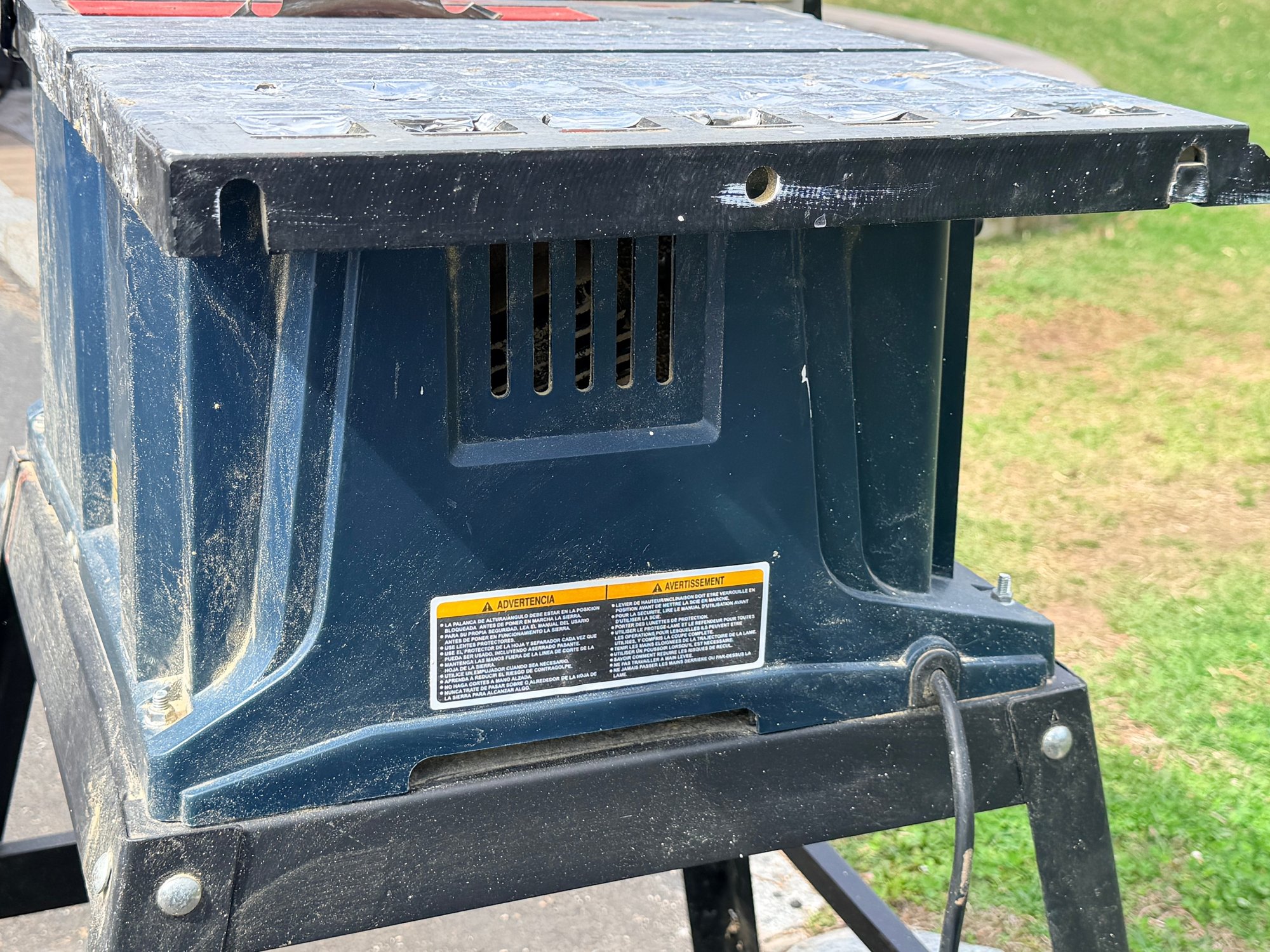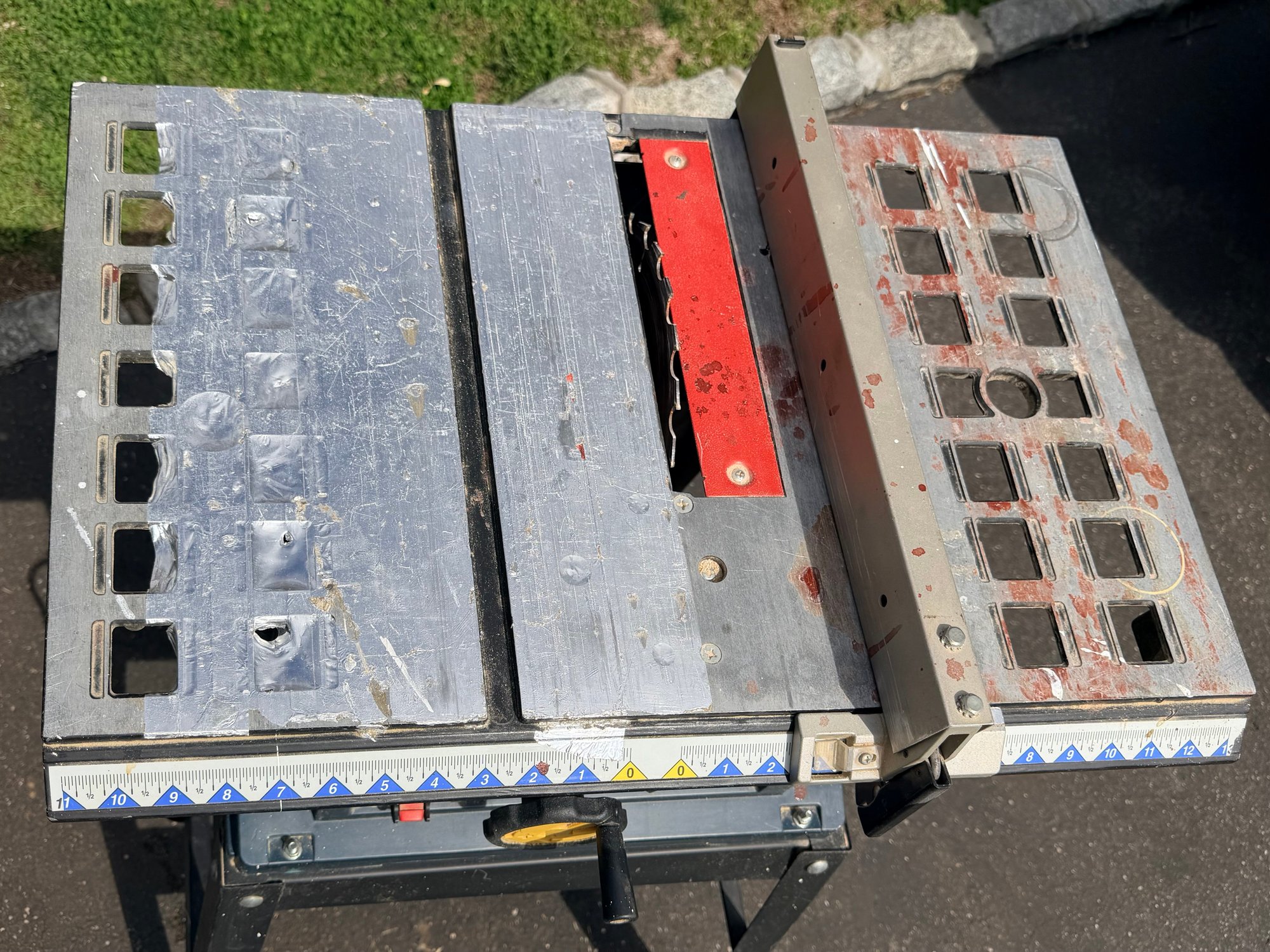 Used condition with visible surface wear, dust, and minor rust on the tabletop and components; shows typical signs of prior use; operational status tested and working