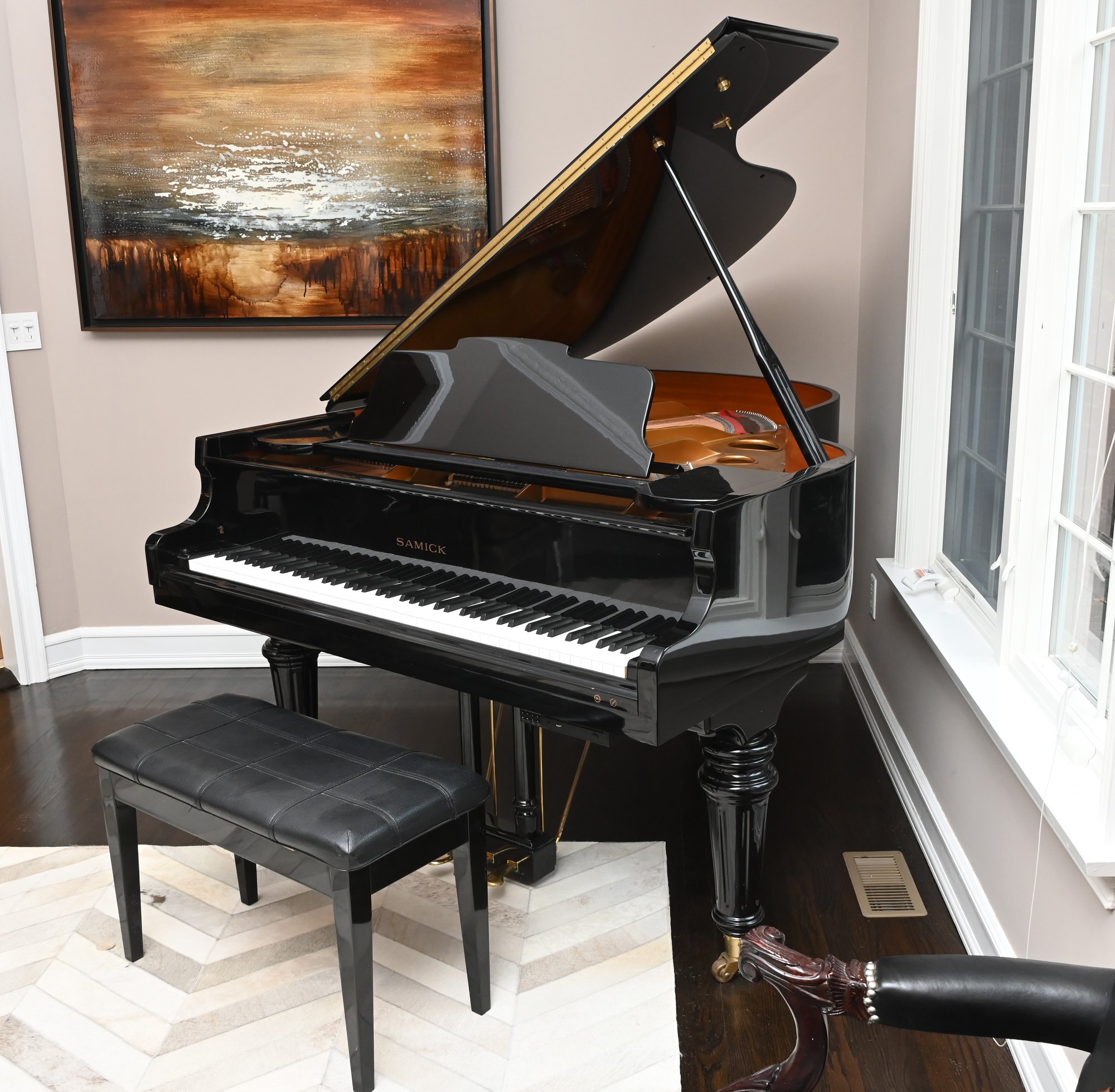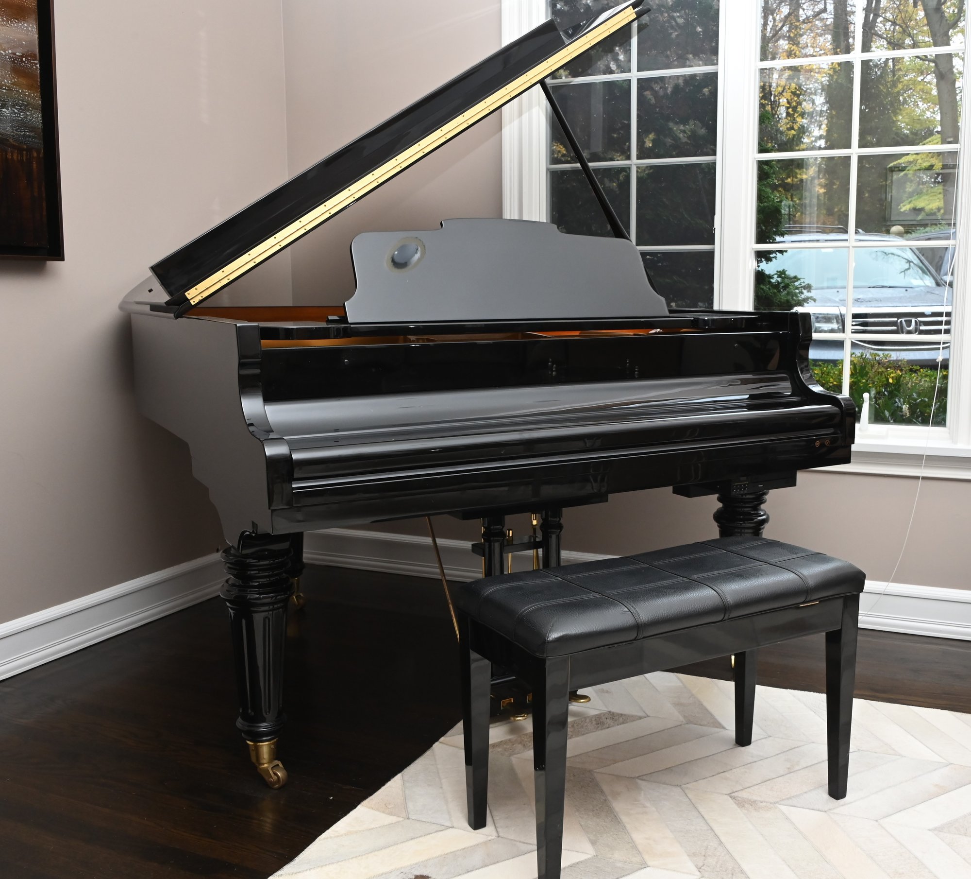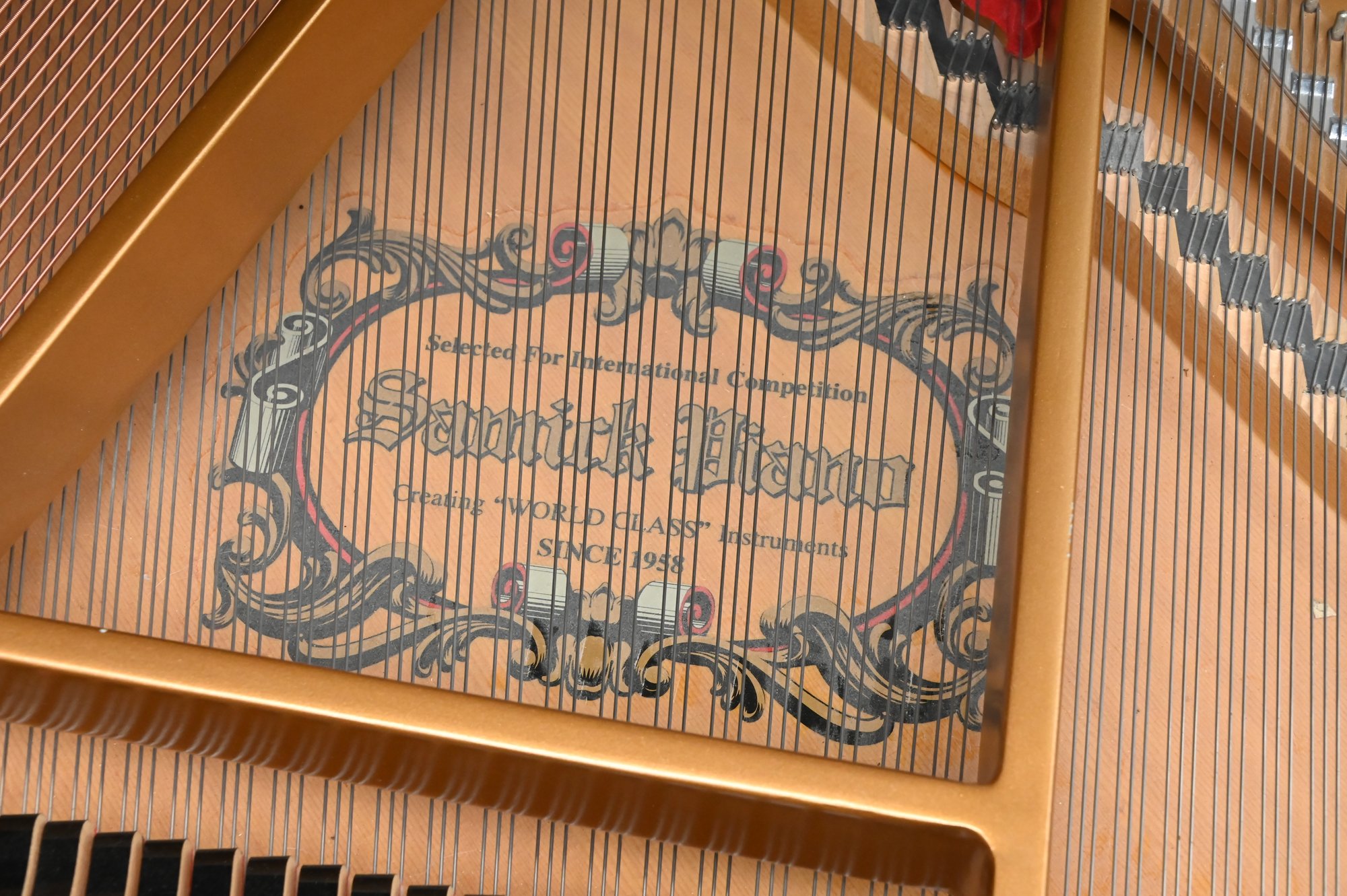 This piano has been maintained over the years. Cosmetically very nice condition. Soundboard appears in fine condition from what we were able to see. Sound quality is lovely and all keys are functional.