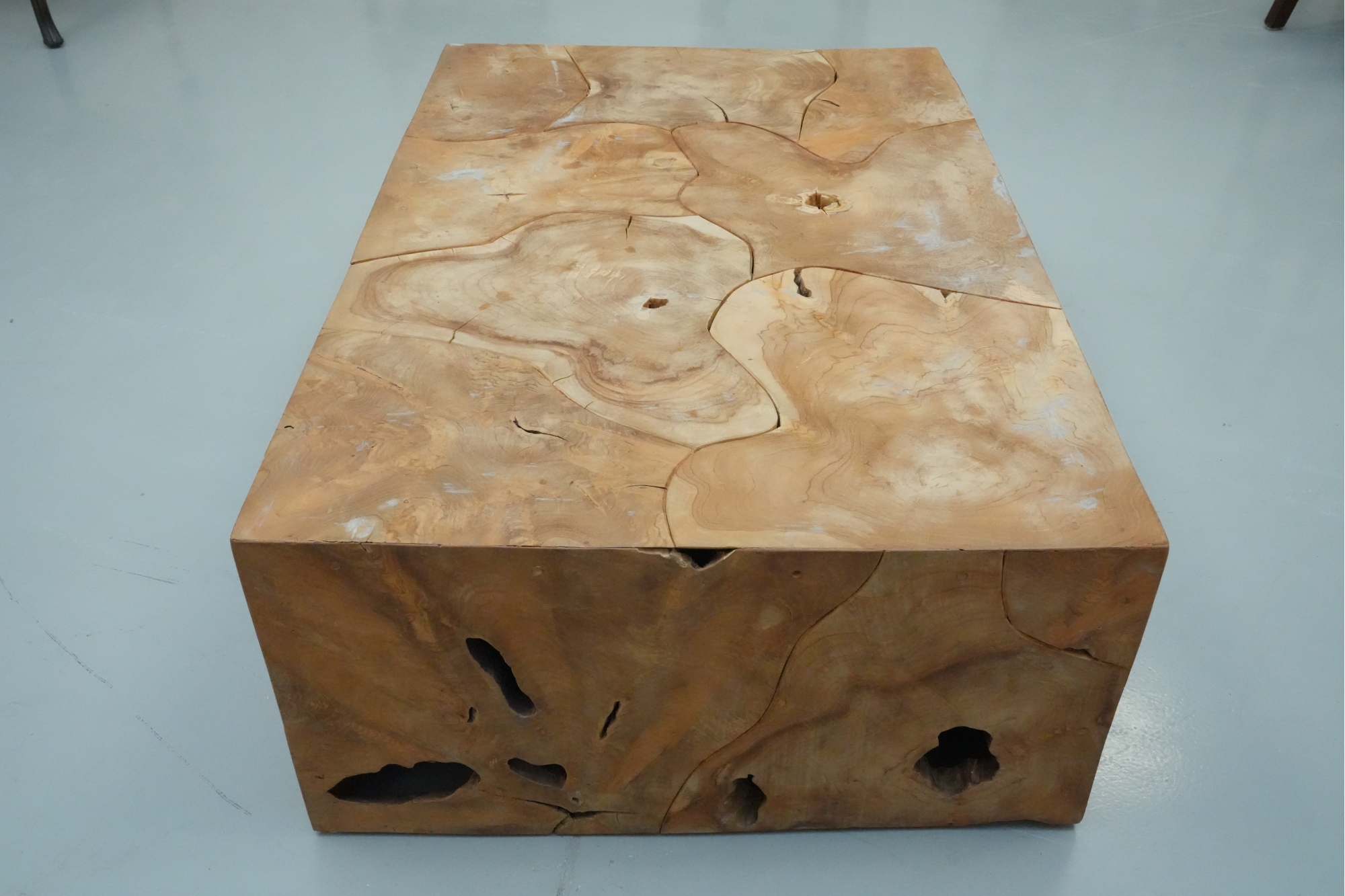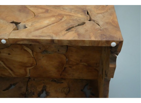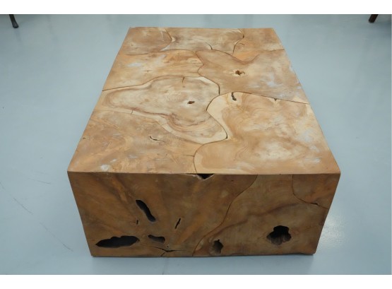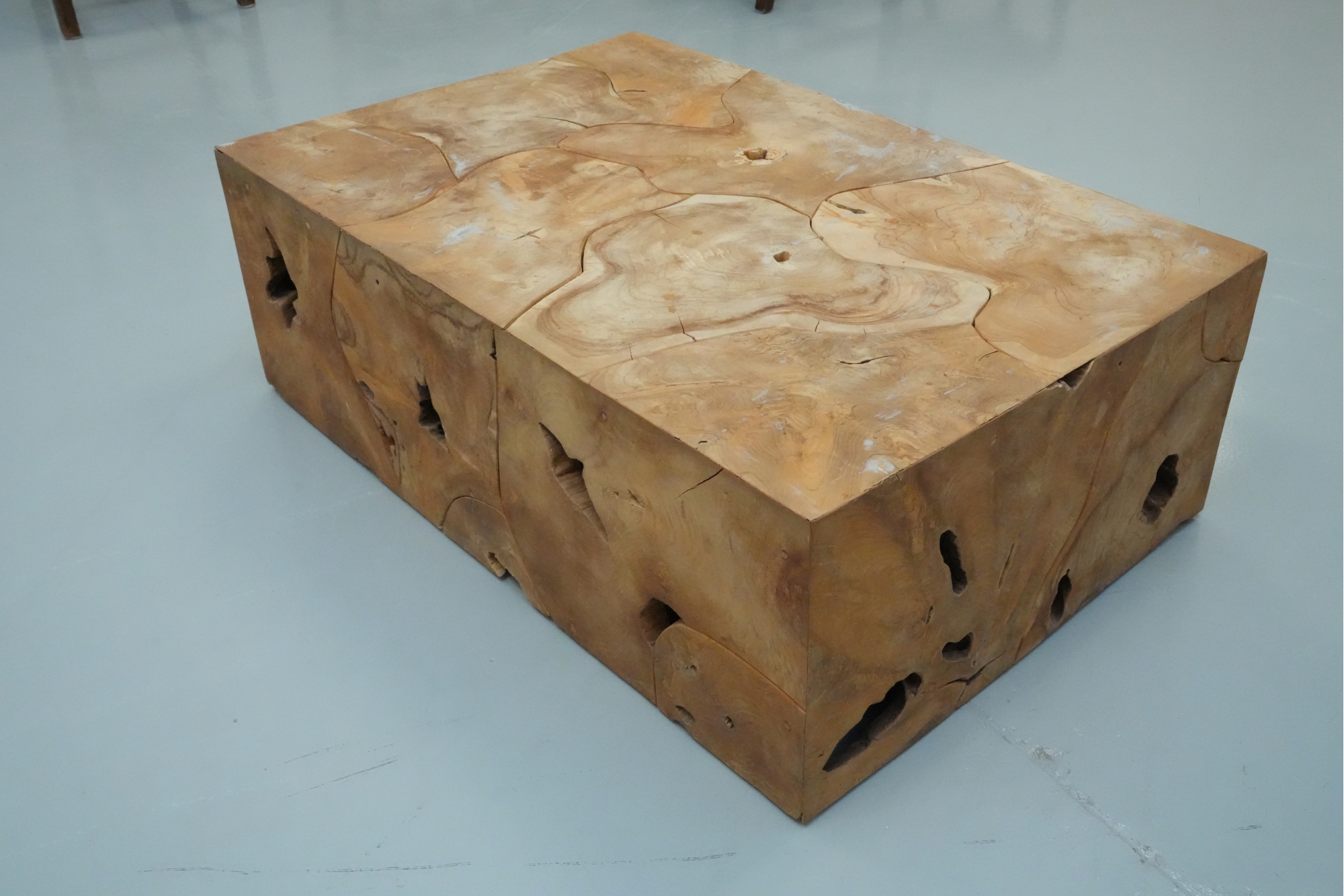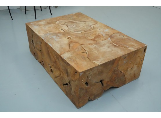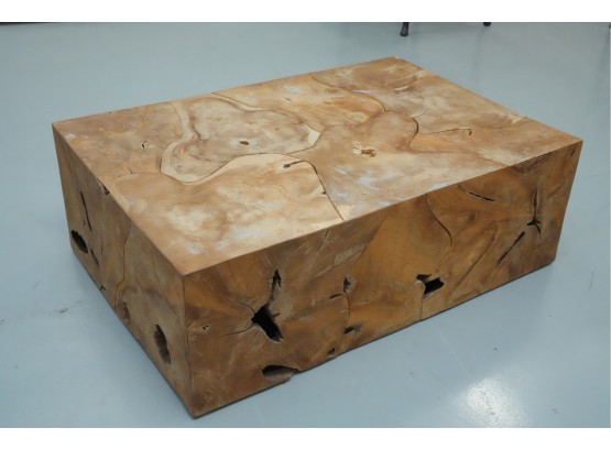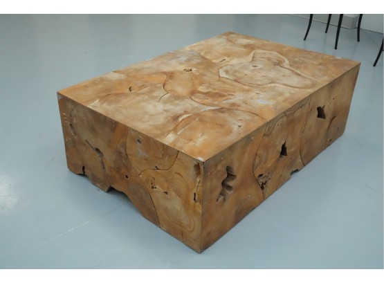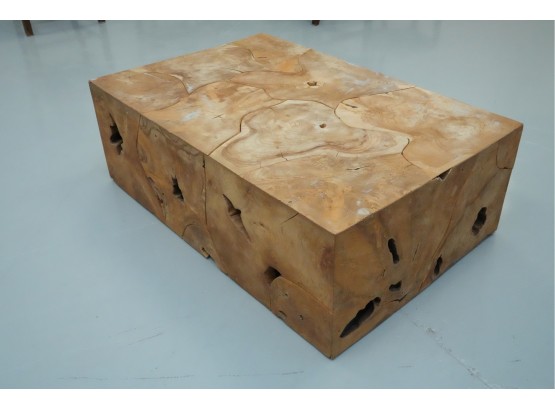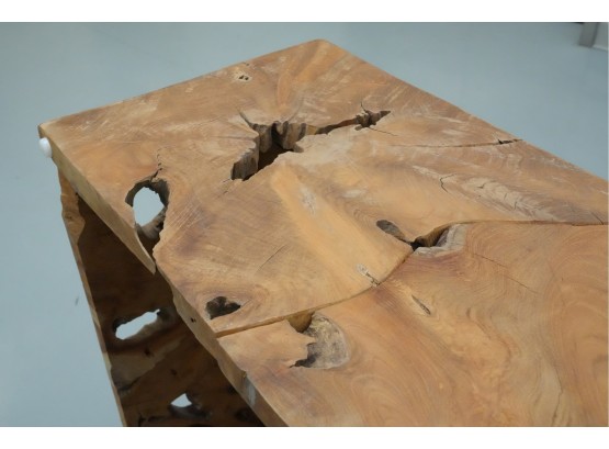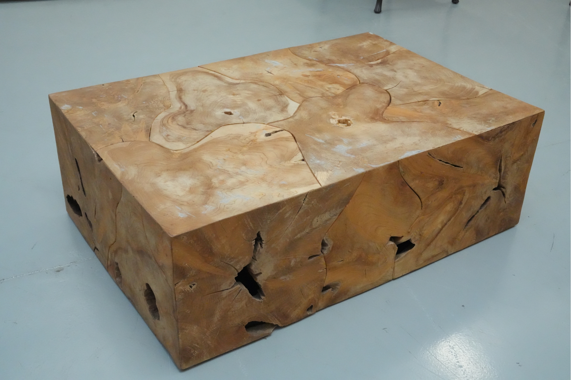 Sculptural wood block table composed of joined timber segments, featuring pronounced grain, natural knots, and organic side voids. Label on underside reads: "Handmade in Indonesia."