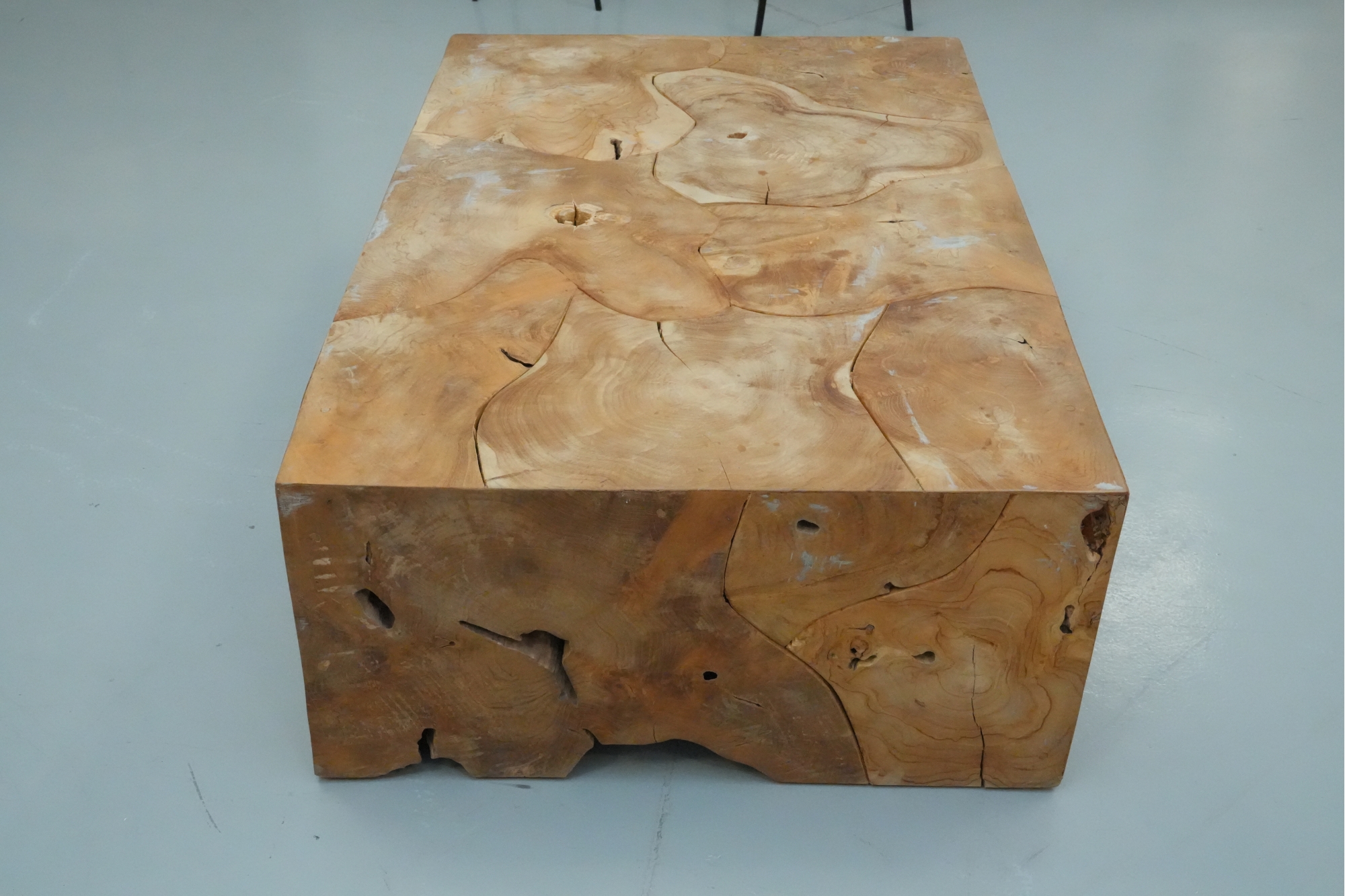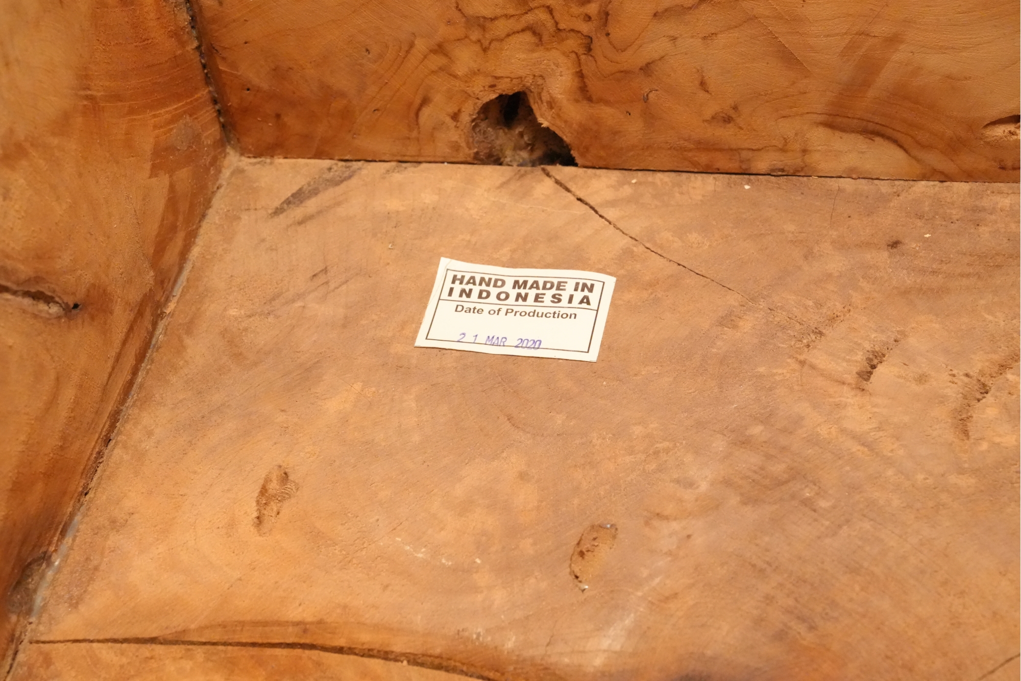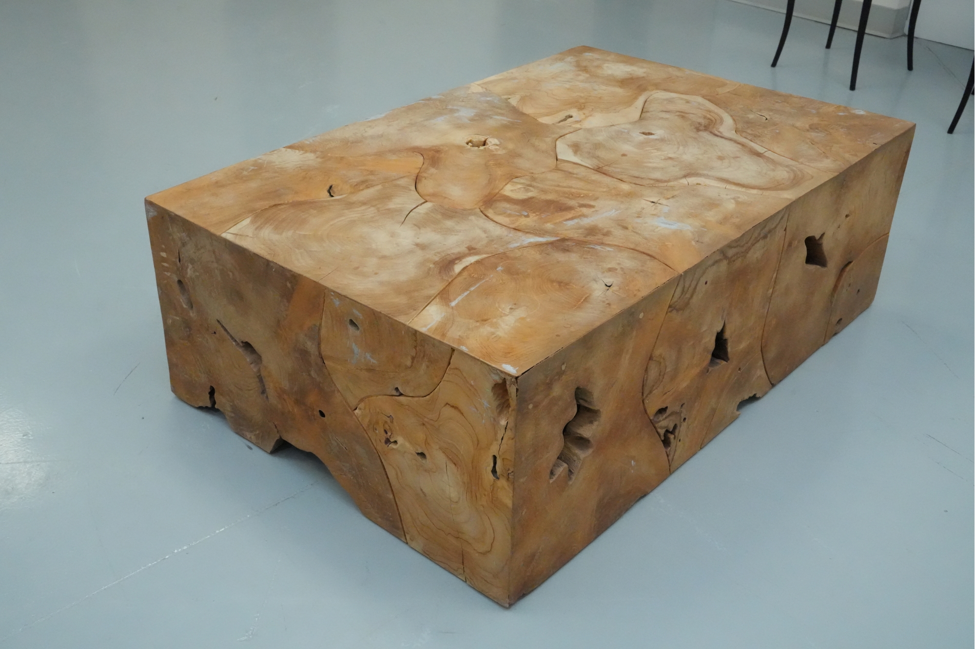 Sculptural wood block table composed of joined timber segments, featuring pronounced grain, natural knots, and organic side voids. Label on underside reads: "Handmade in Indonesia."