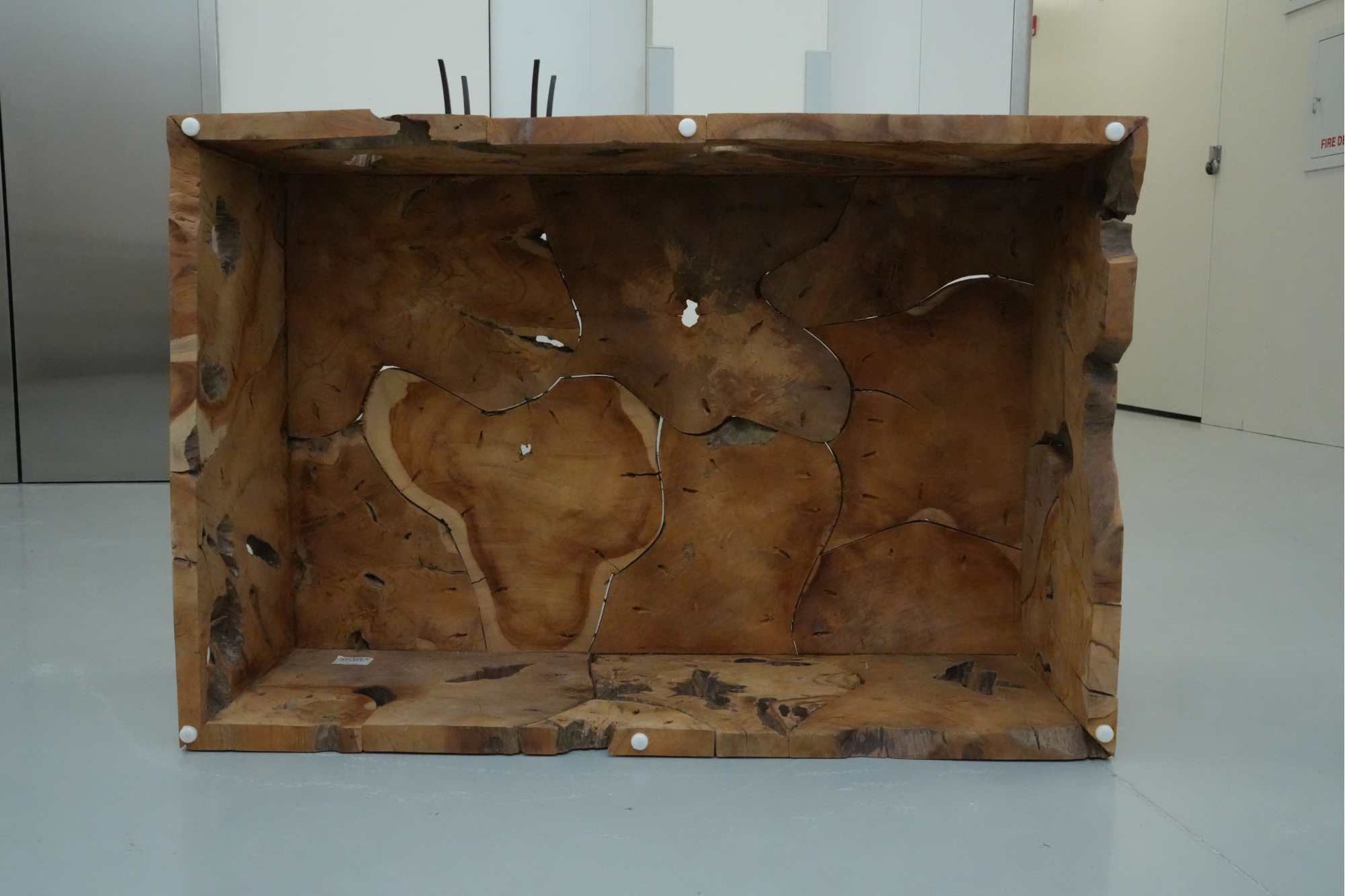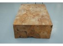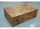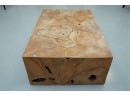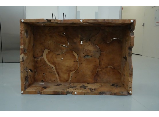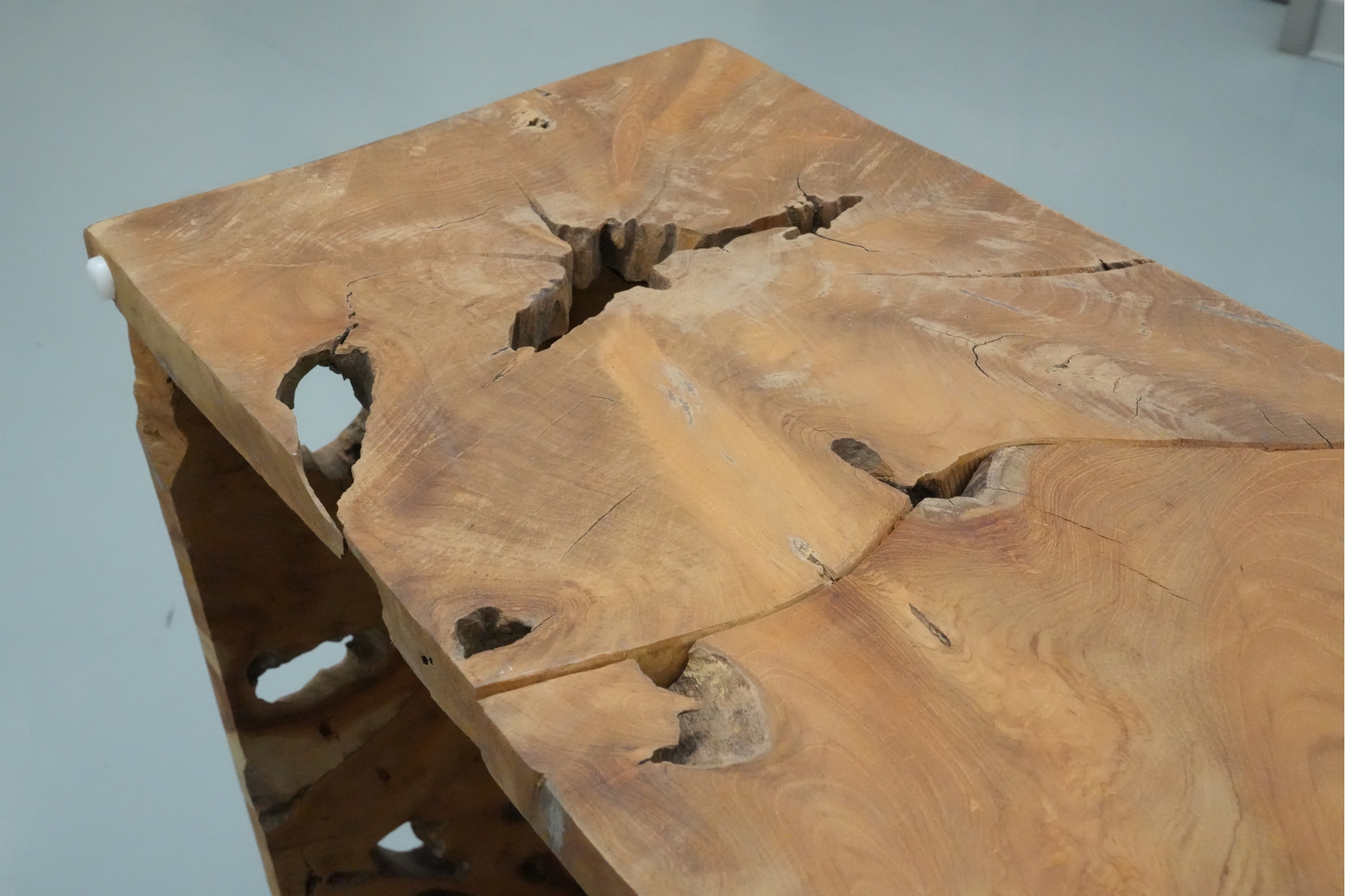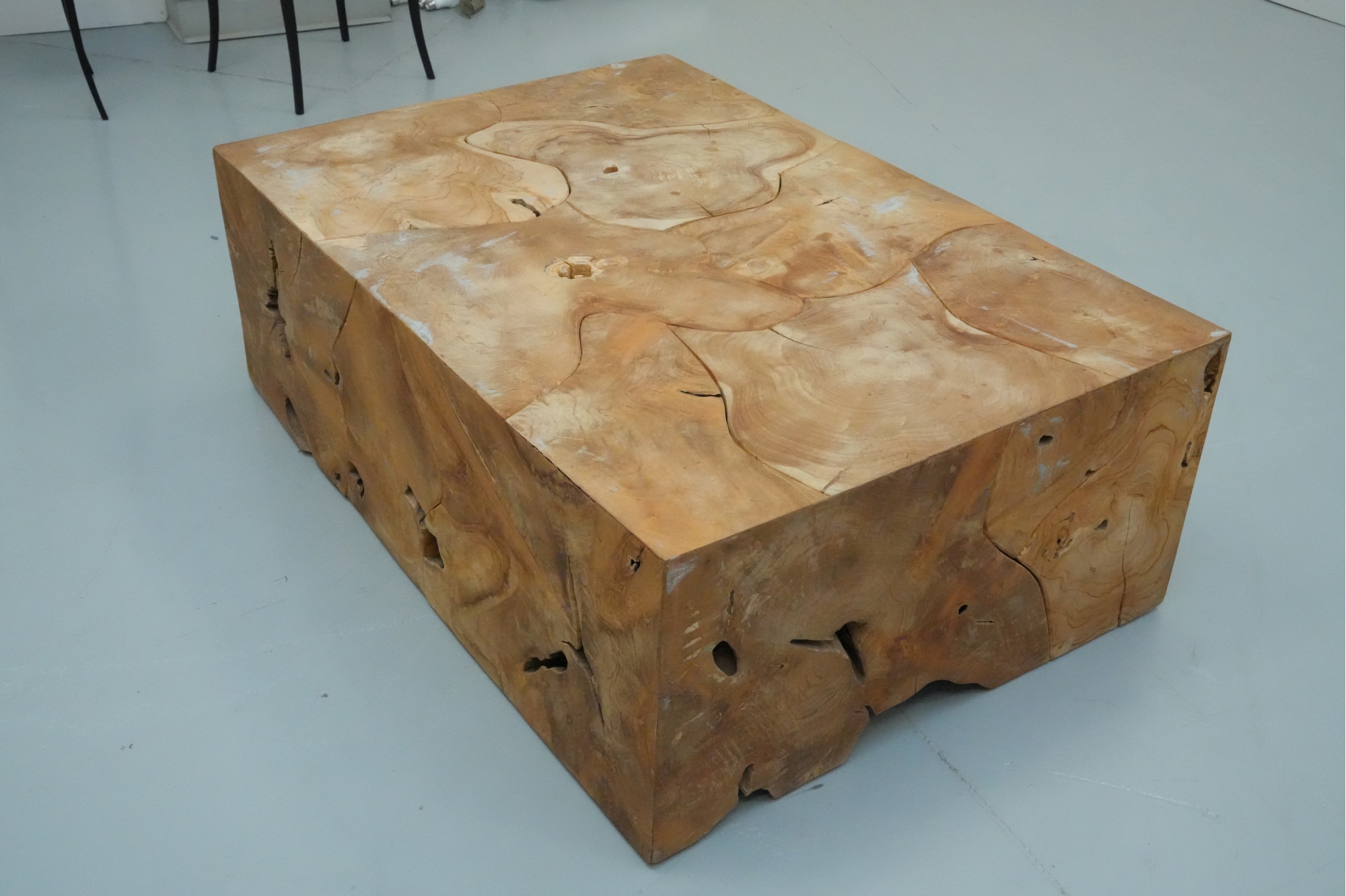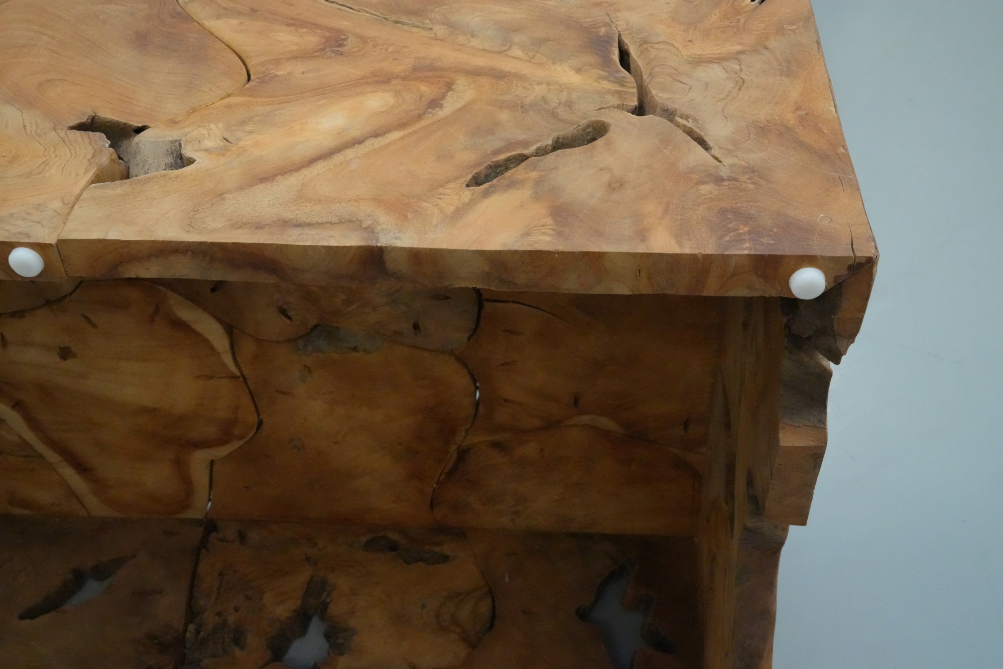 Sculptural wood block table composed of joined timber segments, featuring pronounced grain, natural knots, and organic side voids. Label on underside reads: "Handmade in Indonesia."