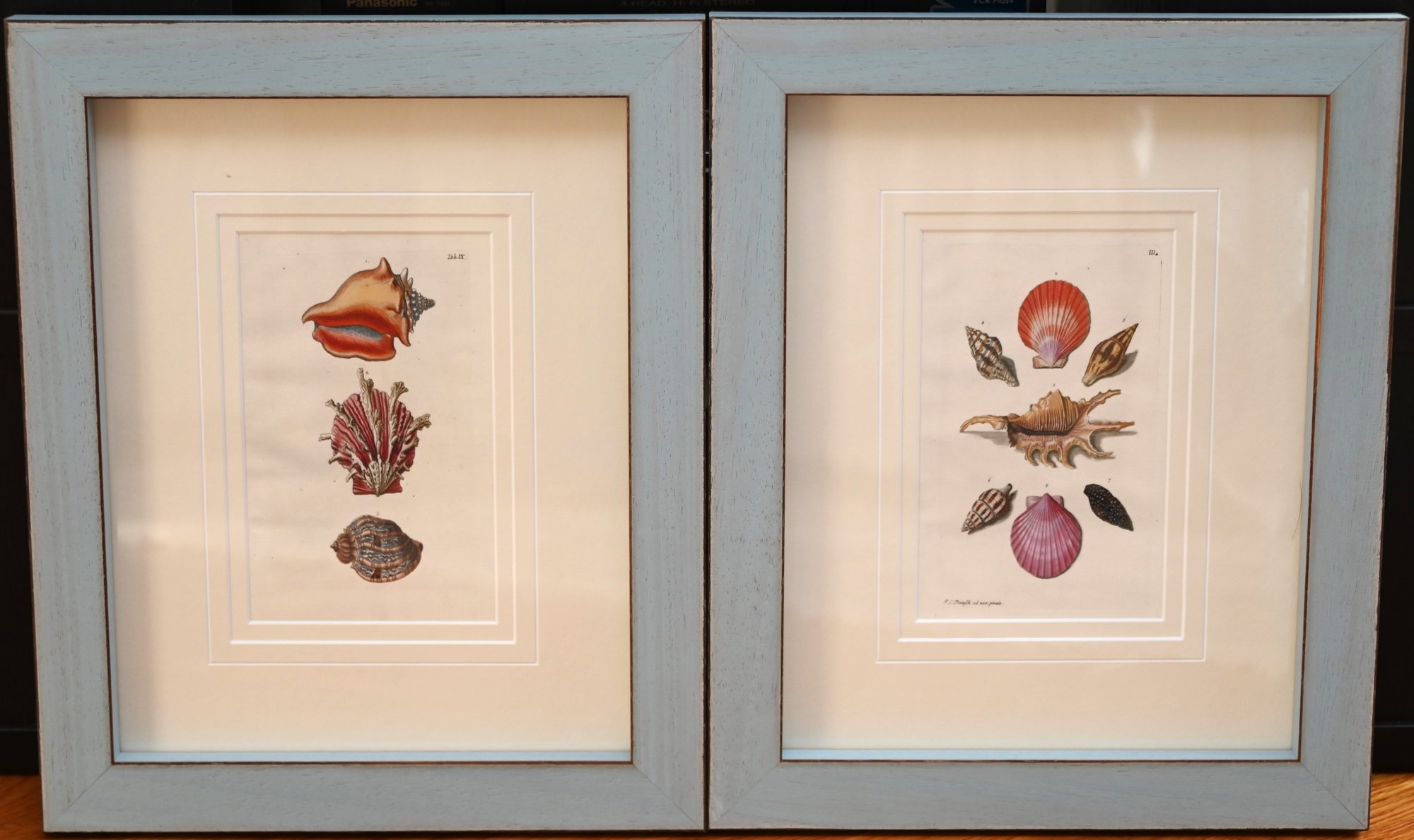 This is a pair of framed vintage seashell prints featuring detailed scientific illustrations of various shells and marine specimens. The prints are set in matching light blue wooden frames with a distressed finish, giving them a coastal and rustic charm. The illustrations are matted with a layered cream-colored mat, enhancing the depth and visual appeal of the artwork.