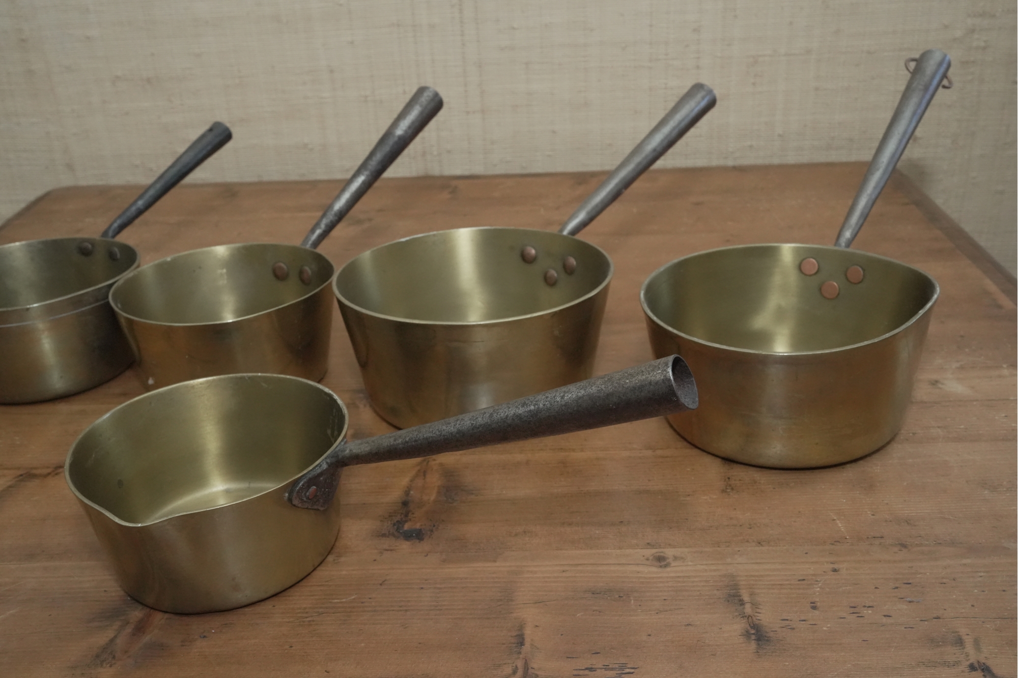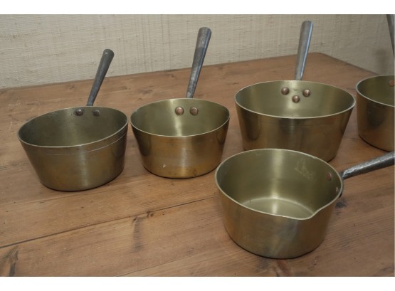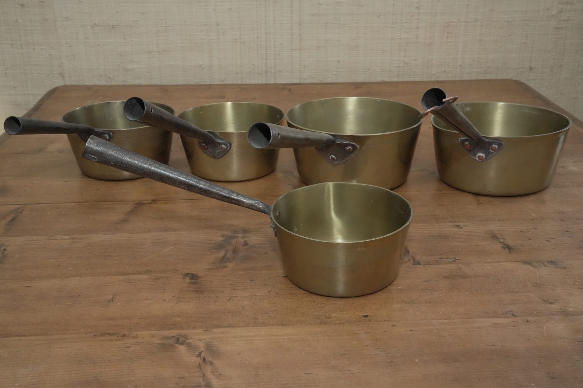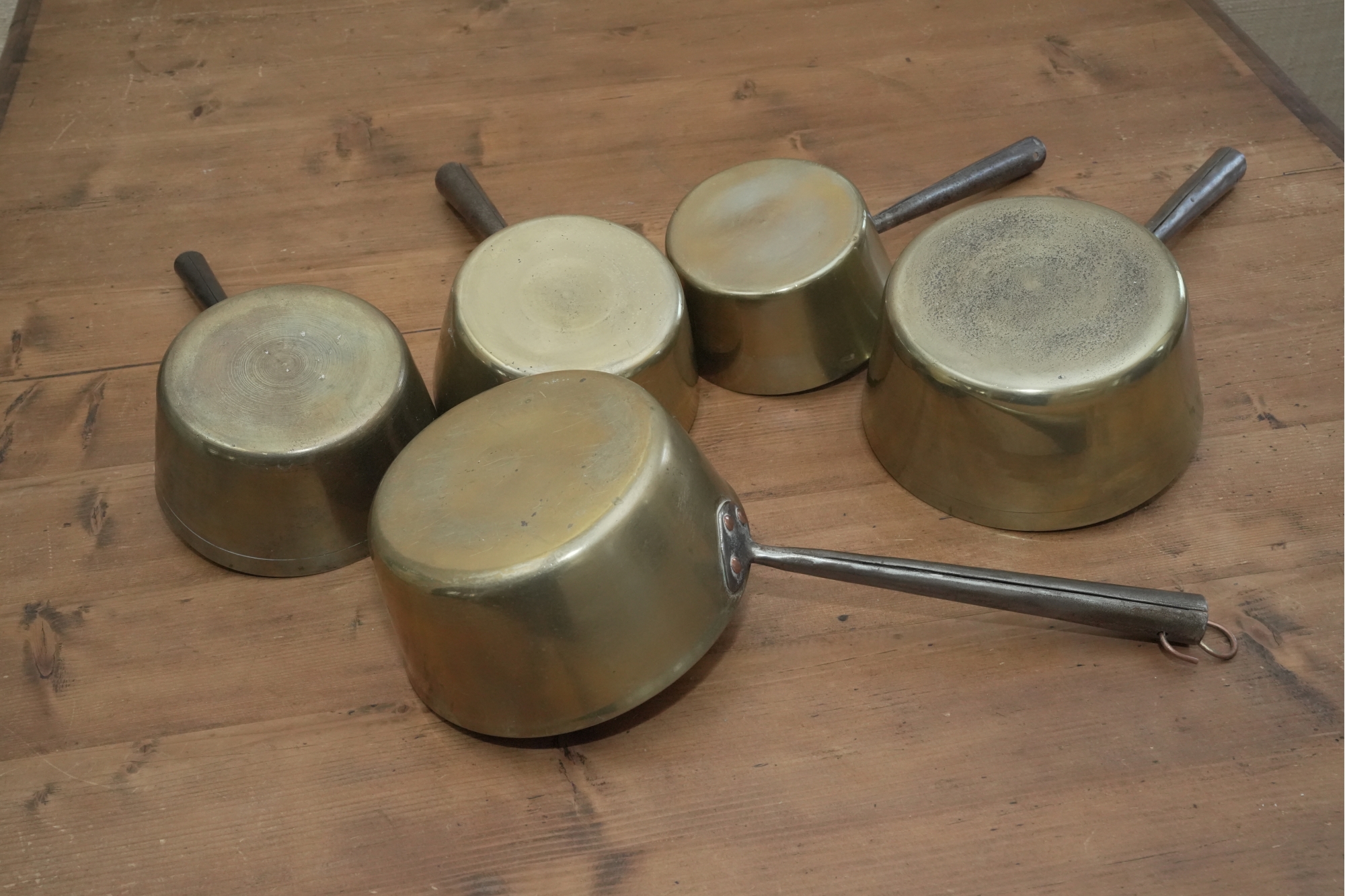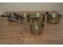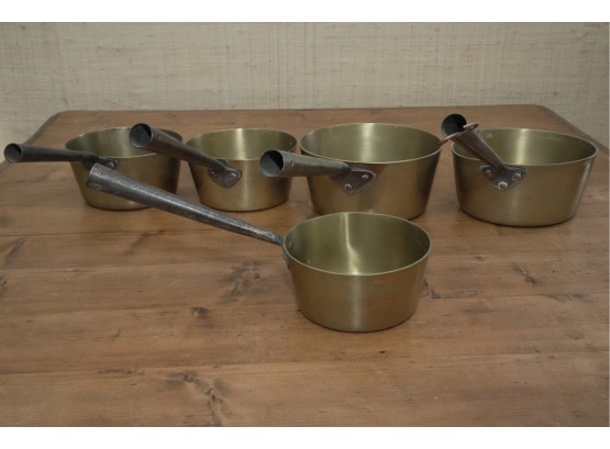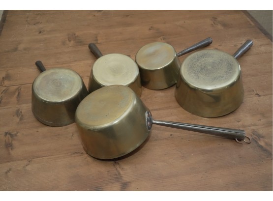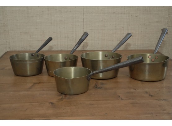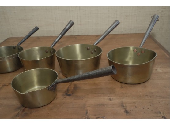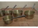 Set Of 5 Vintage Brass Sauce Pans With Long Iron Handles