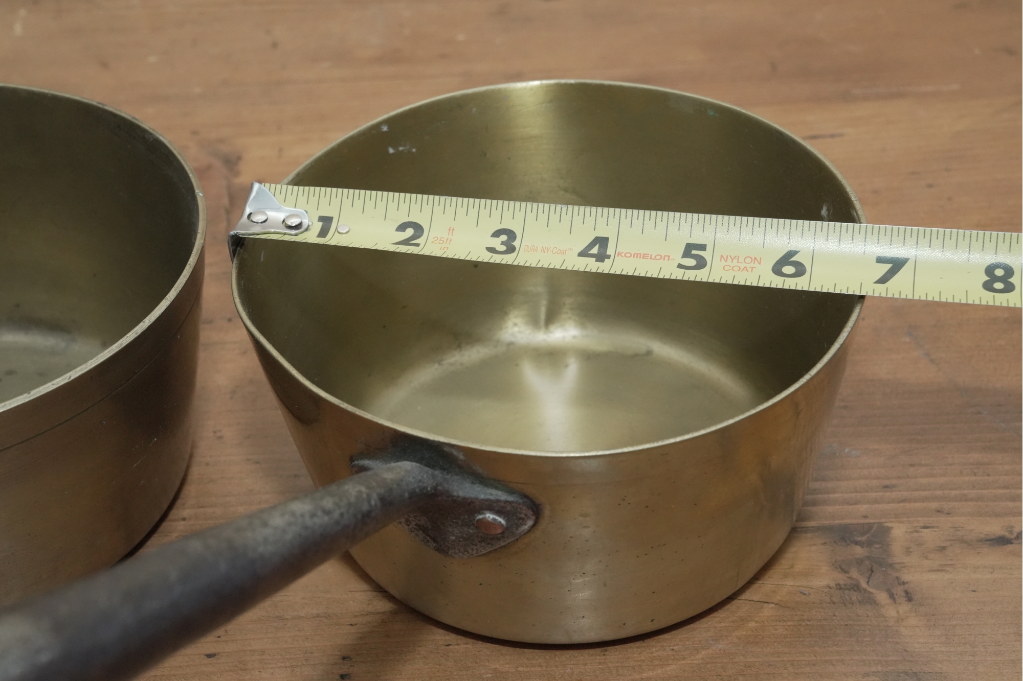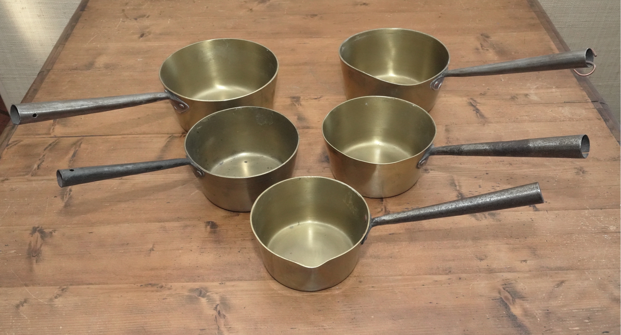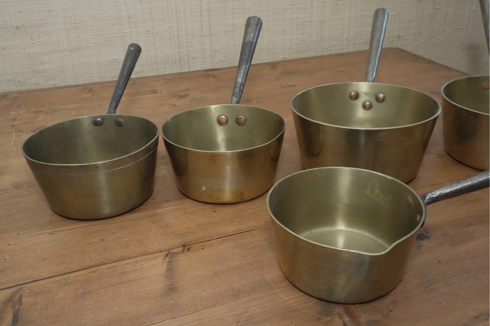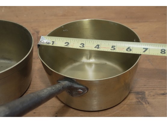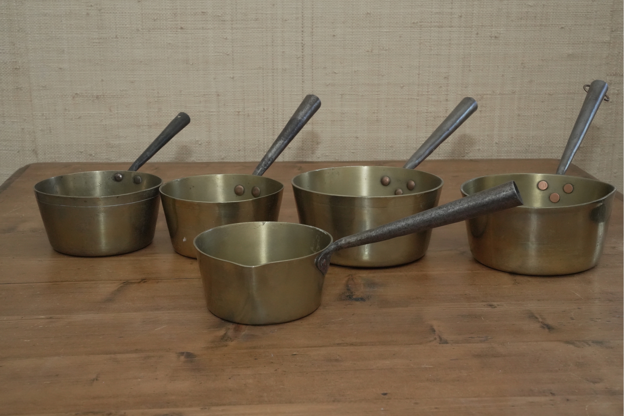 Set Of 5 Vintage Brass Sauce Pans With Long Iron Handles
