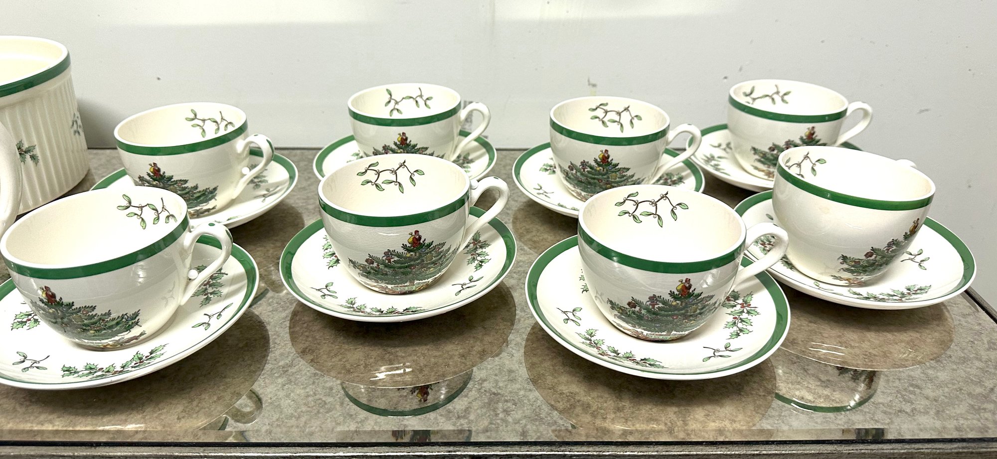 8 teacups and saucers, 1 pitcher, 1 new in box souffle dish, 1 extra saucer