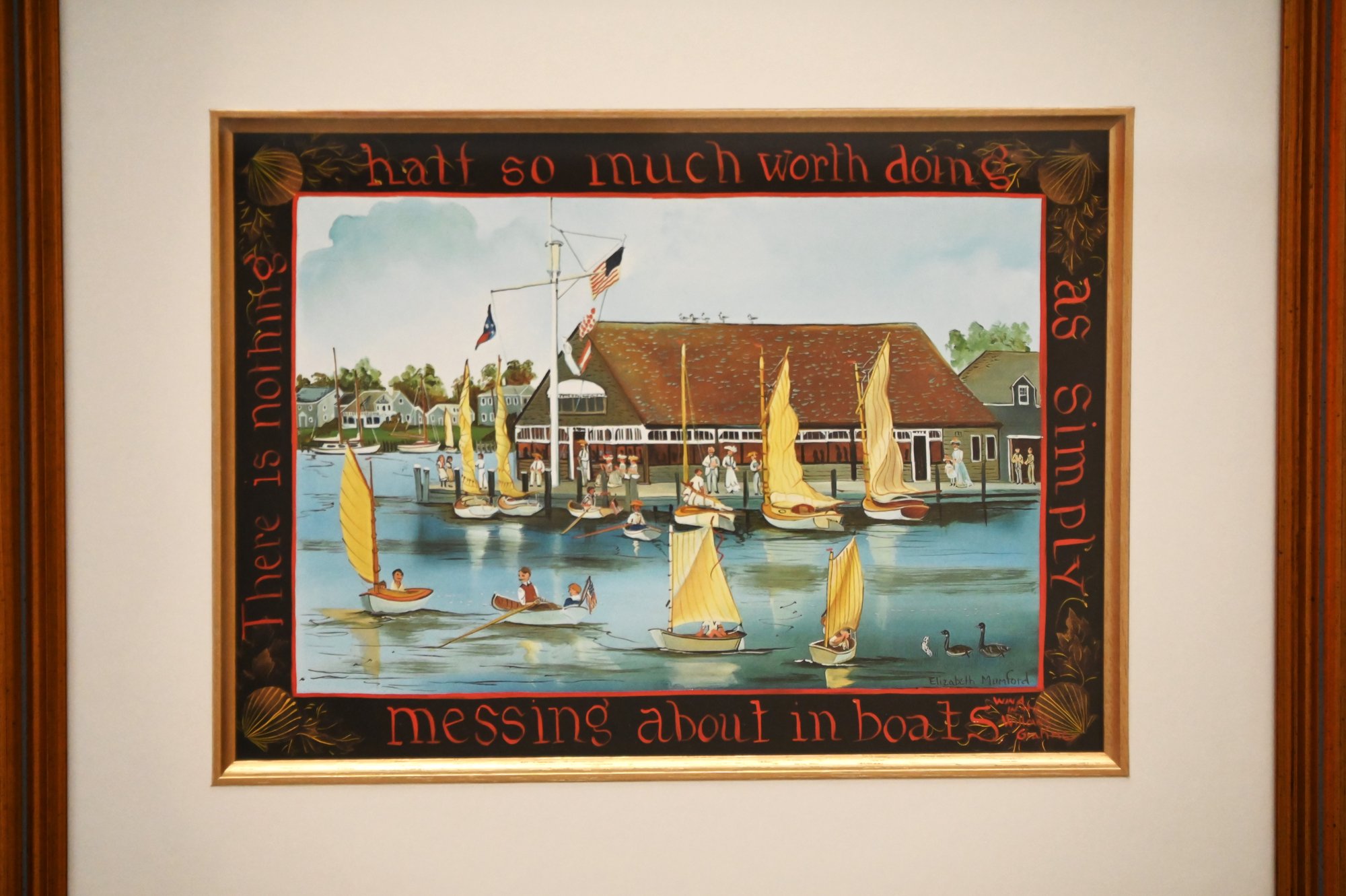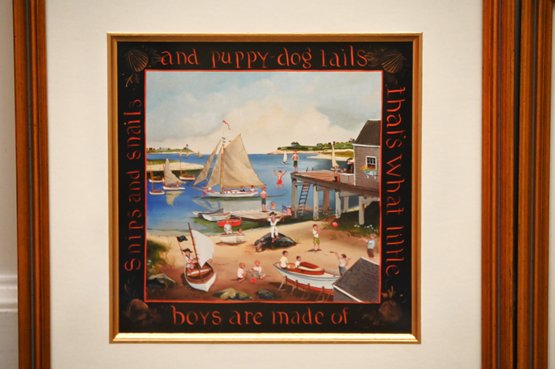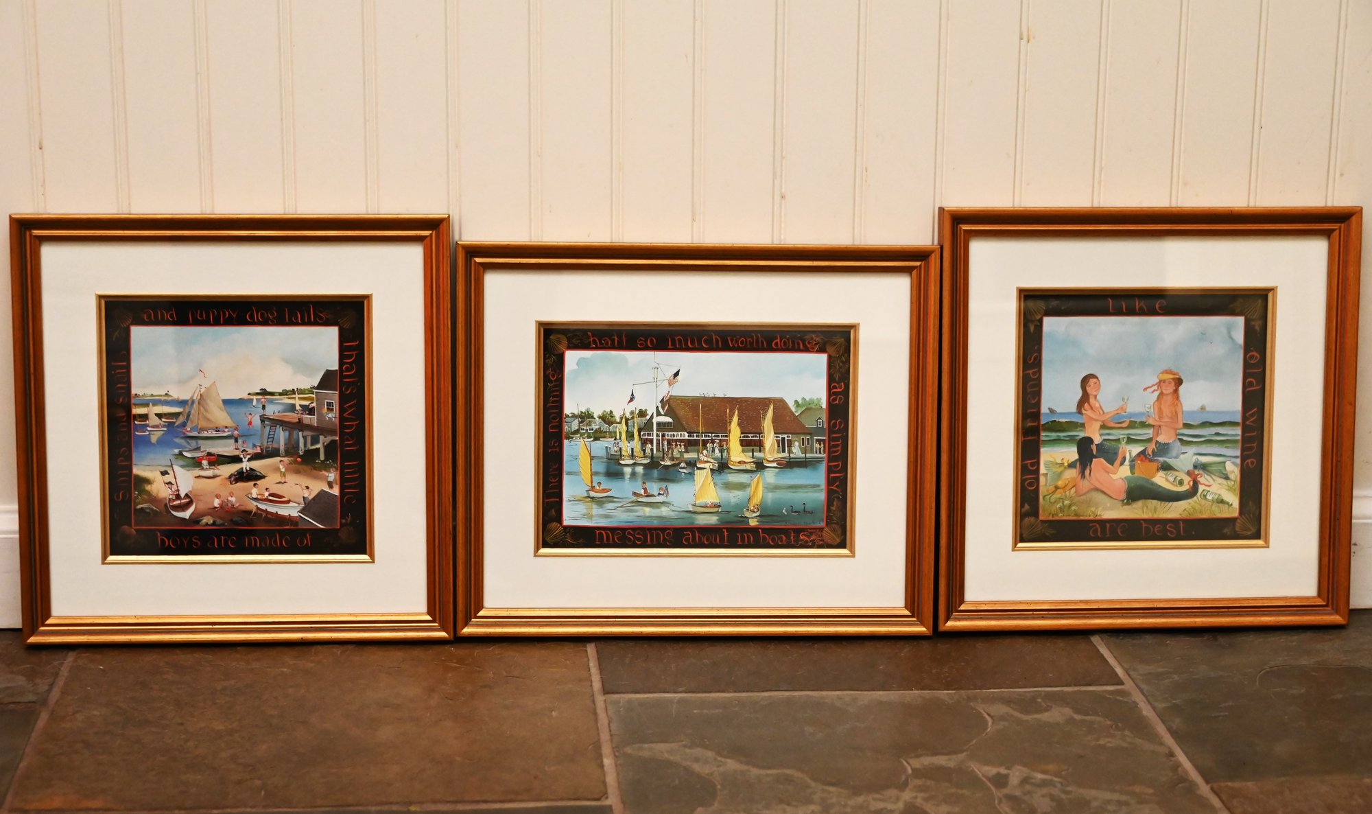 This is a set of three framed nautical and beach-themed prints, each with a folk art aesthetic. The frames are finished in a warm-toned wood with gold accents, adding an elegant touch to the artwork. Each print is double-matted with a white inner mat and a darker border surrounding the central image. The artwork features maritime and coastal scenes, including sailboats, a waterfront clubhouse, and a beach setting with figures. Around the darker borders, there are decorative inscriptions in a whimsical, hand-painted style, adding a narrative or sentimental touch to each piece.