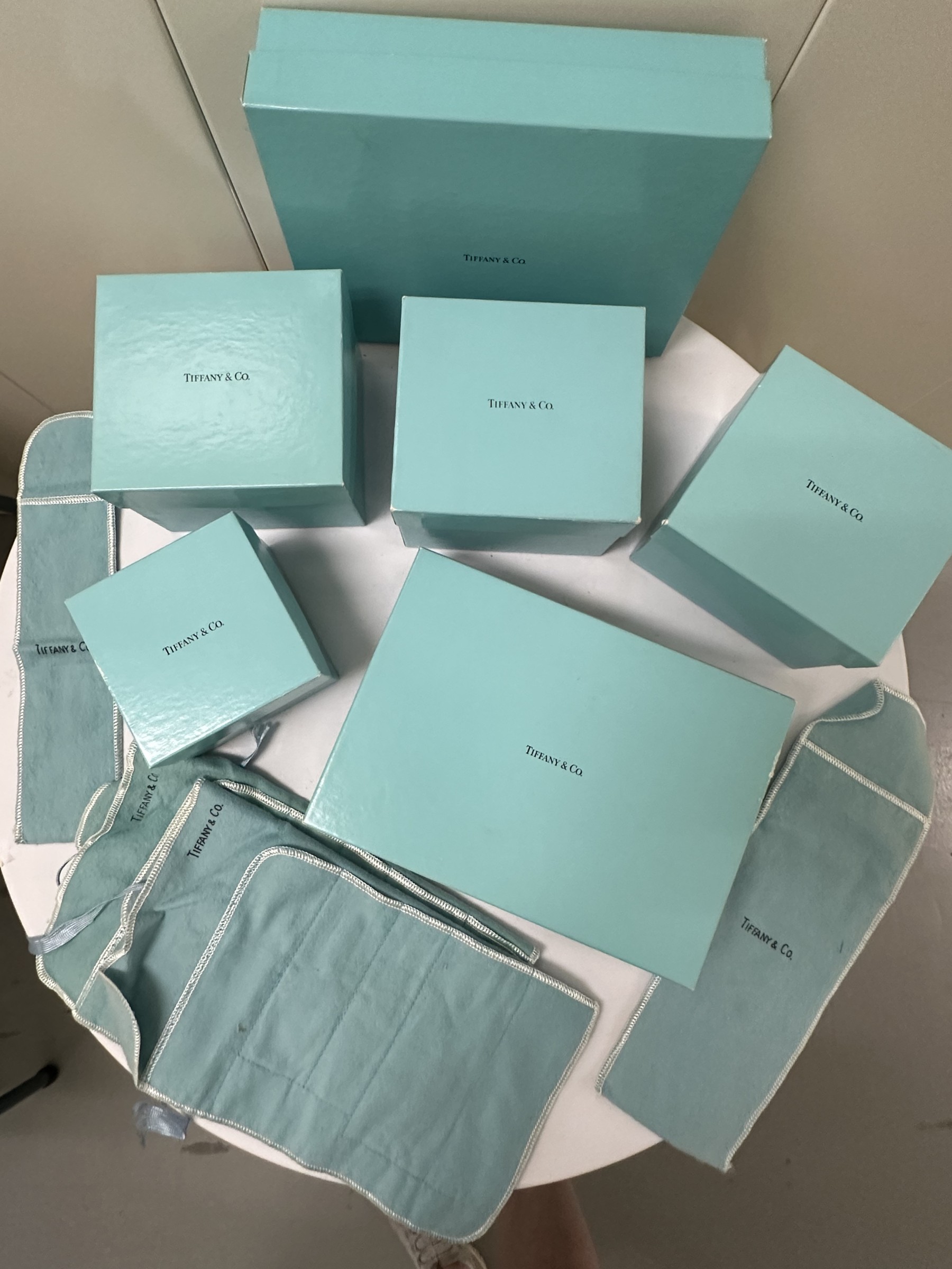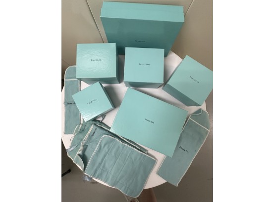 6 Boxes, 4 Tiffany boxes with felt holders, 1 large felt bag, some wear