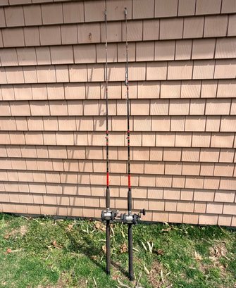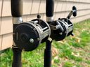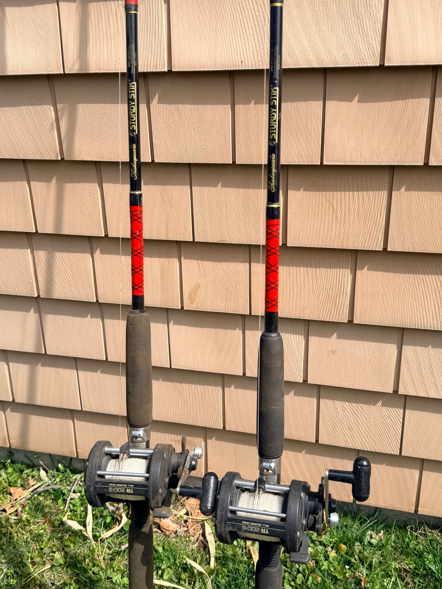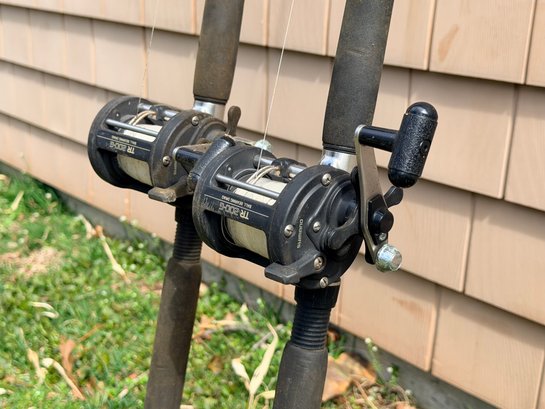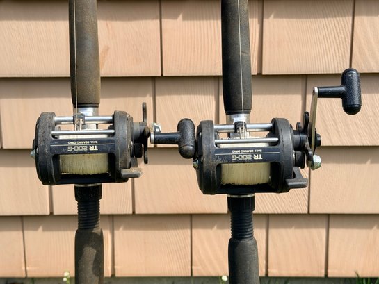 Matched pair of Shakespeare Sturdy Stik fishing rods fitted with Shimano TR200G ball bearing conventional reels, featuring black rods with red wrap accents, foam grips, and metal reel seats, each reel spooled with line and designed for trolling or general saltwater fishing, offering a durable and functional setup for offshore or heavy-duty use.