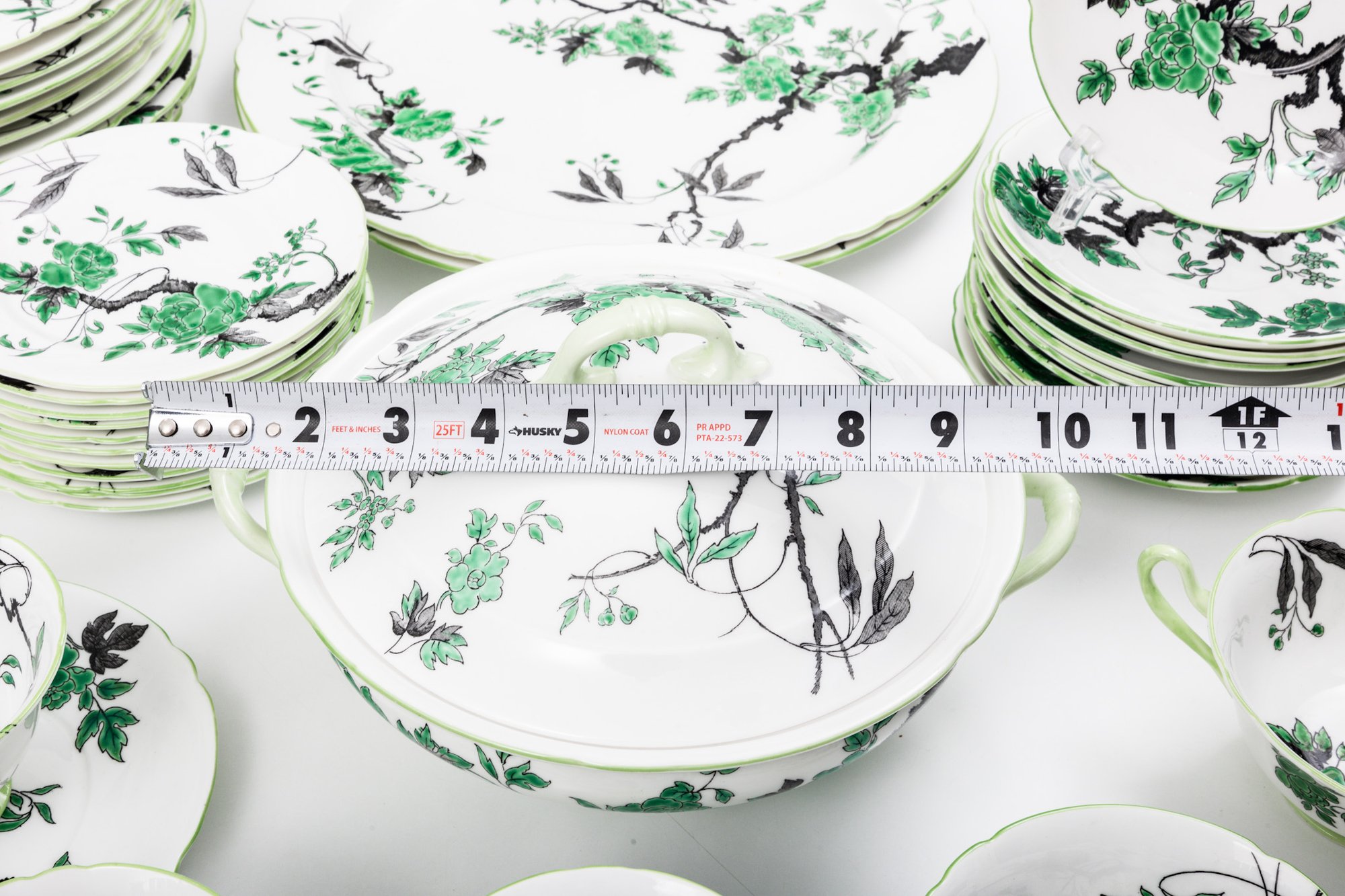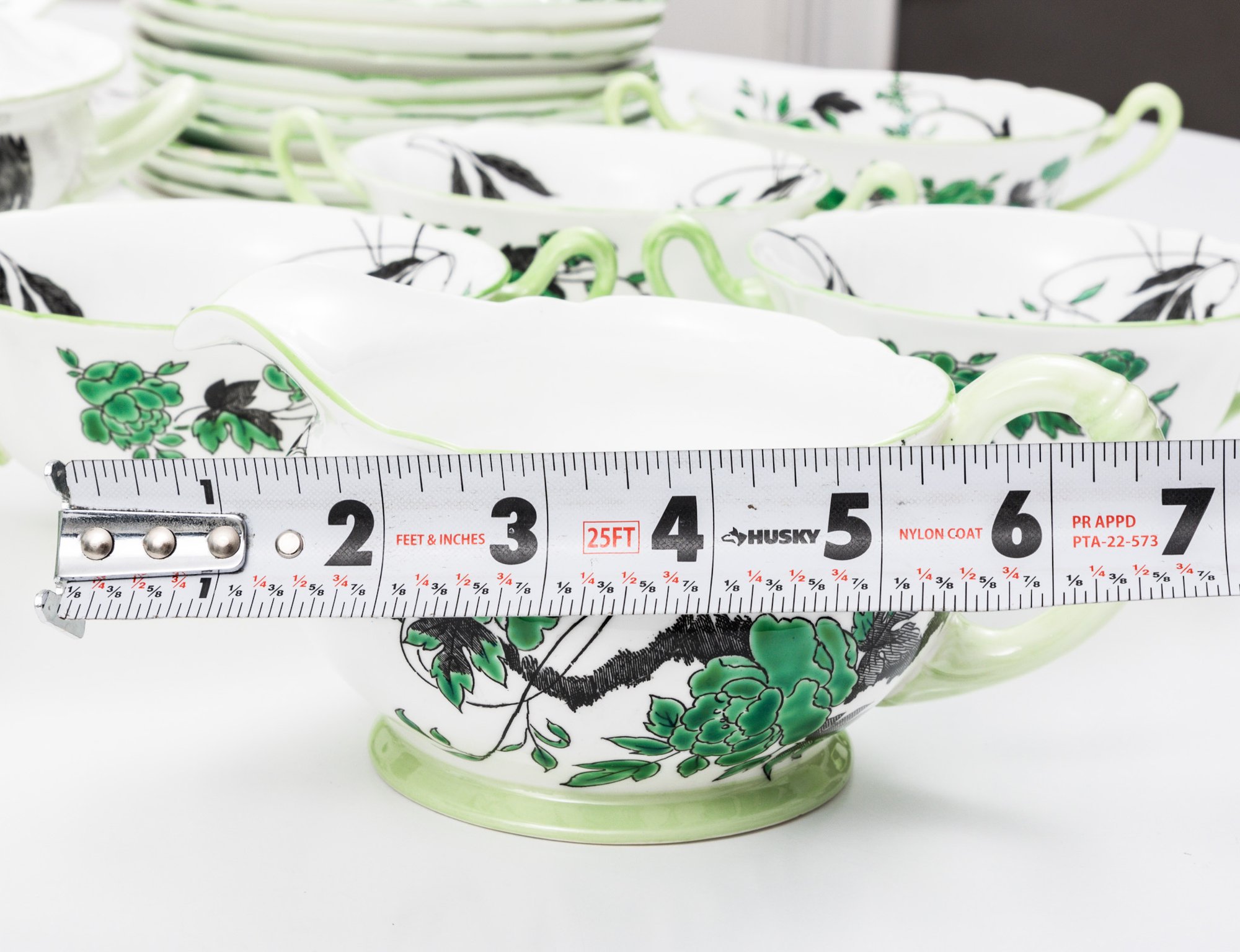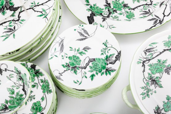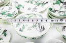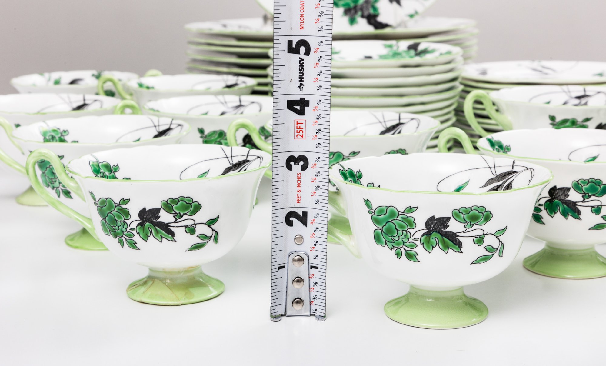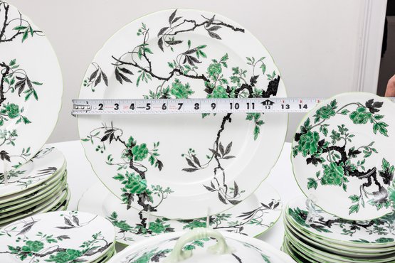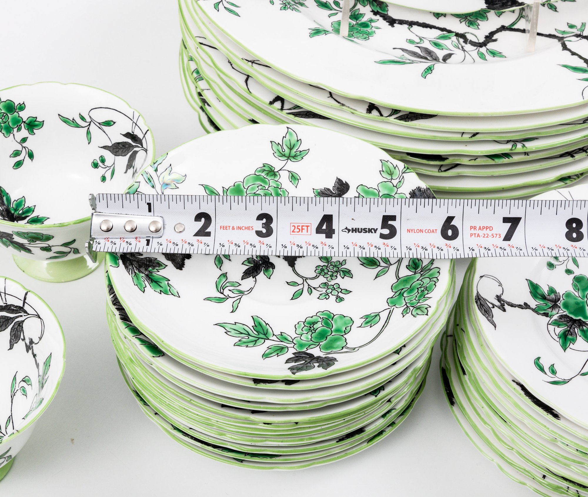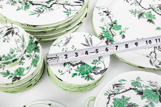 12 dinner, 12 saucers 12 salad, 12 cups, 1 tureen, 2 large plates, 5 soup, 1 creamer