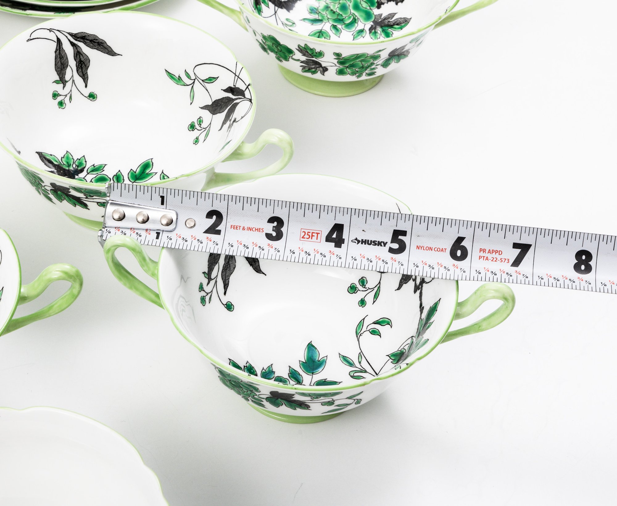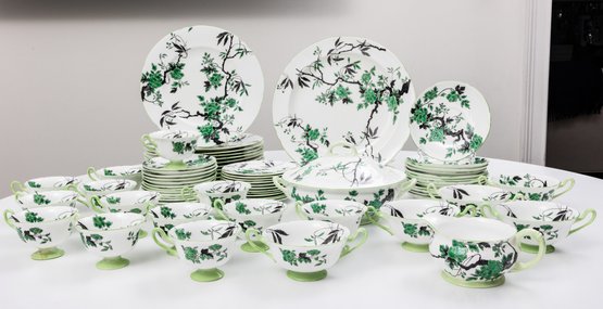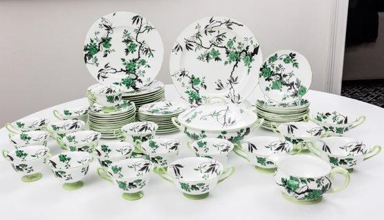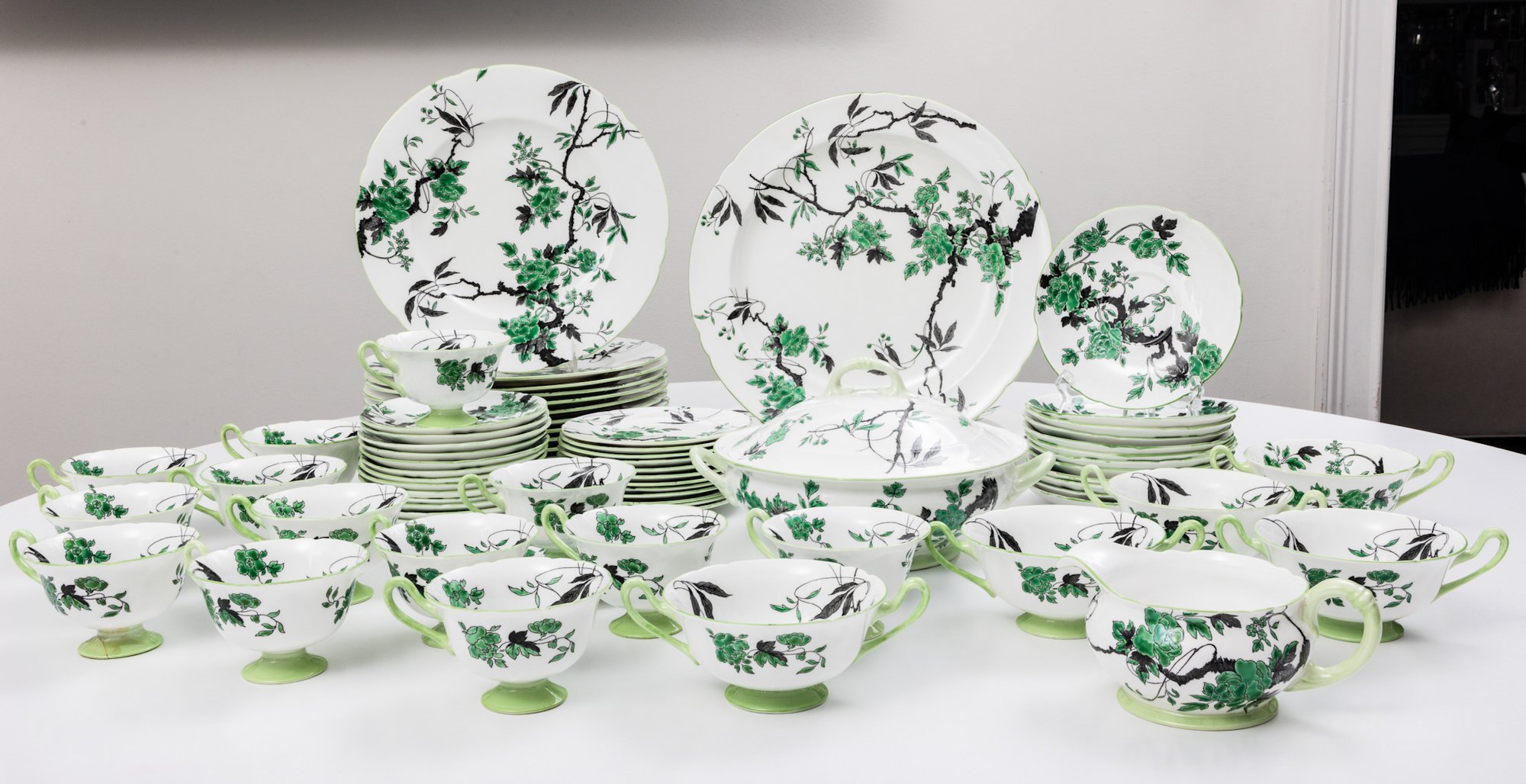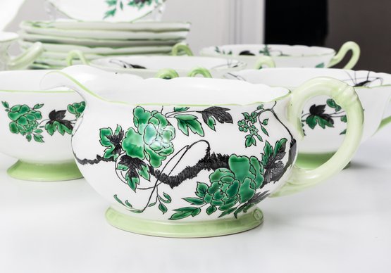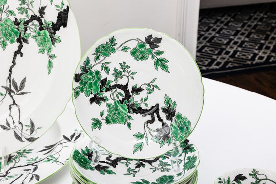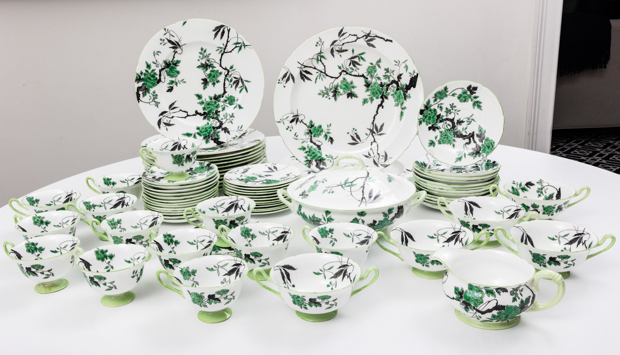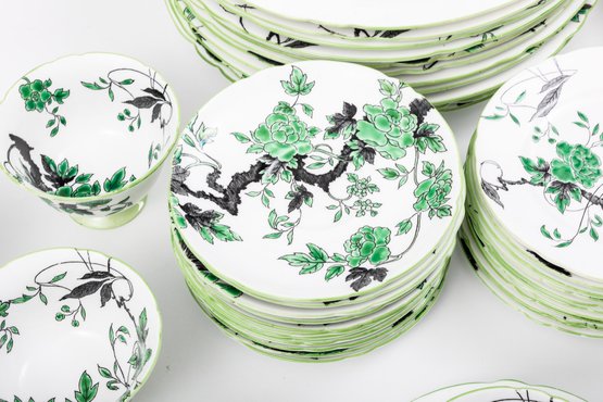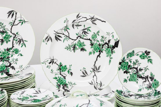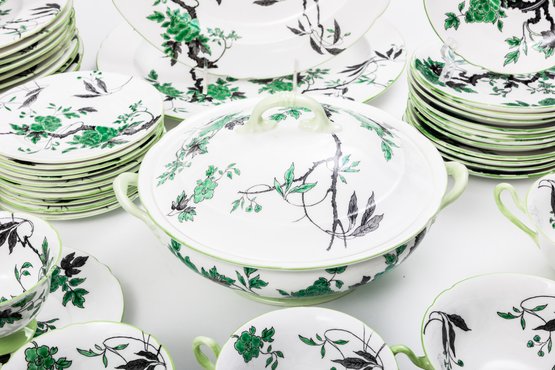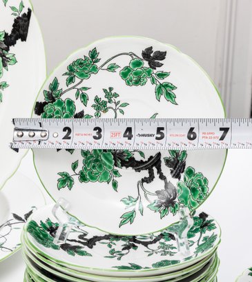 12 dinner, 12 saucers 12 salad, 12 cups, 1 tureen, 2 large plates, 5 soup, 1 creamer