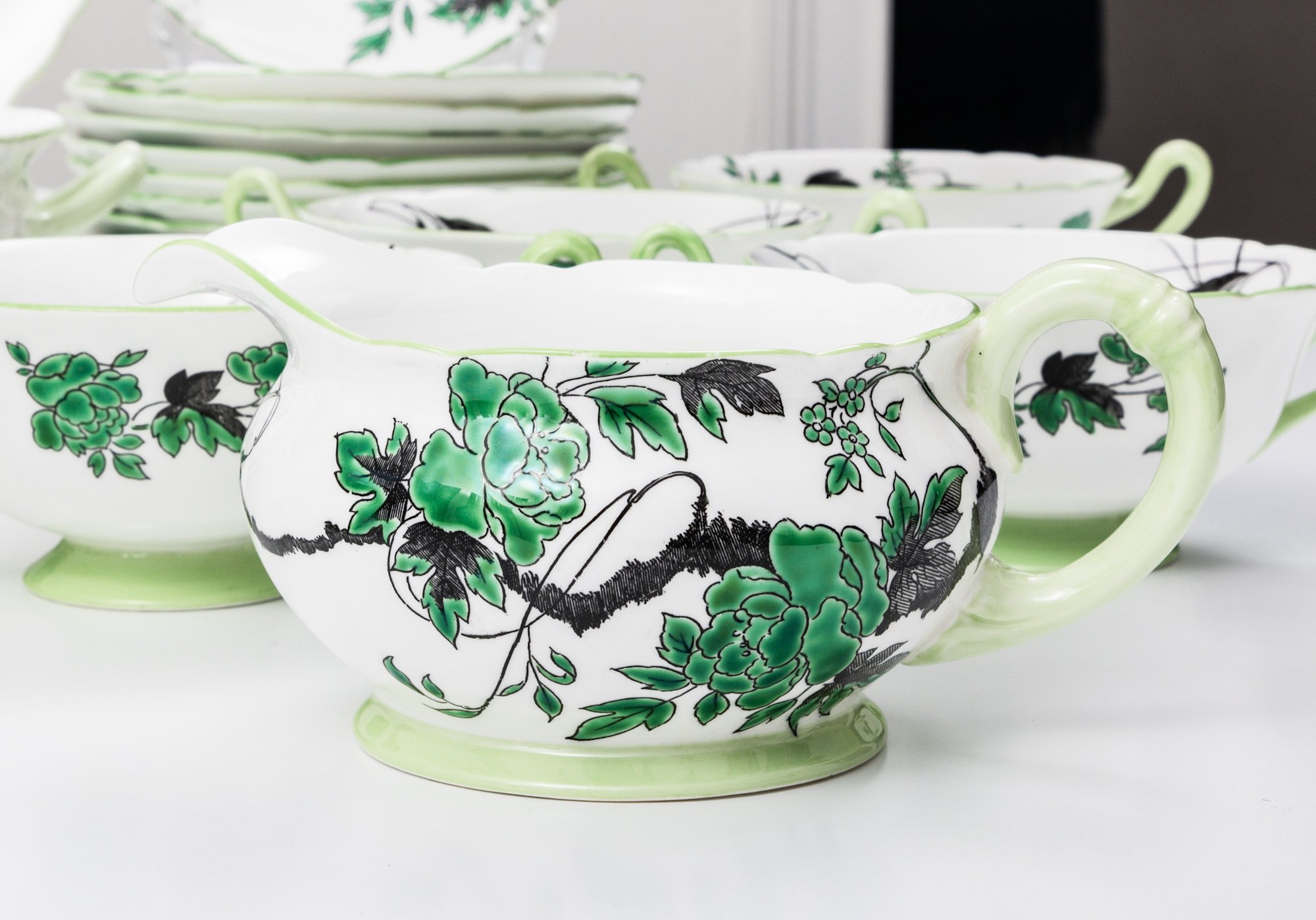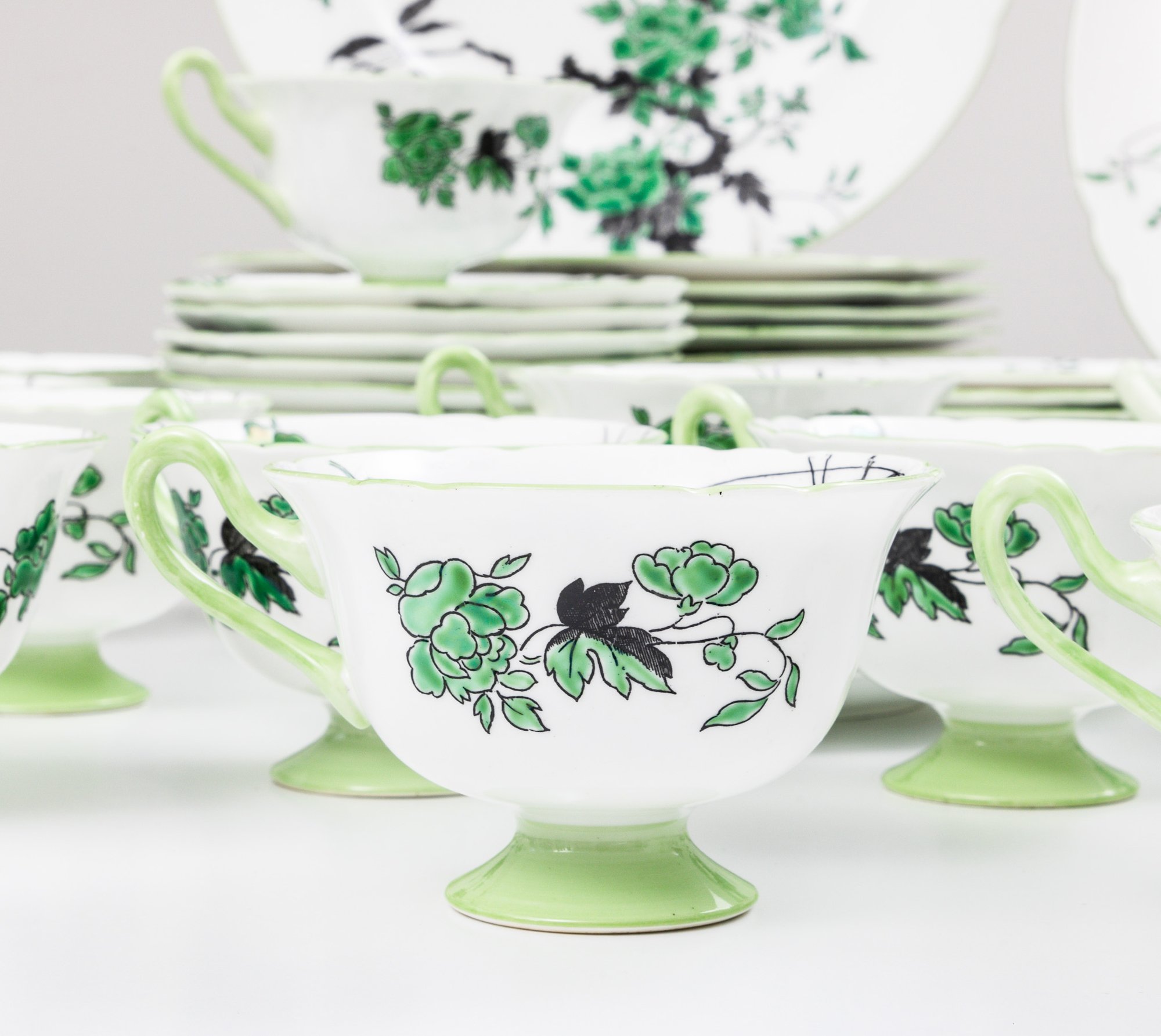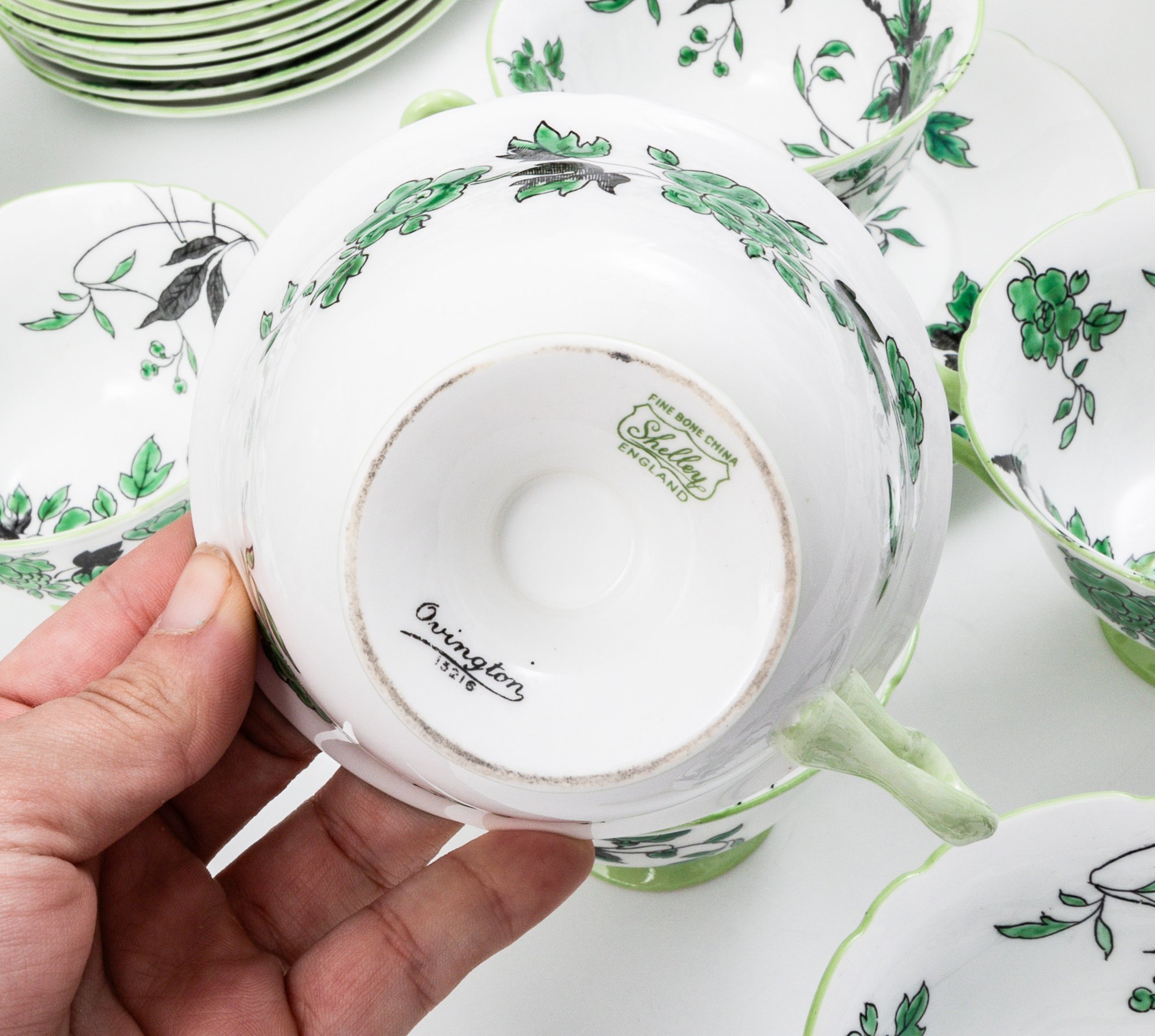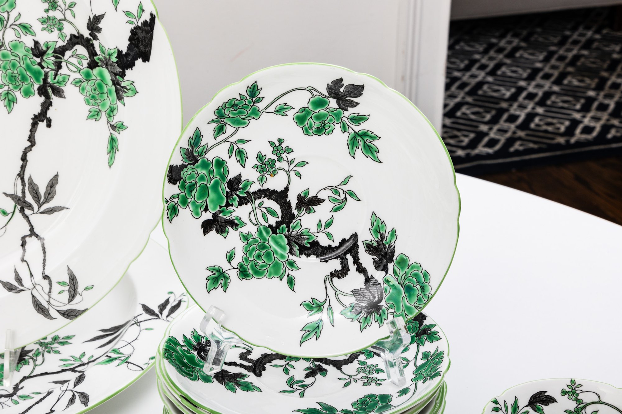 12 dinner, 12 saucers 12 salad, 12 cups, 1 tureen, 2 large plates, 5 soup, 1 creamer