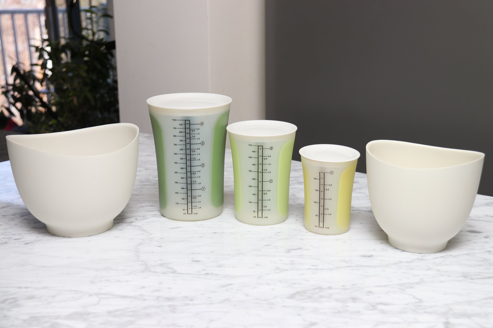 Set of 2 pinch-able bowls for easy pouring and three soft measuring beakers