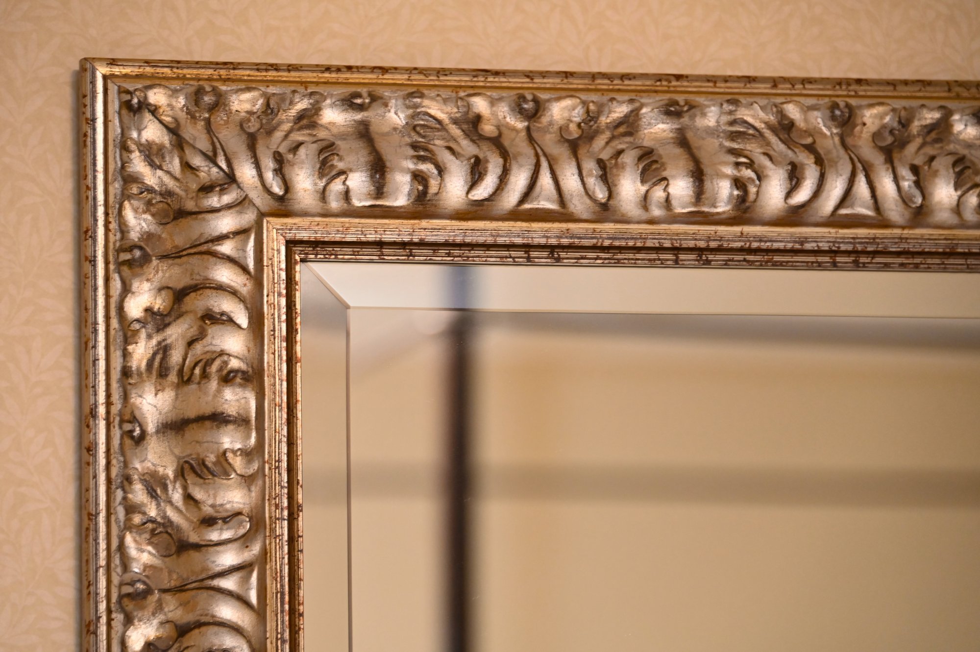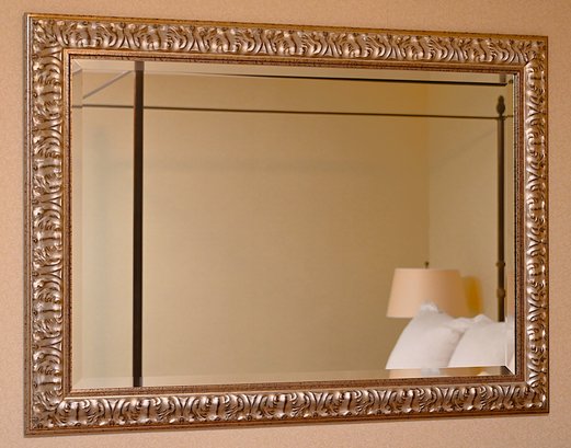This elegant rectangular mirror features an ornate, intricately carved frame finished in a soft antiqued silver tone. The detailed scrollwork along the border adds a touch of classical refinement, making it a sophisticated accent for any space. A beveled edge enhances the mirror’s depth and dimension, contributing to its luxurious appeal.