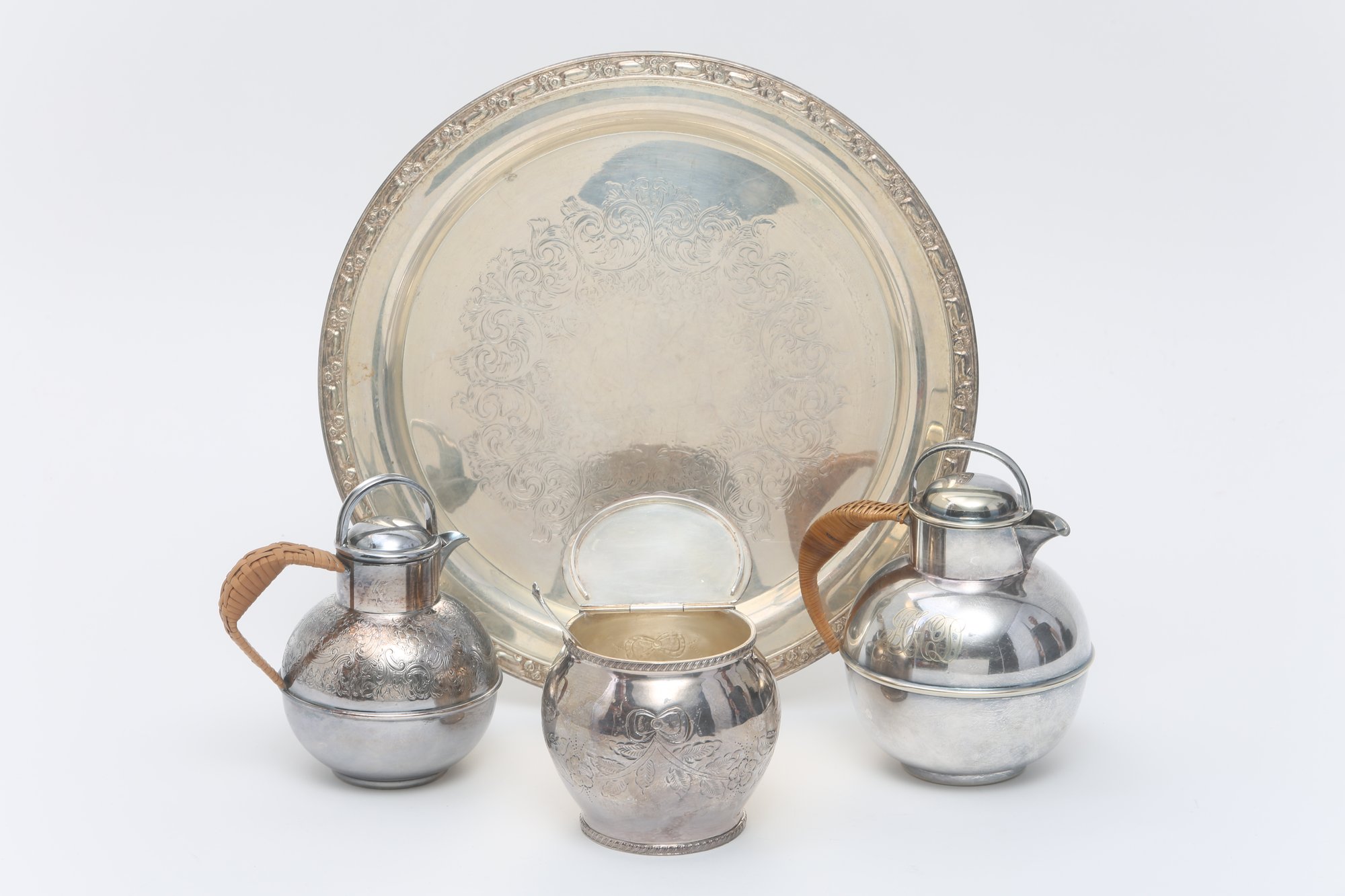 two bachelors tea pots with rattan handles including round platter, sugar dish and a sterling silver spoon