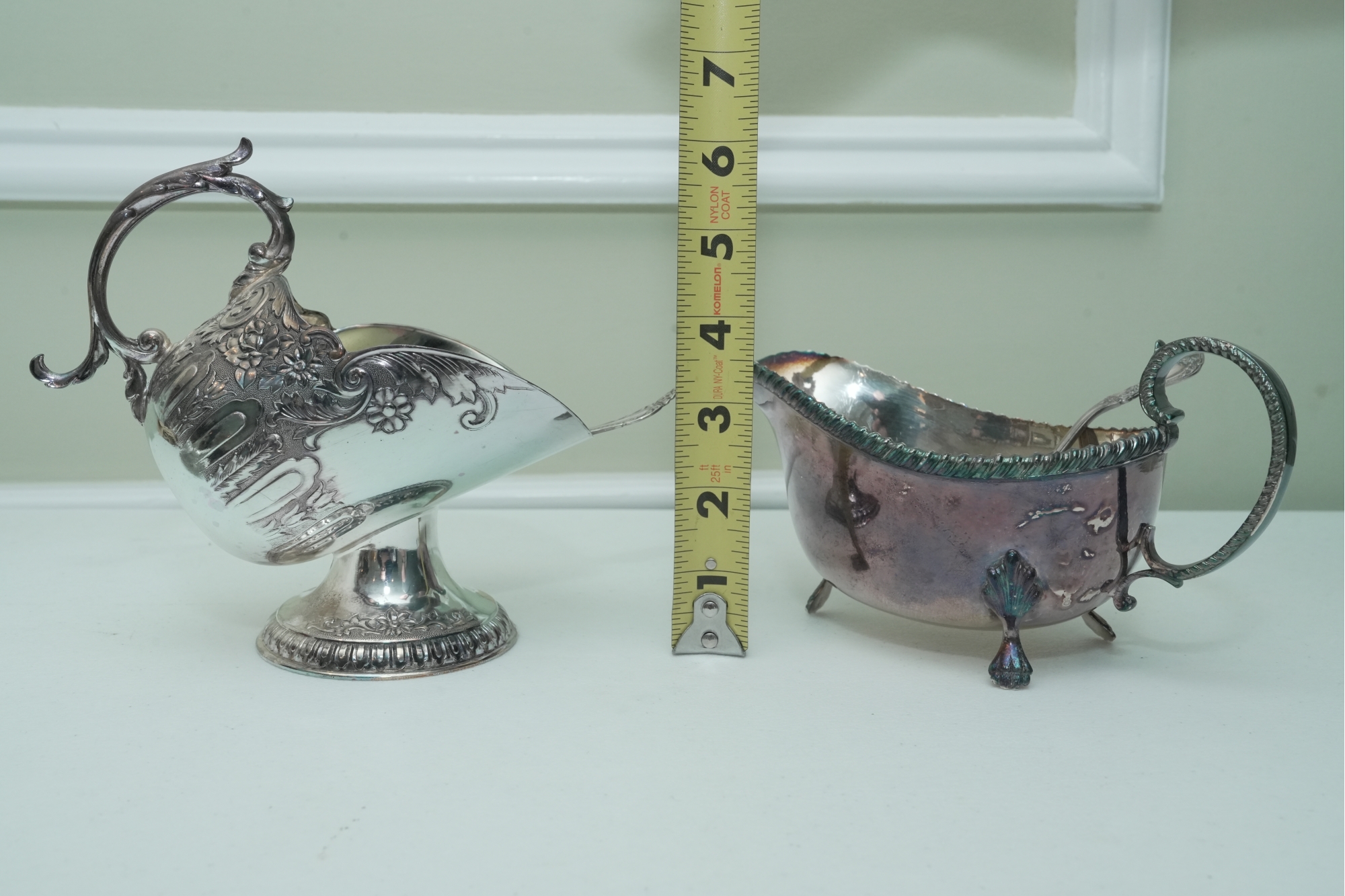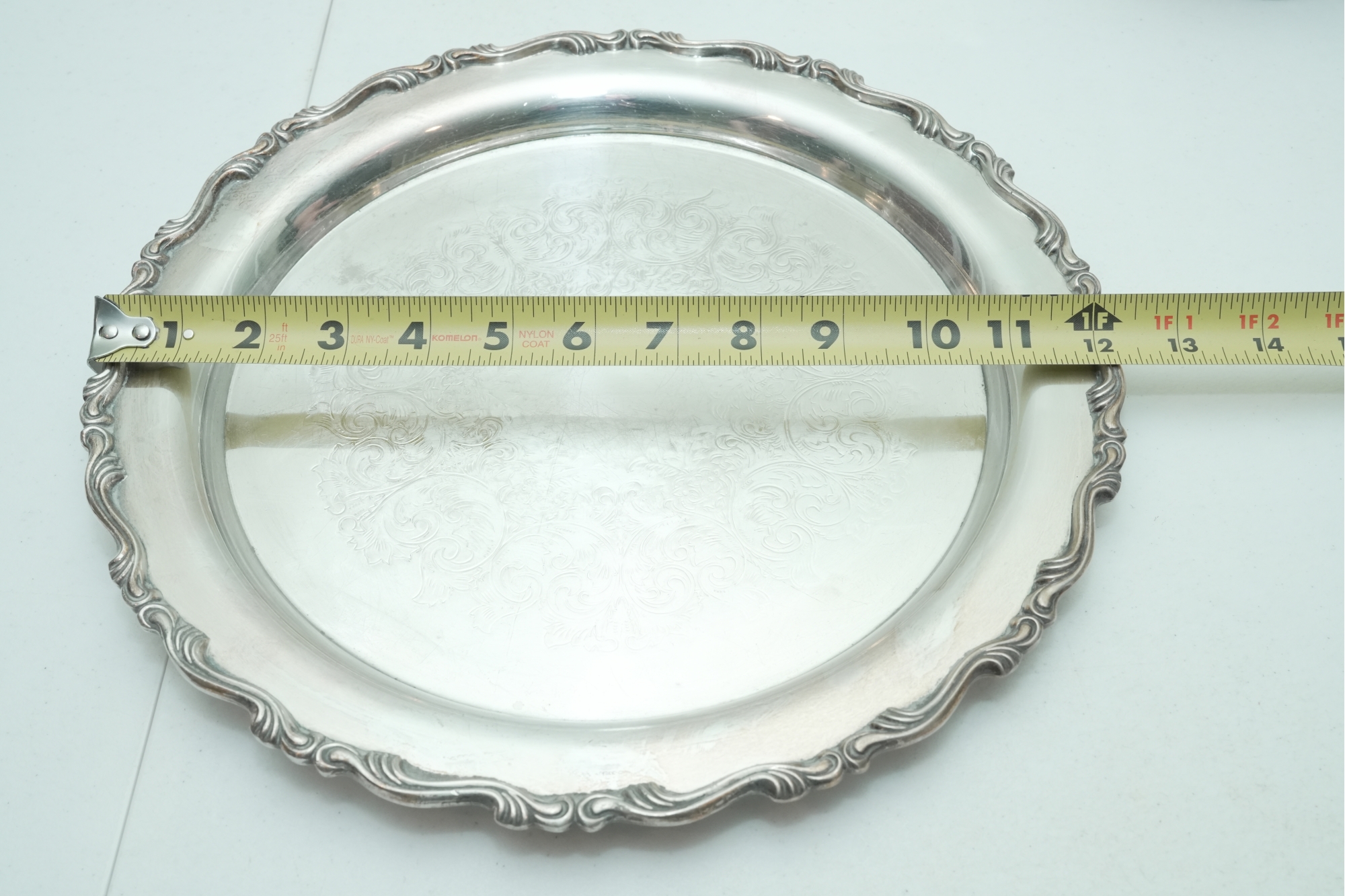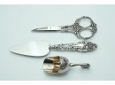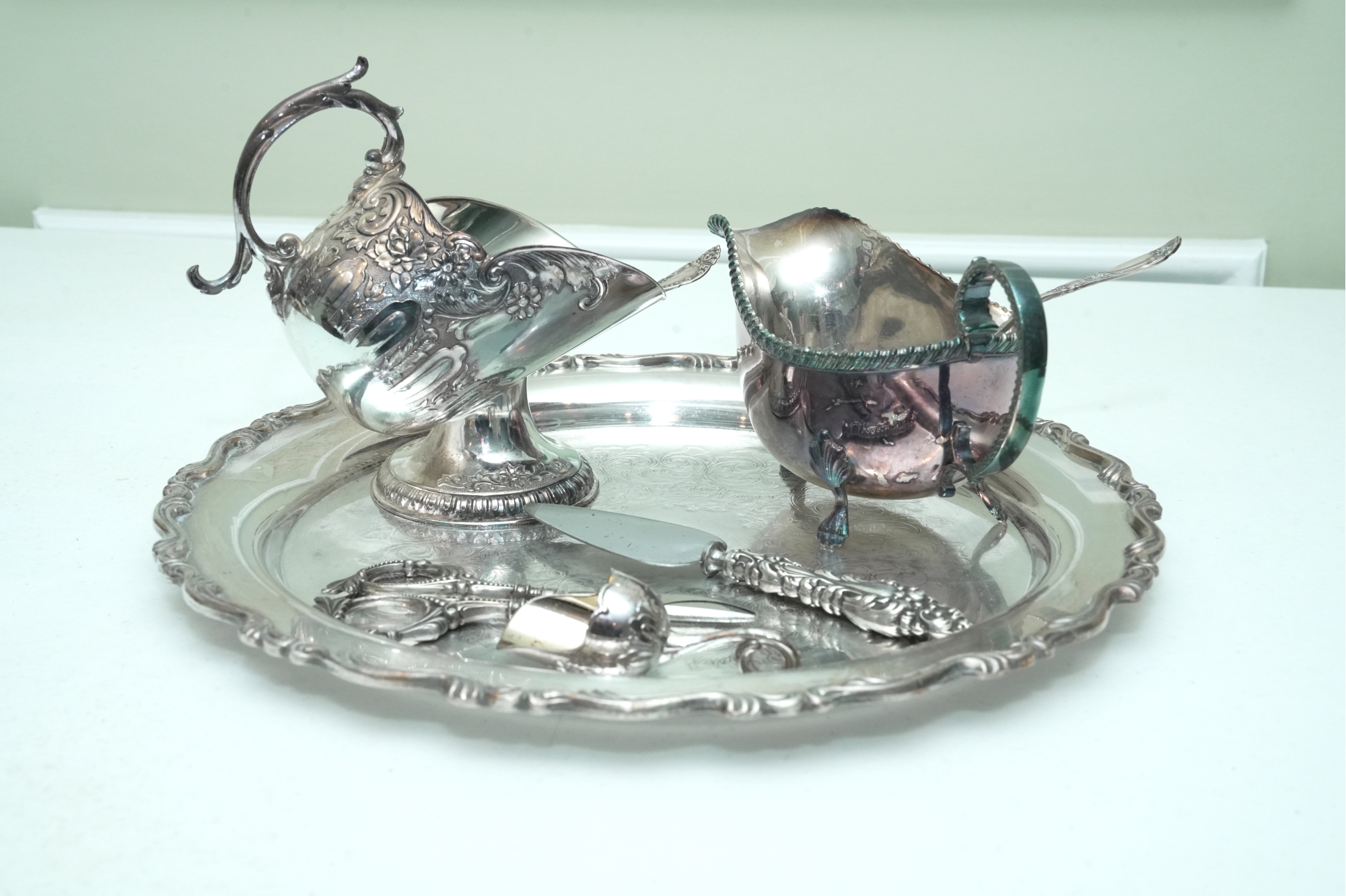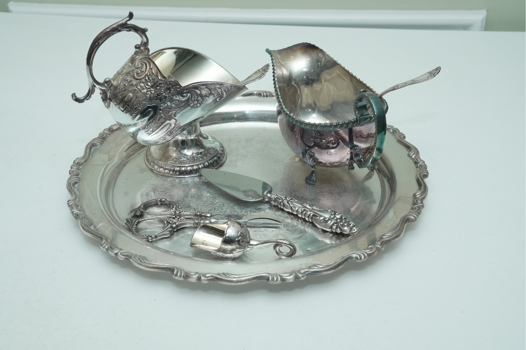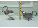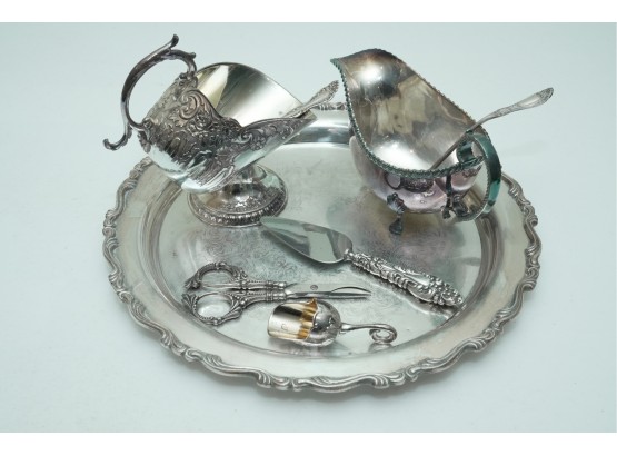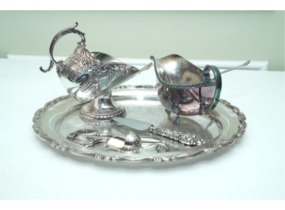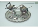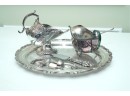 Silver Plated Serving Set With Tray, Ornate Creamer, Sugar Bowl & Utensils