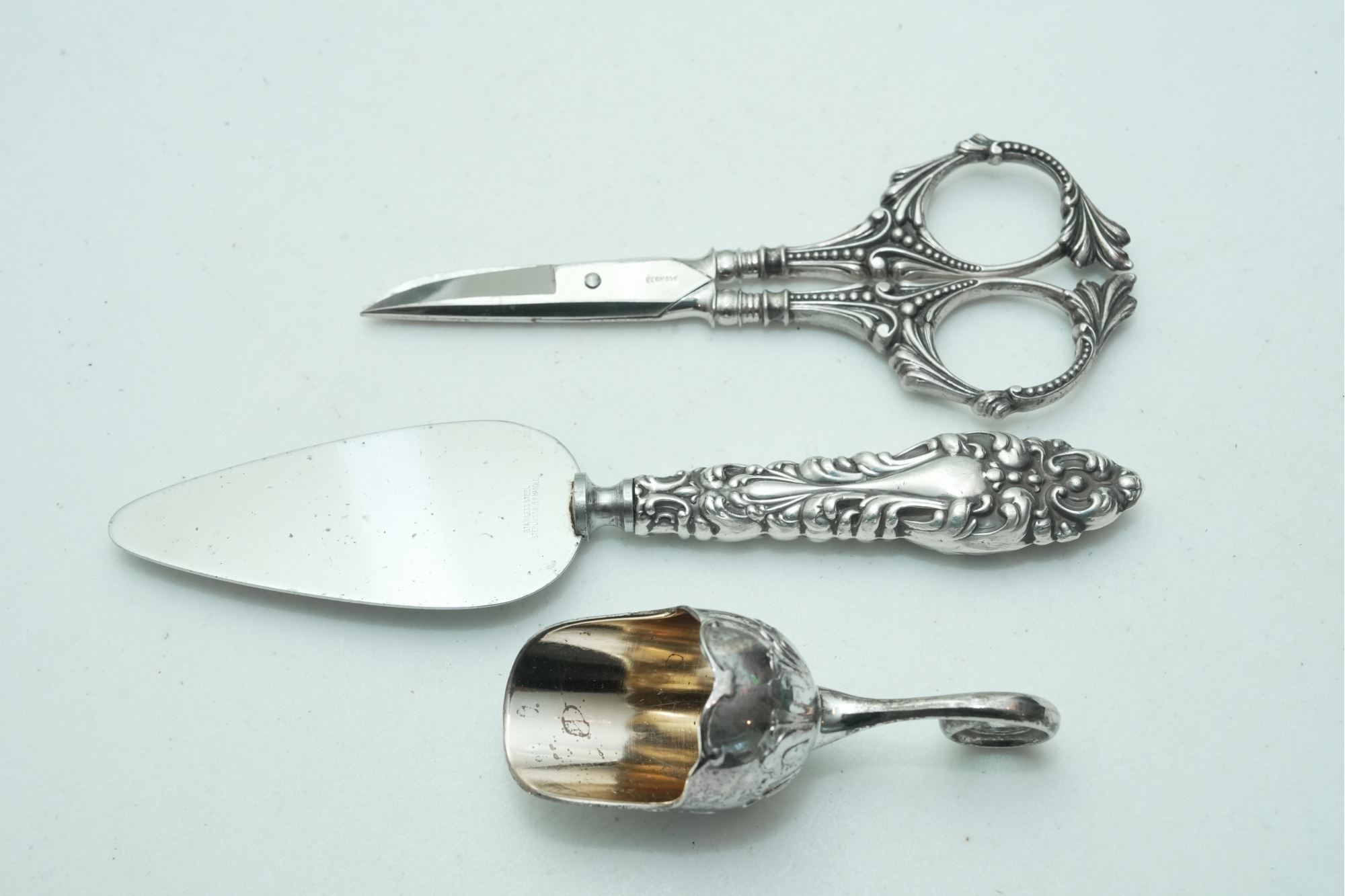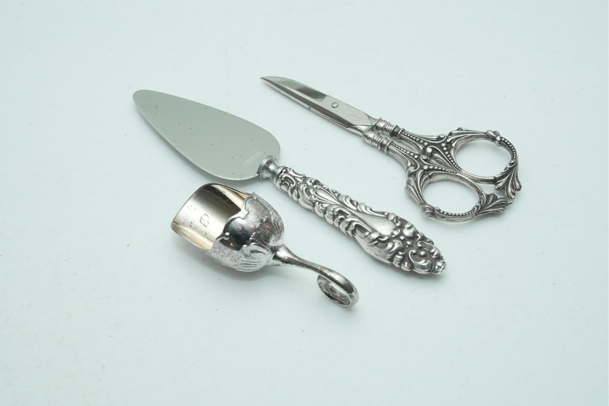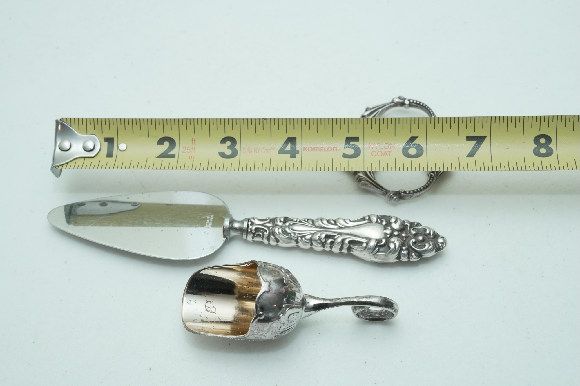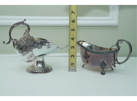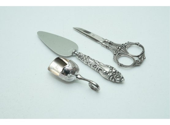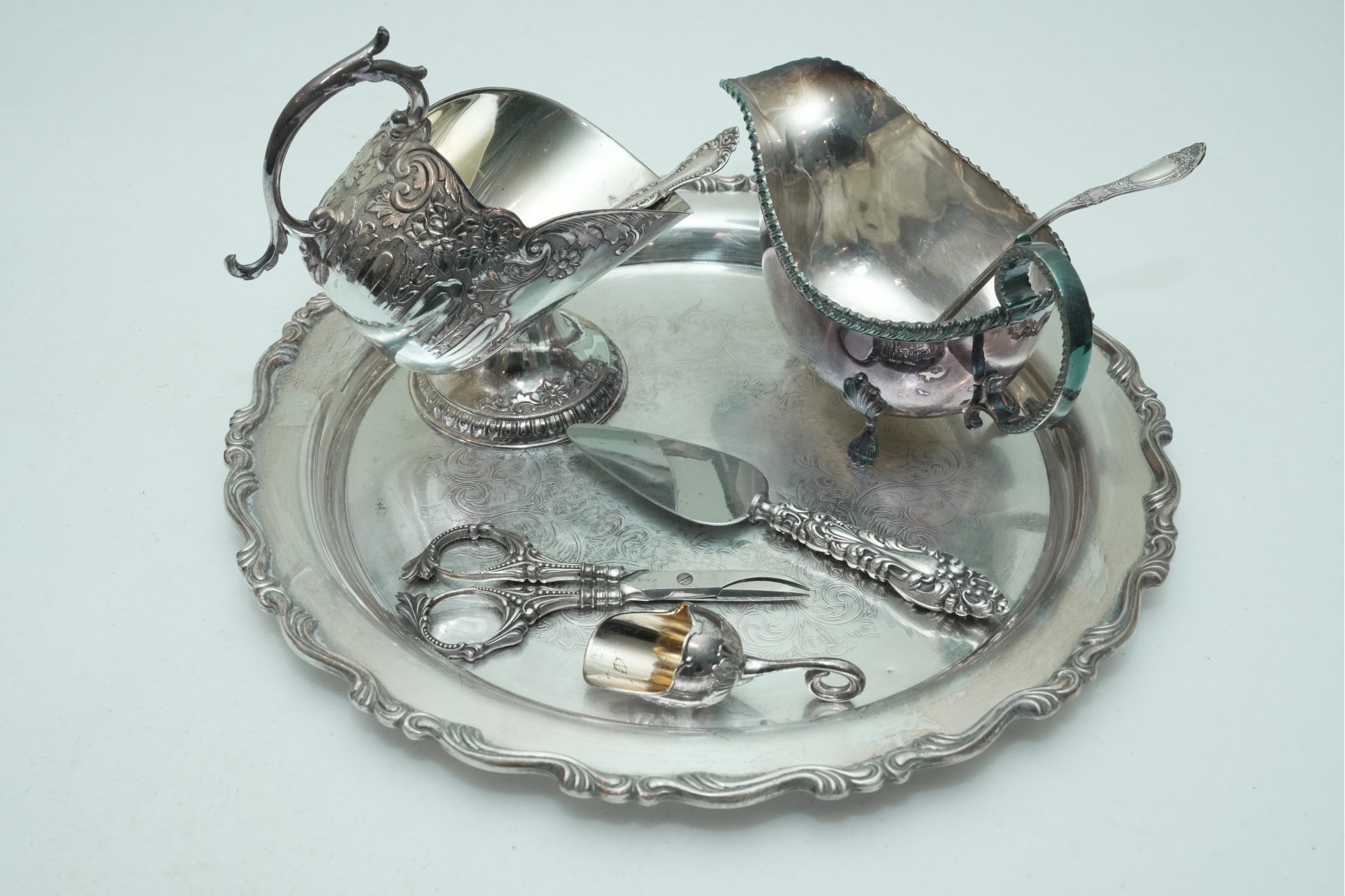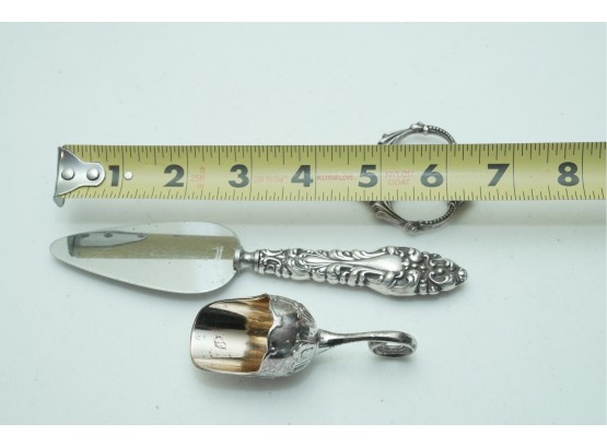 Silver Plated Serving Set With Tray, Ornate Creamer, Sugar Bowl & Utensils