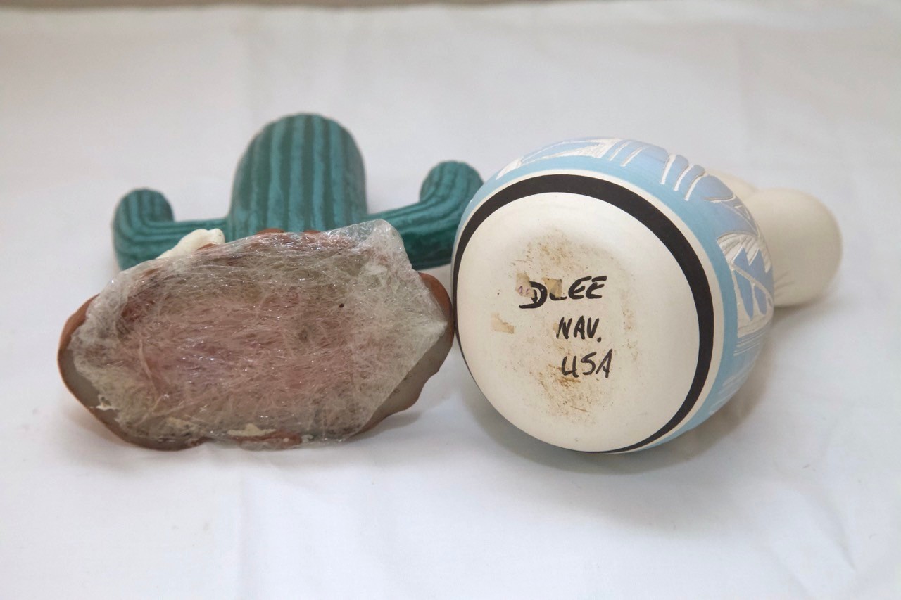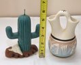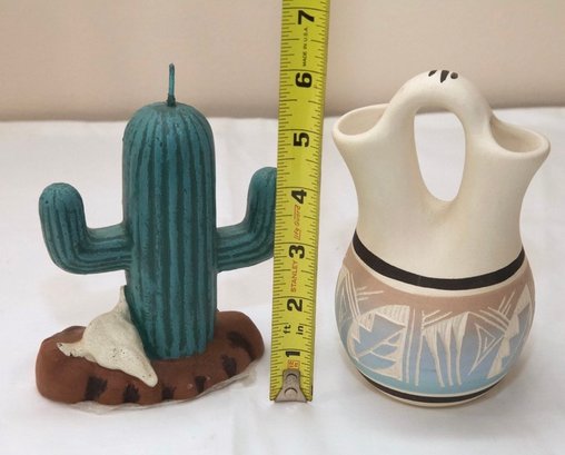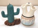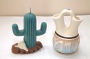 Southwestern Style Pottery Vase And Cactus Form Candle