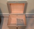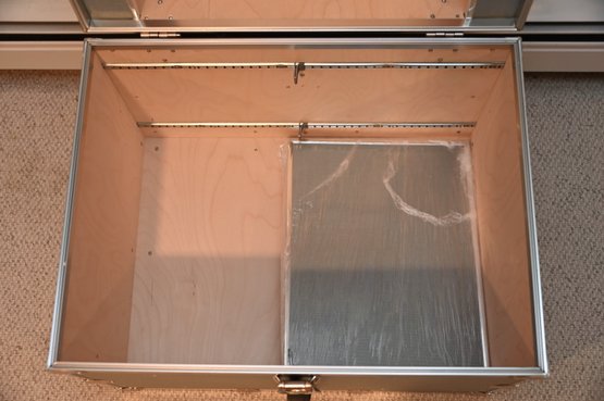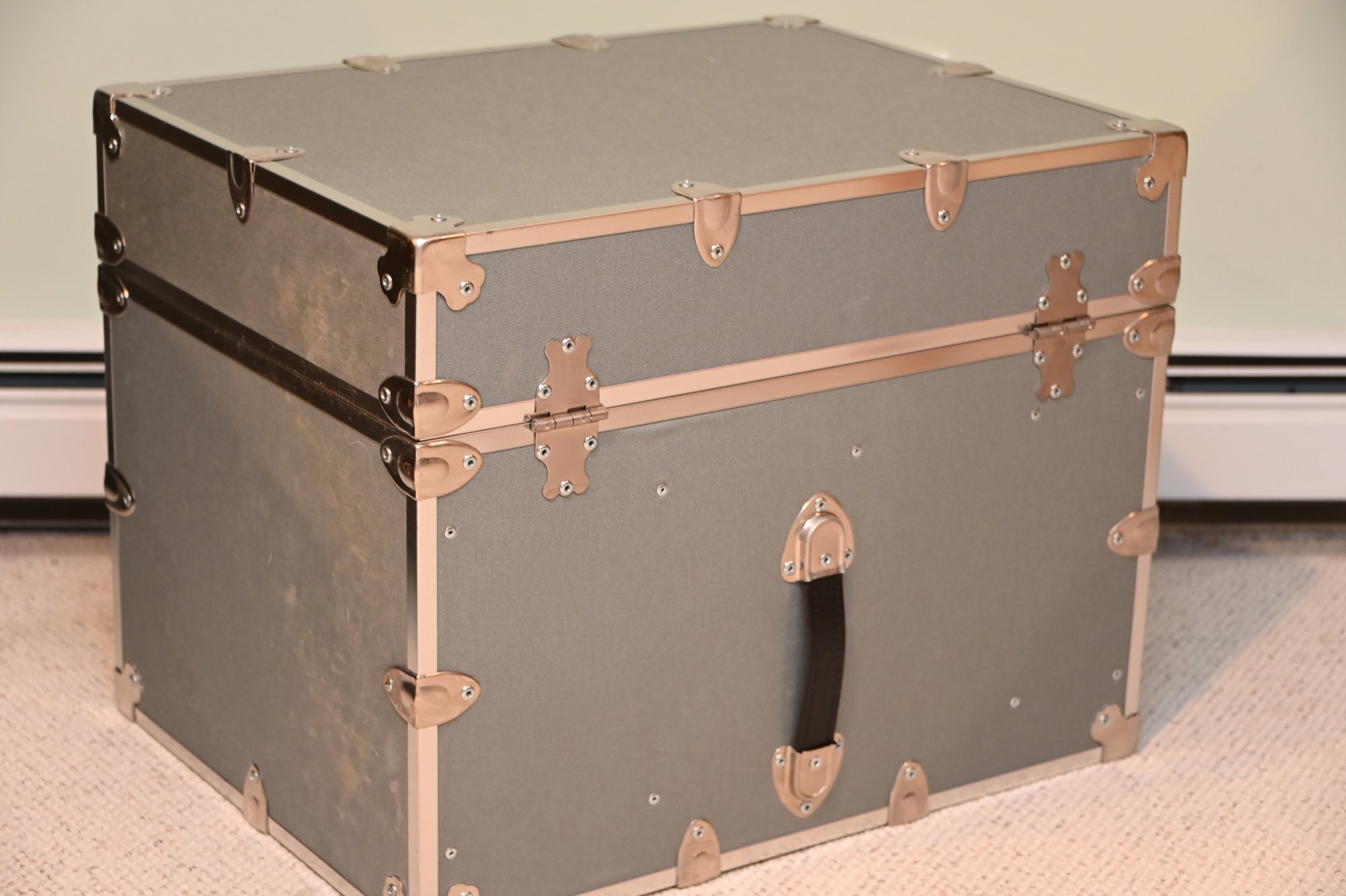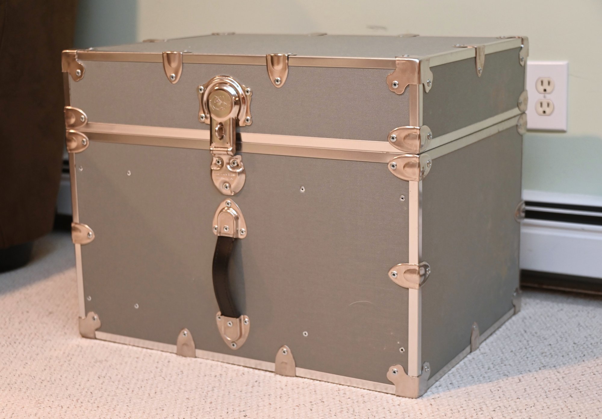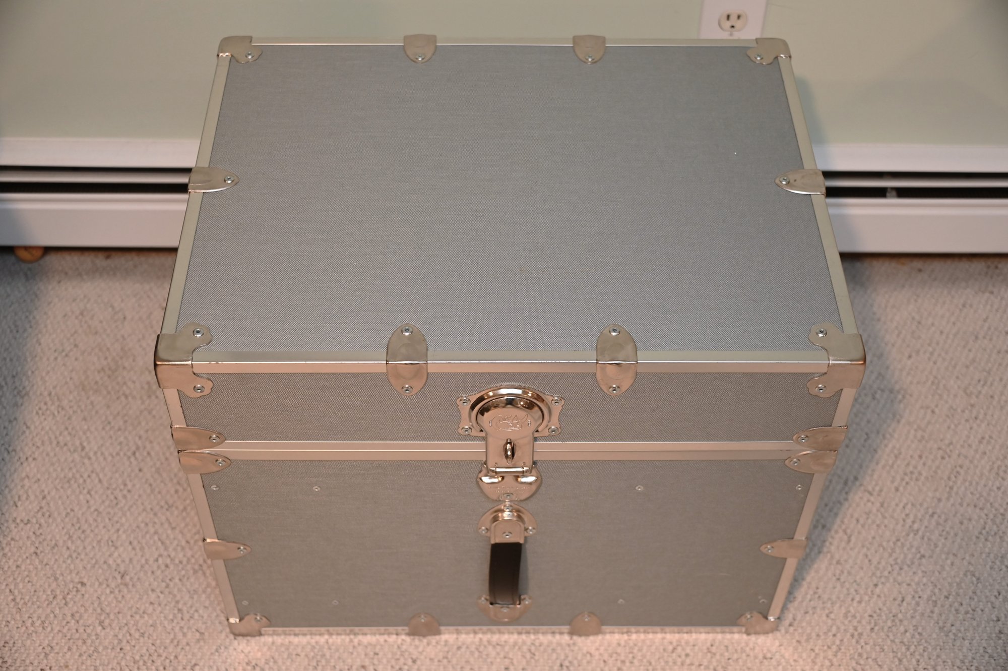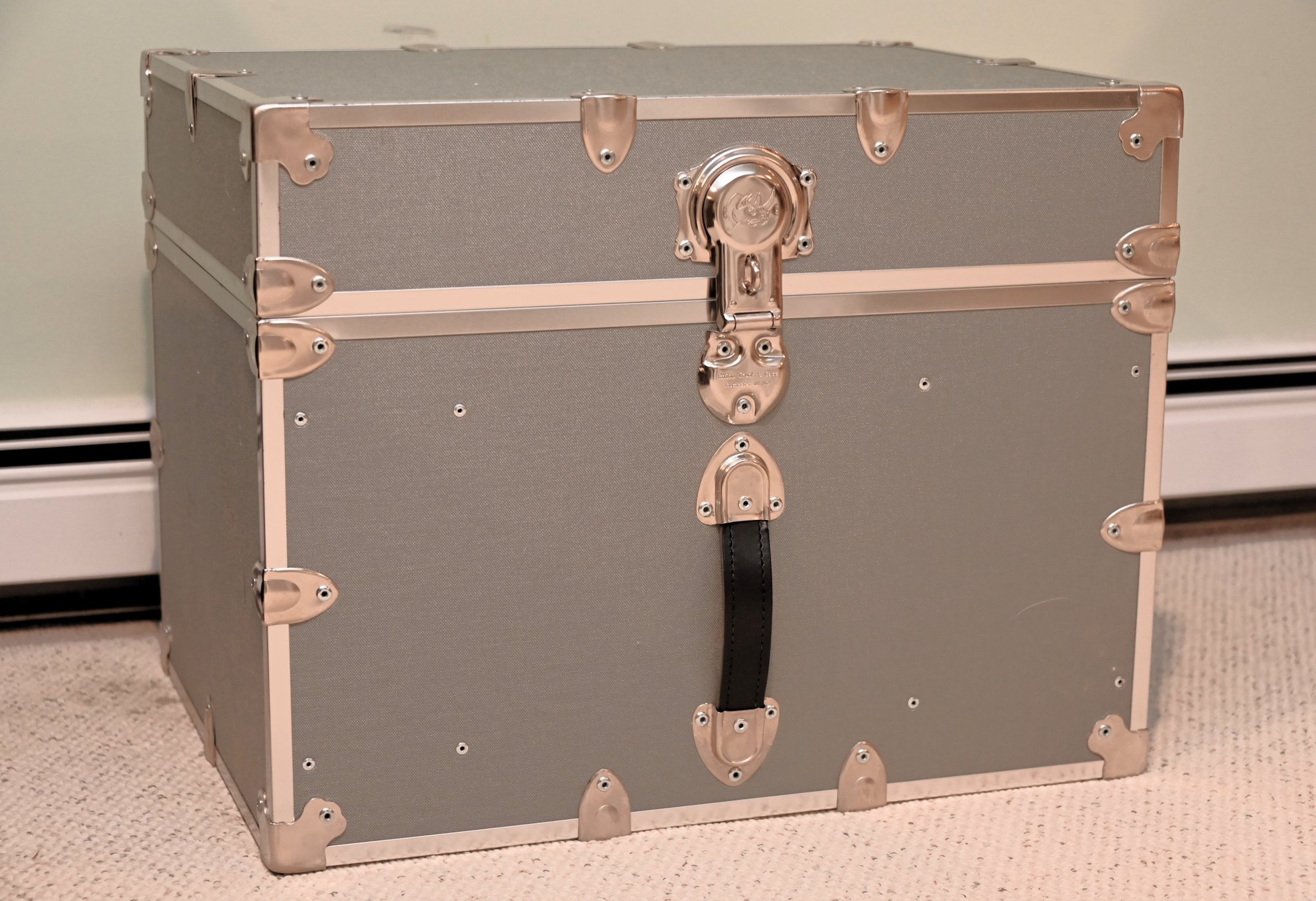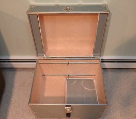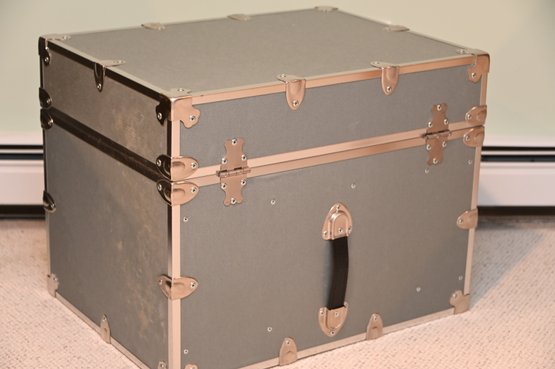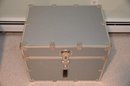 sturdy, vintage-style storage trunk with a silver/gray finish and chrome metal reinforcements on the edges and corners. The trunk has a large, decorative latch in the center with a circular emblem and additional hardware details. A black leather handle is attached below the latch with metal brackets, adding a functional and stylish element.