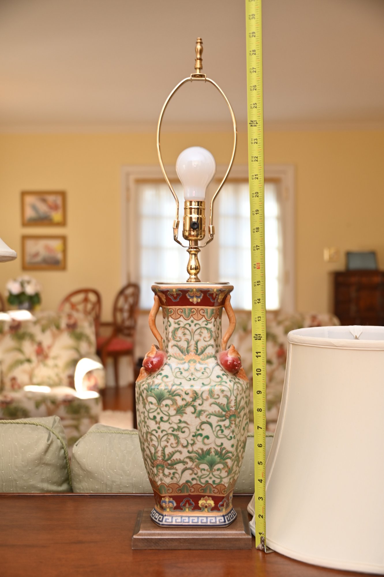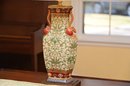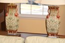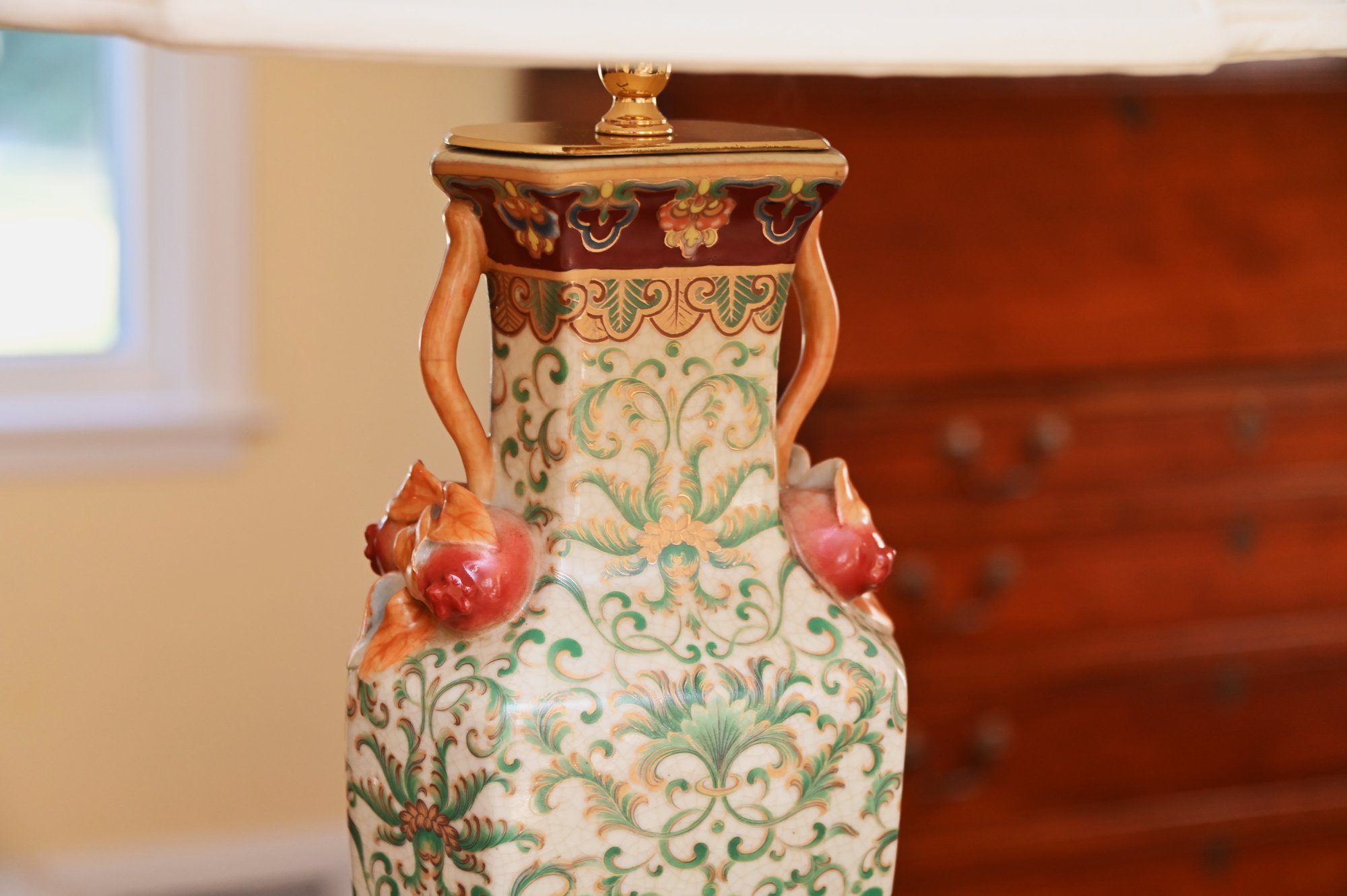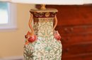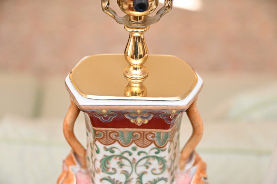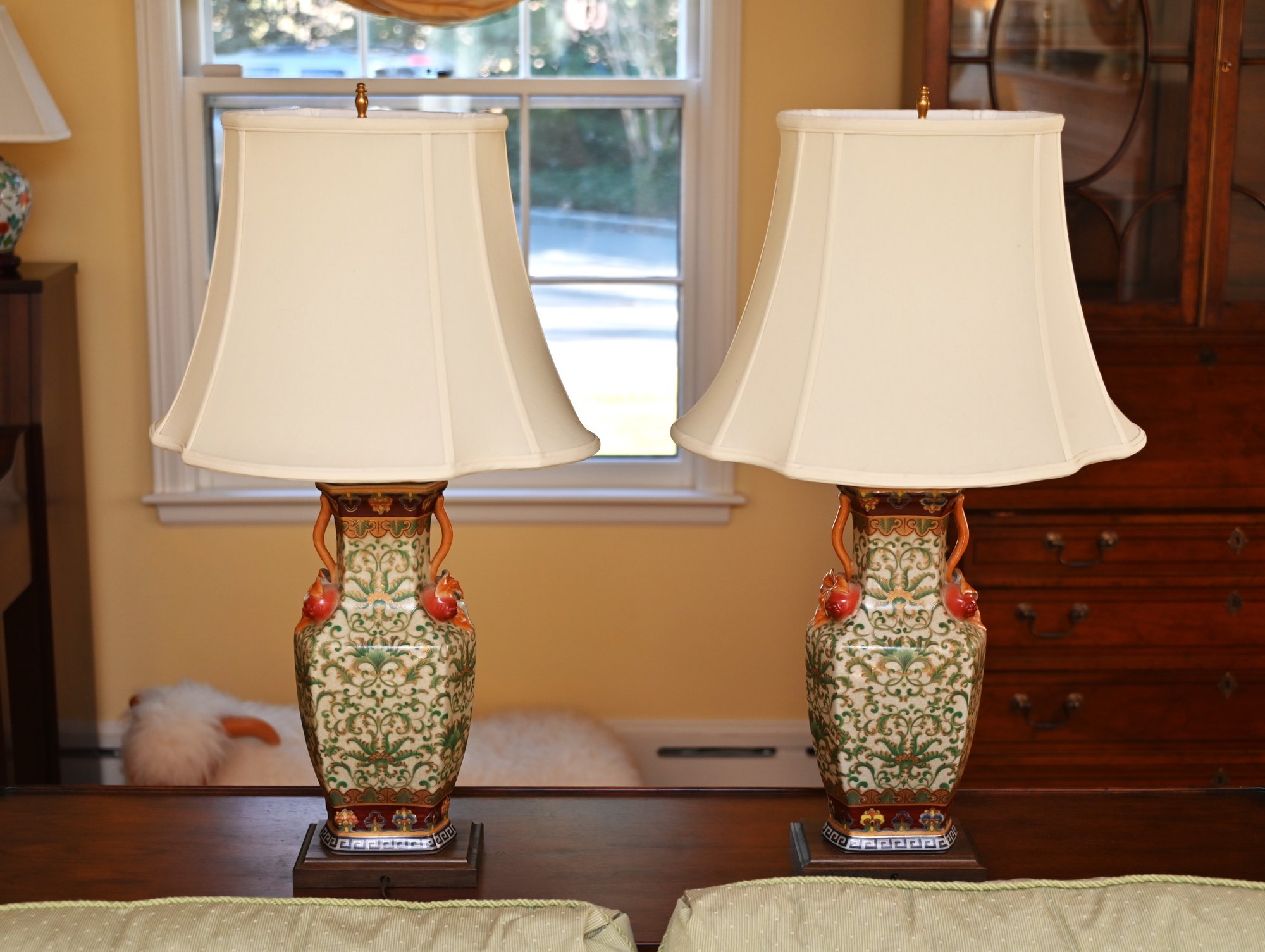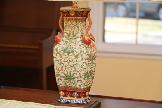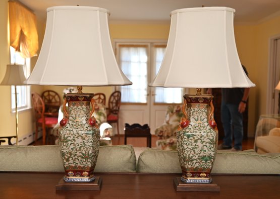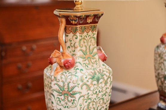 This is a stunning pair of antique-style porcelain lamps featuring an intricate and ornate design. The bases of the lamps are shaped like traditional Chinese vases with a square foundation, decorated with elaborate floral and scrollwork patterns in green and gold. The vases are accented with hand-painted details and have sculpted handles shaped like red mythical creatures, possibly stylized foo dogs or dragons, adding a unique and decorative touch.