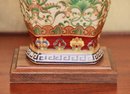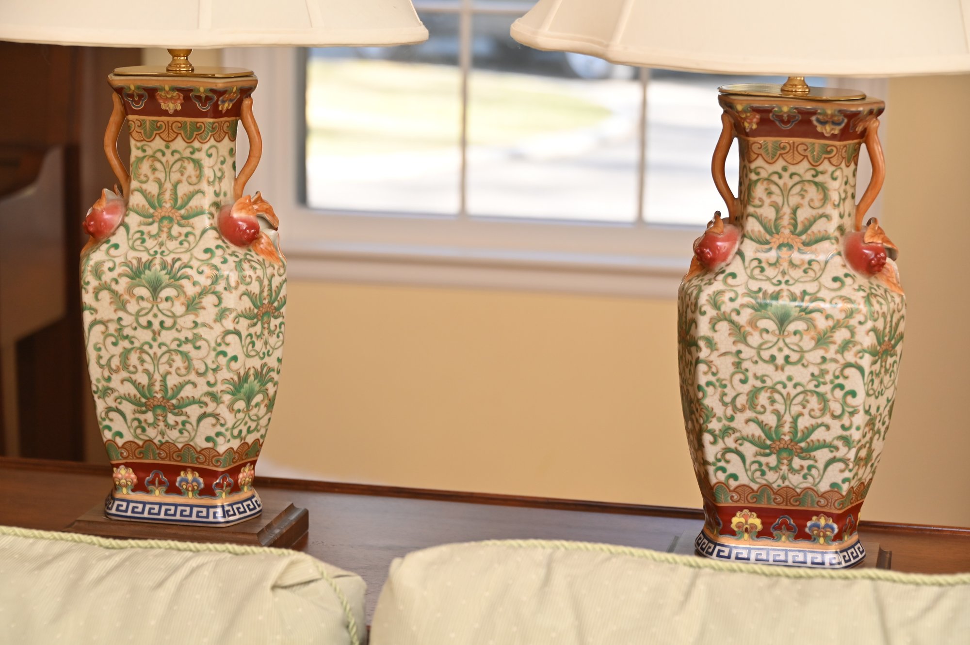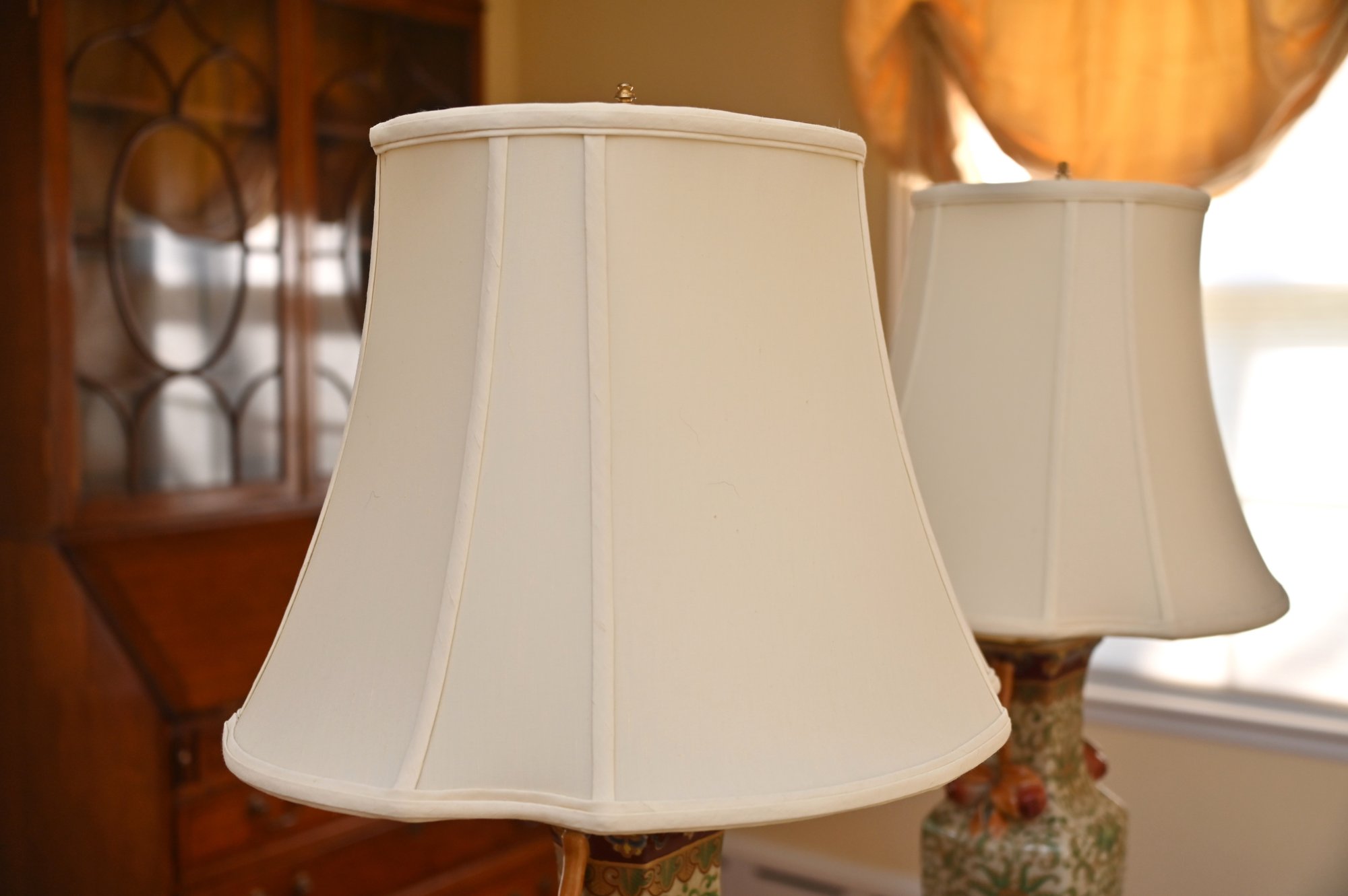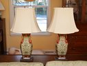 Each lamp is topped with a classic cream-colored bell-shaped fabric lampshade, which provides a soft and elegant contrast to the vibrant colors and intricate designs of the base. The lamps sit on wooden pedestal bases, which further enhance their sophisticated and traditional aesthetic.
